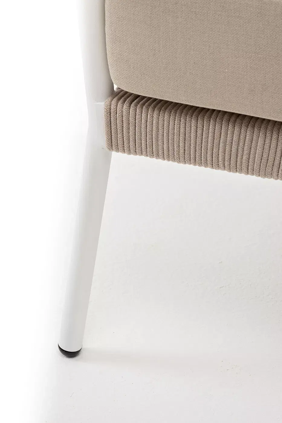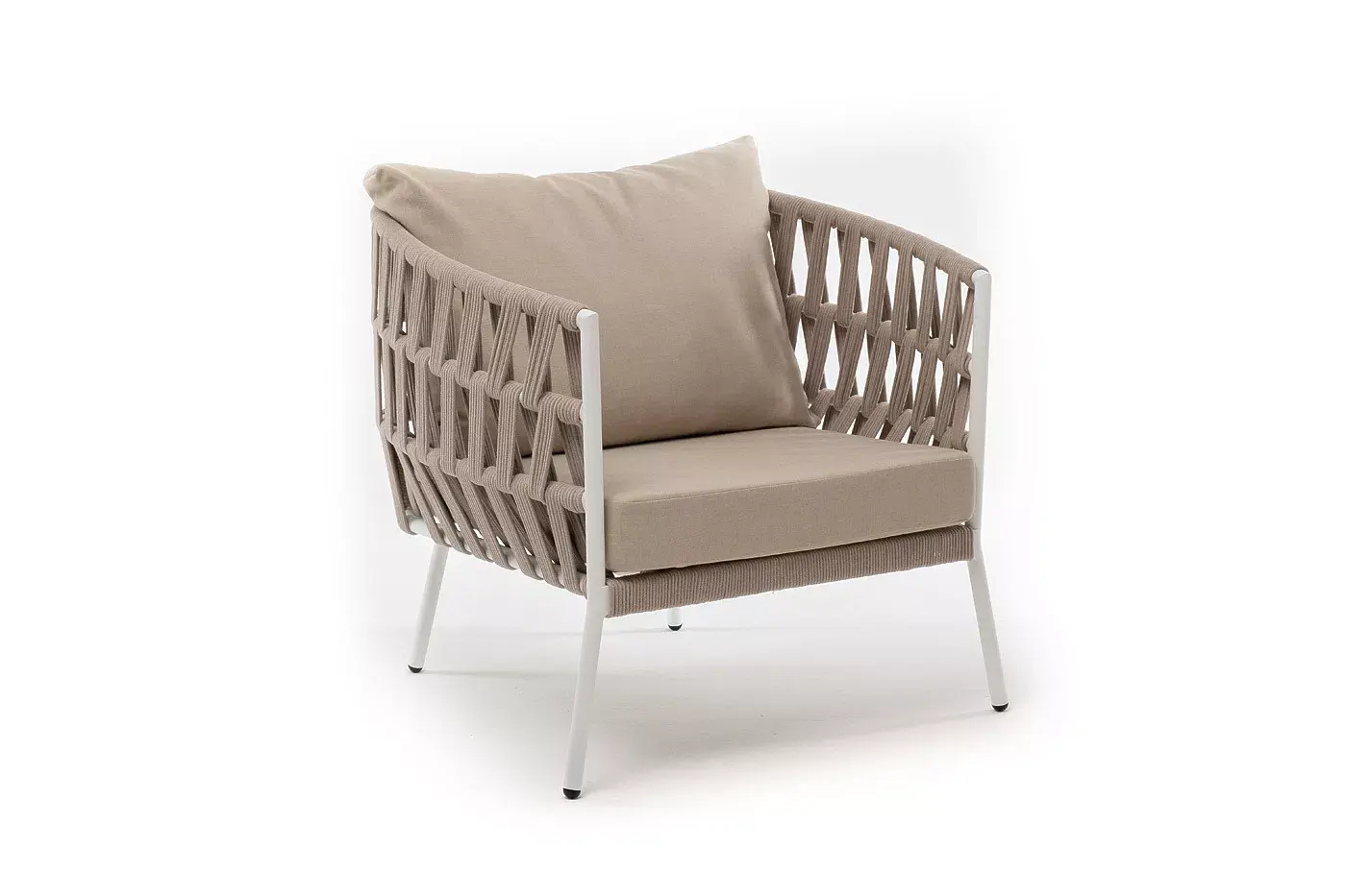Кресло имеет алюминиевый каркас, окрашенный порошковой краской в белый цвет. Боковины каркаса вручную оплетены роупом - эластичными синтетическими лентами, изготовленными из высокопрочных полиэфирных волокон. Цвет оплетки - бежевый.