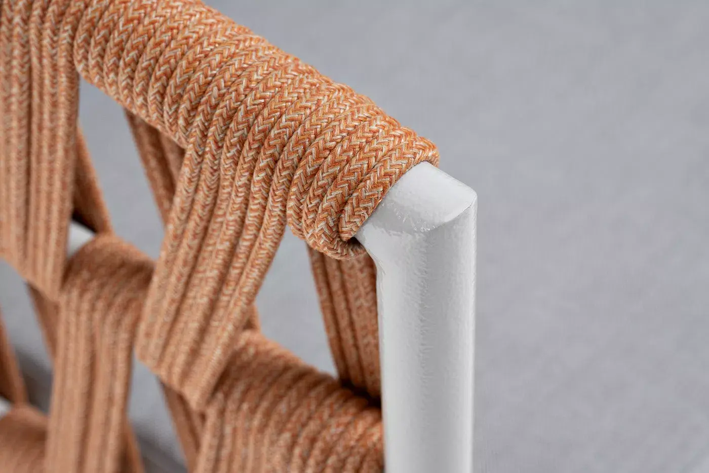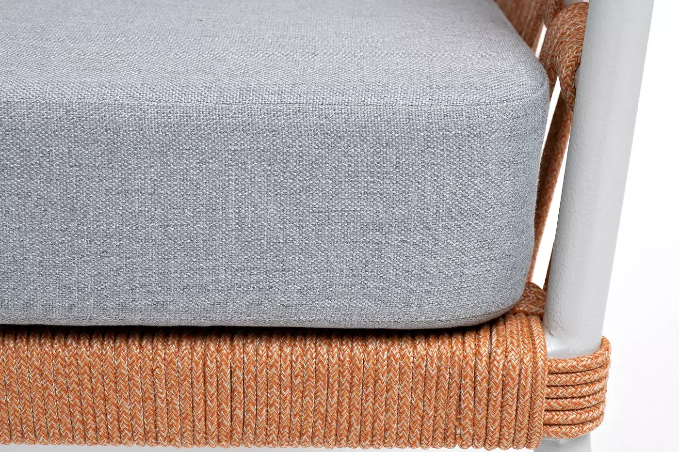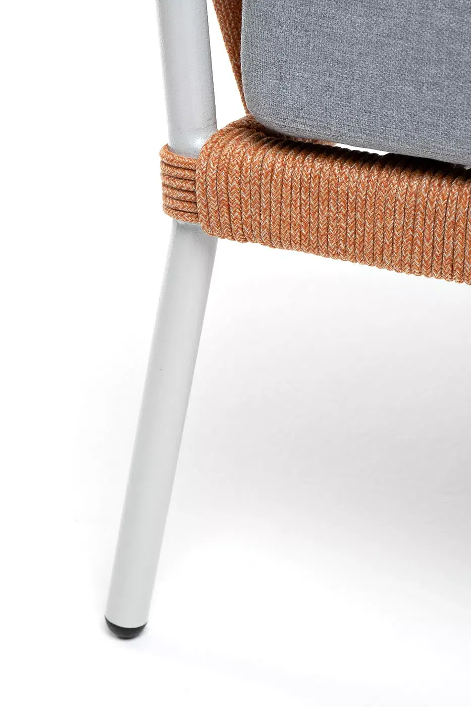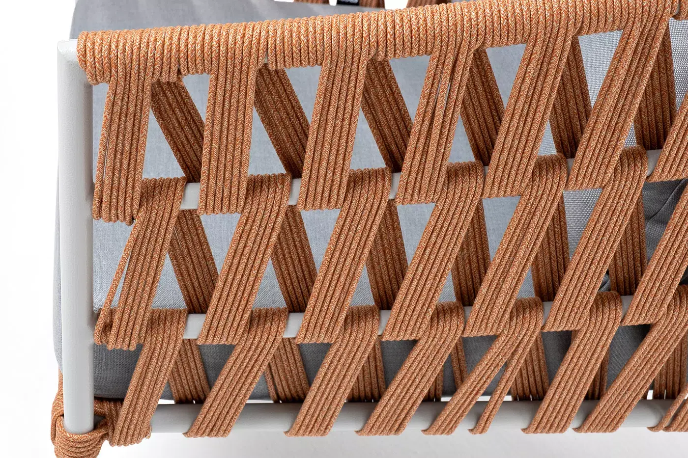 Кресло имеет алюминиевый каркас, окрашенный порошковой краской в светло-серый (RAL7035) цвет. Боковины каркаса вручную оплетены роупом - эластичными синтетическими лентами, изготовленными из высокопрочных полиэфирных волокон. Цвет оплетки - оранжевый меланж.