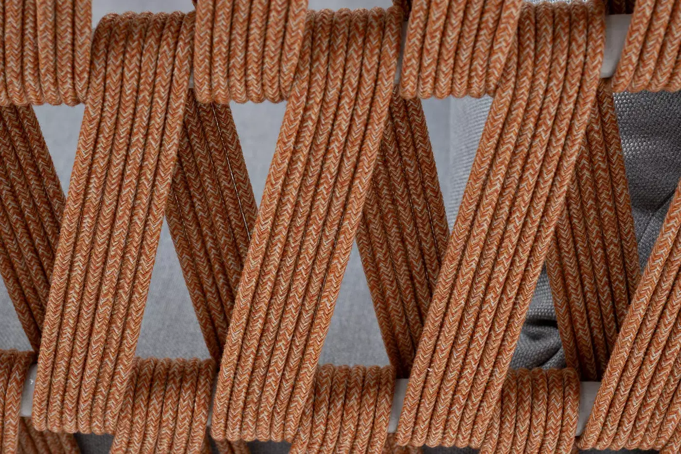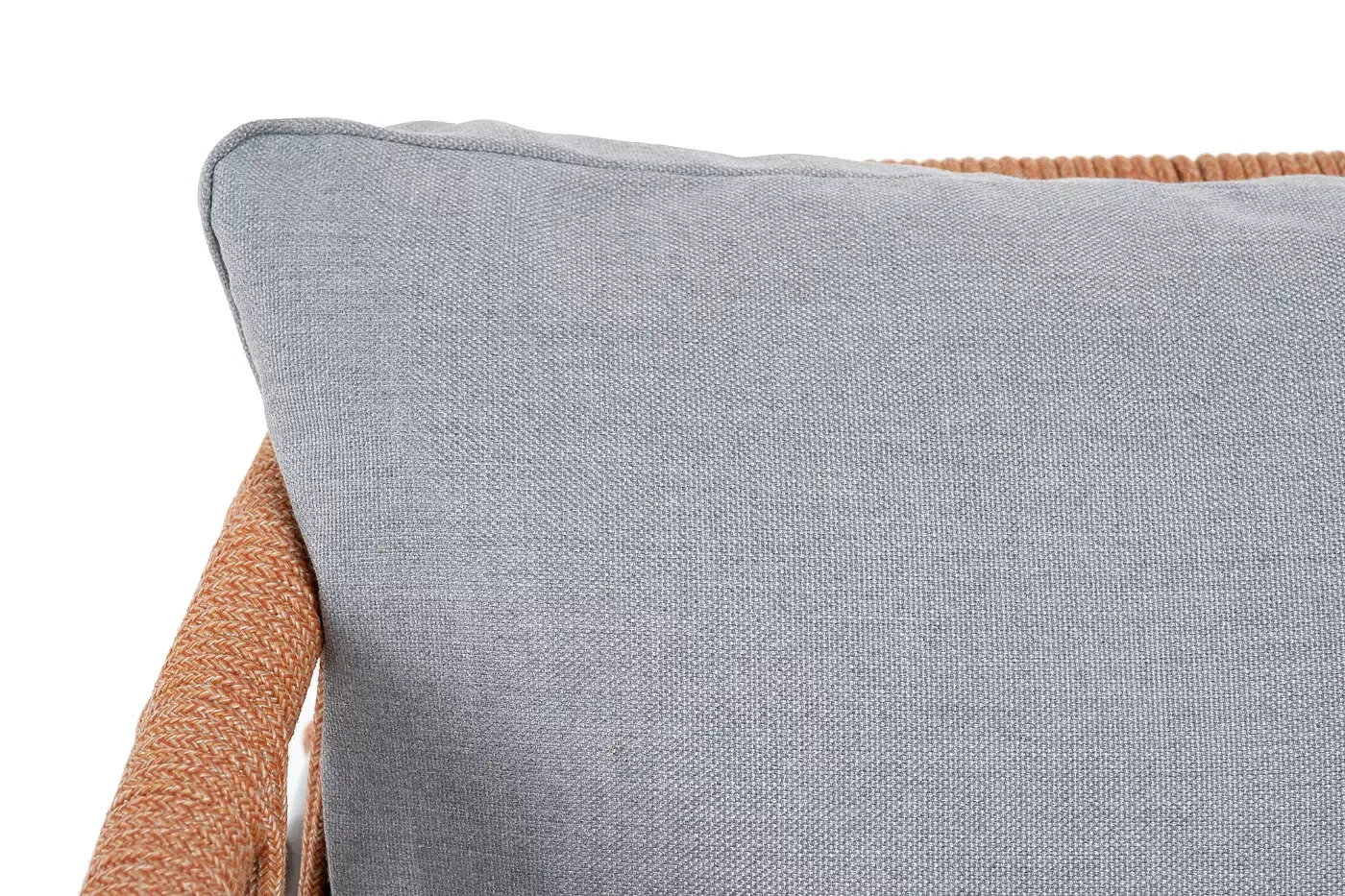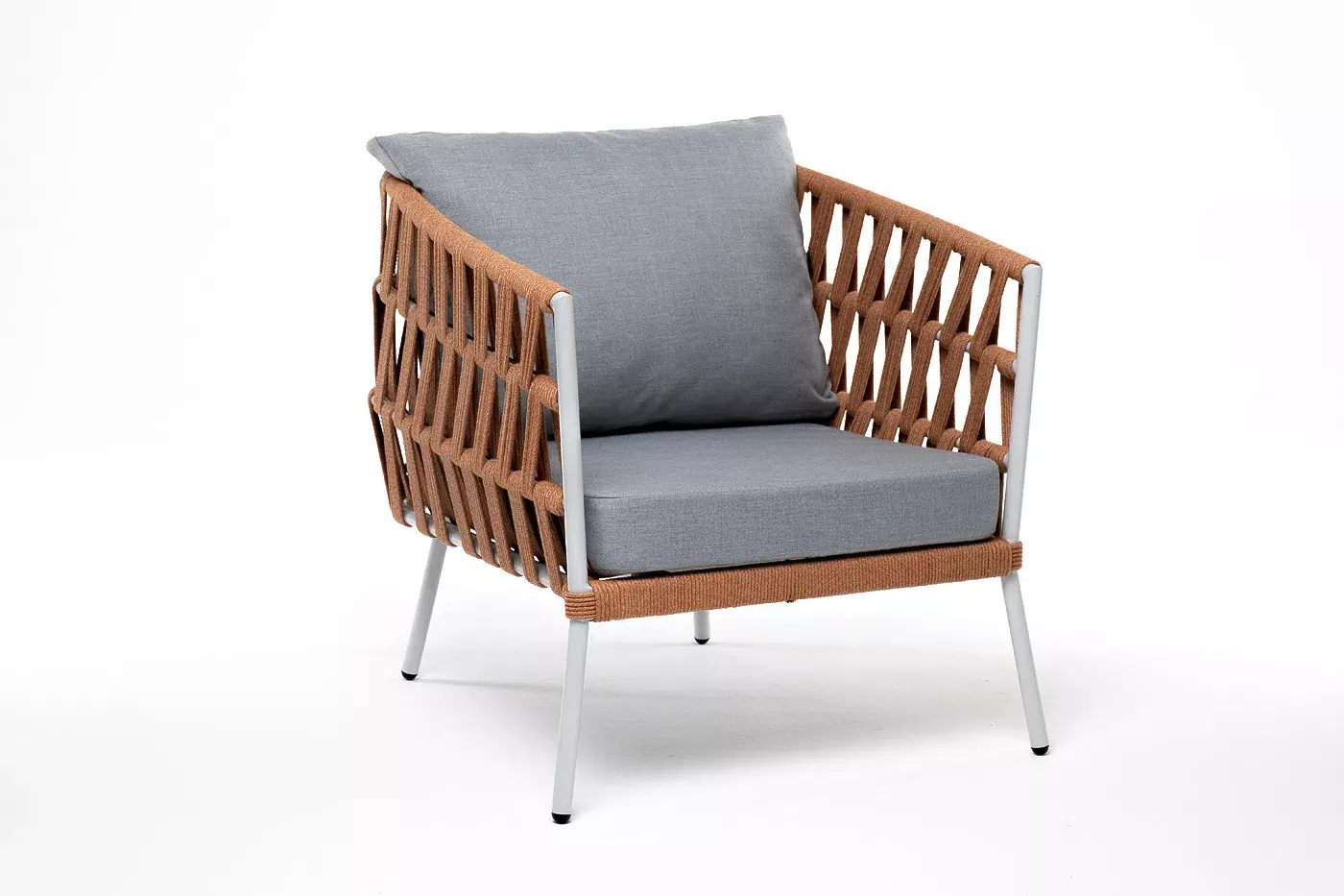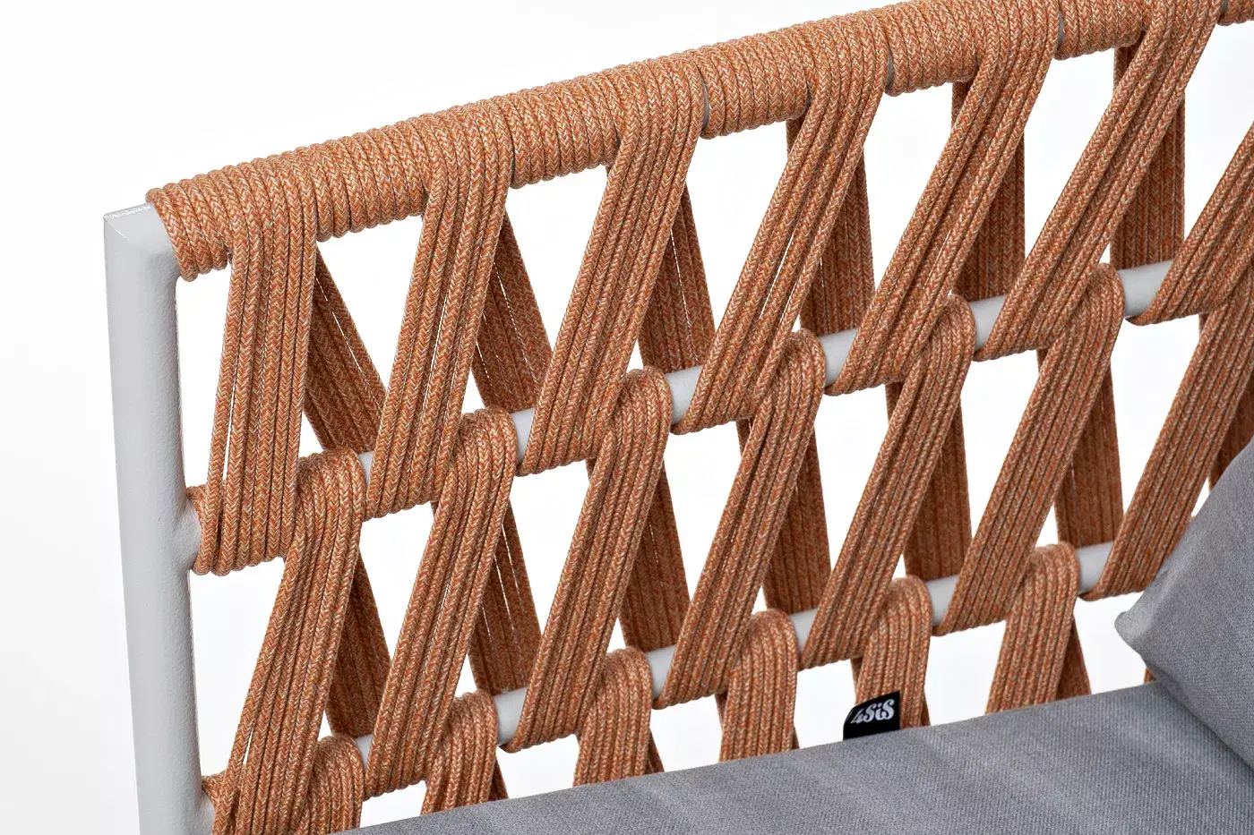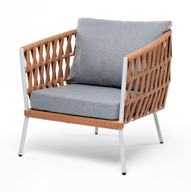 Кресло имеет алюминиевый каркас, окрашенный порошковой краской в светло-серый (RAL7035) цвет. Боковины каркаса вручную оплетены роупом - эластичными синтетическими лентами, изготовленными из высокопрочных полиэфирных волокон. Цвет оплетки - оранжевый меланж.