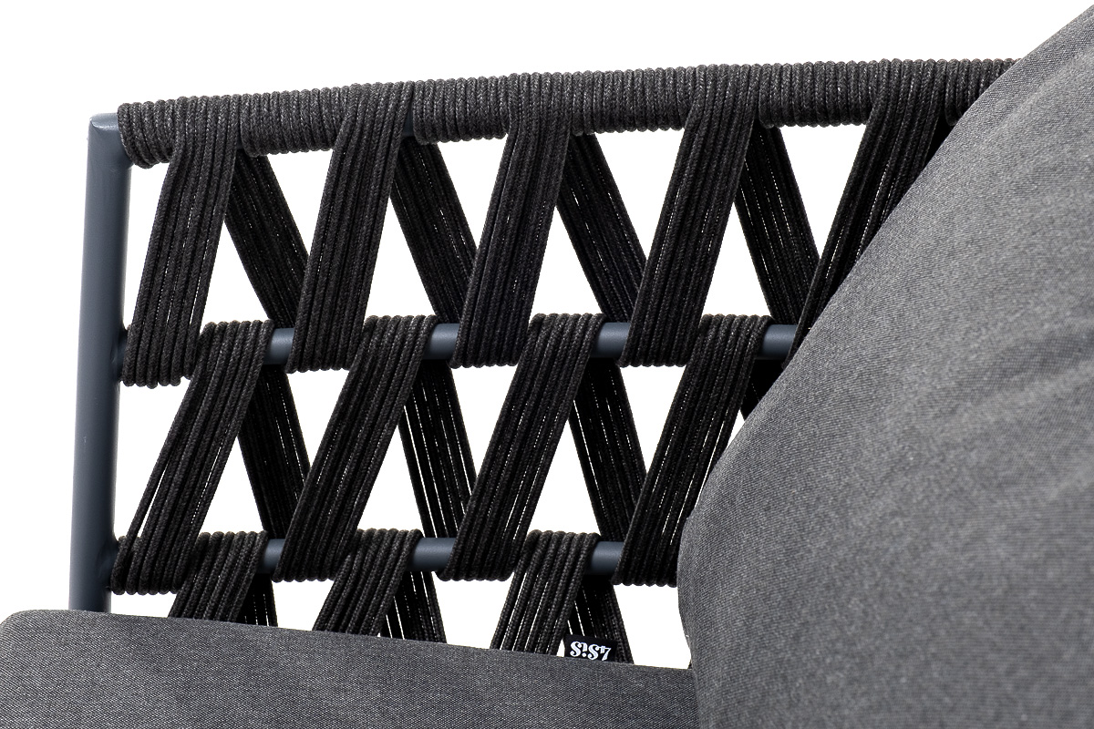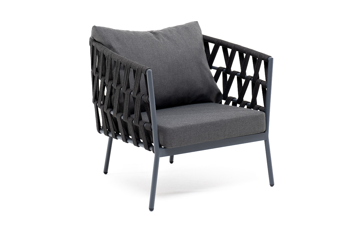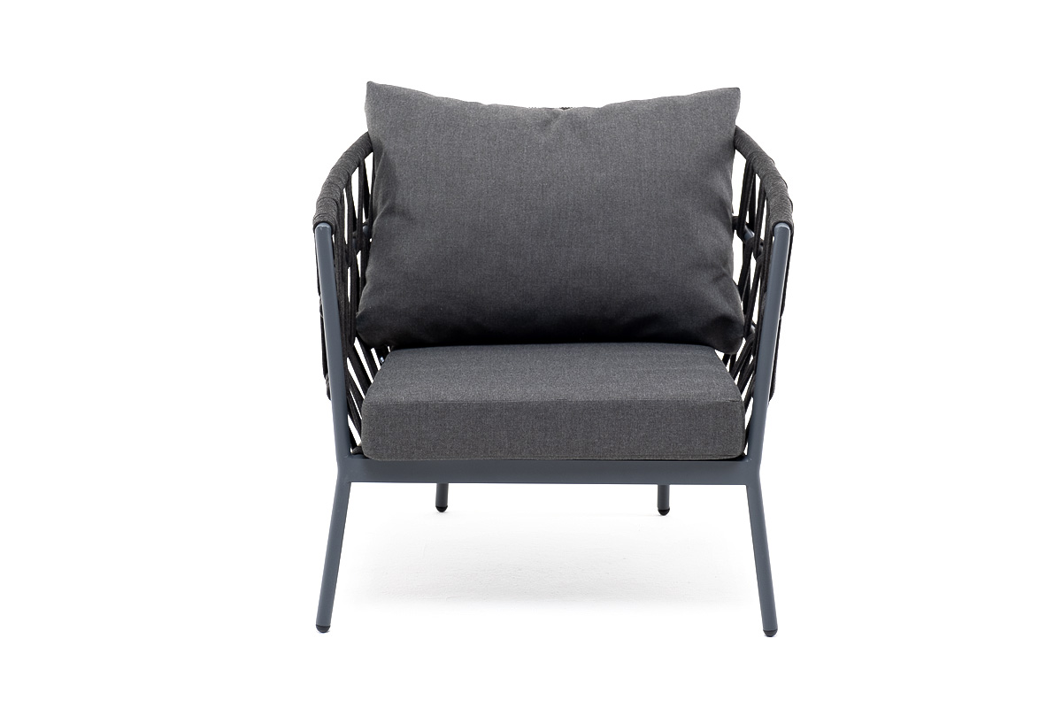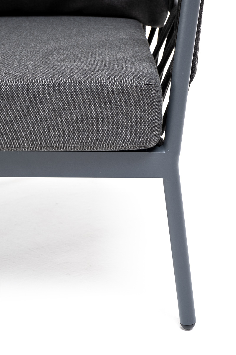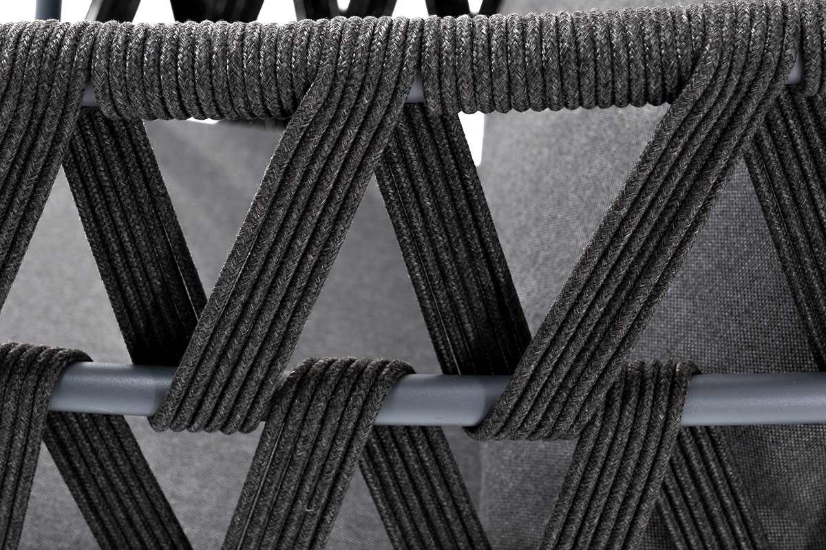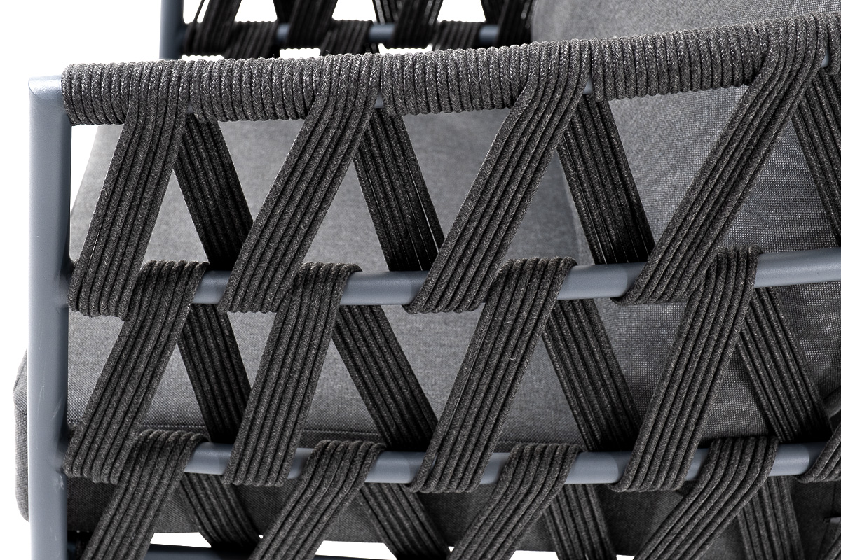 Кресло имеет алюминиевый каркас, окрашенный порошковой краской в темно-серый (RAL7024) цвет. Боковины каркаса вручную оплетены роупом - эластичными синтетическими лентами, изготовленными из высокопрочных полиэфирных волокон. Цвет оплетки - темно-серый.