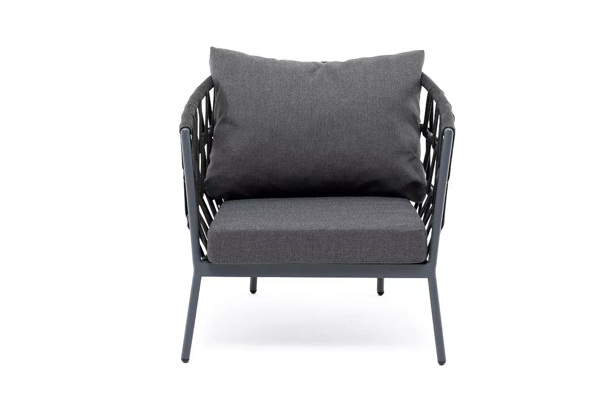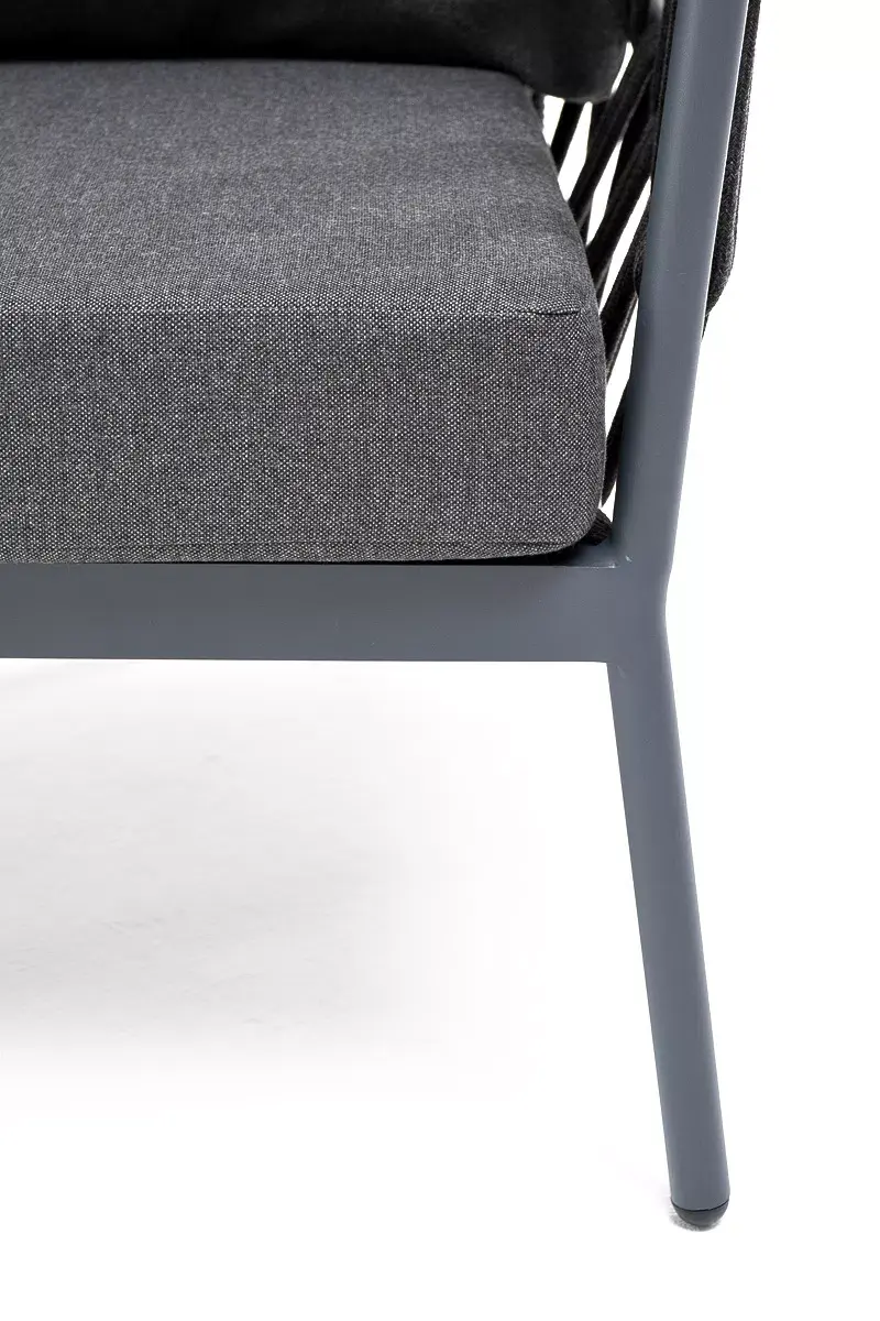 Кресло имеет алюминиевый каркас, окрашенный порошковой краской в темно-серый (RAL7024) цвет. Боковины каркаса вручную оплетены роупом - эластичными синтетическими лентами, изготовленными из высокопрочных полиэфирных волокон. Цвет оплетки - темно-серый.