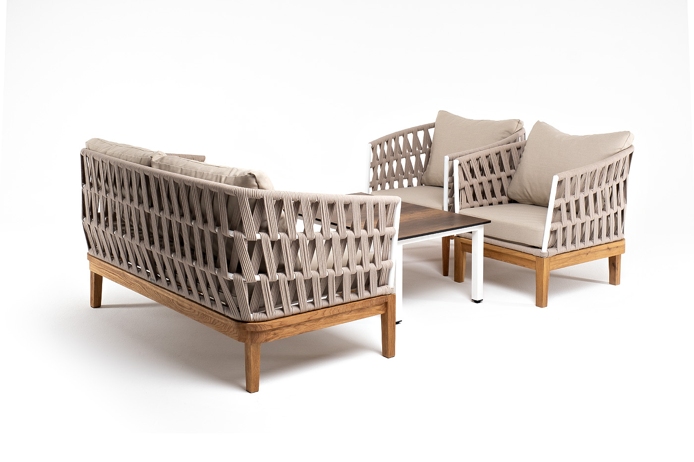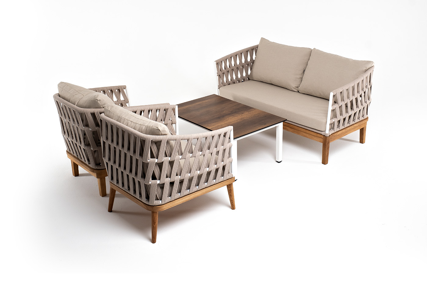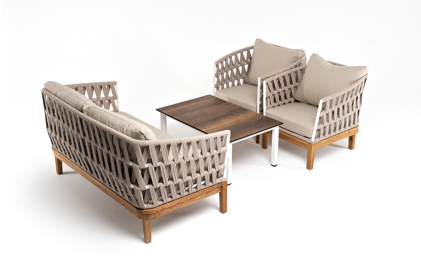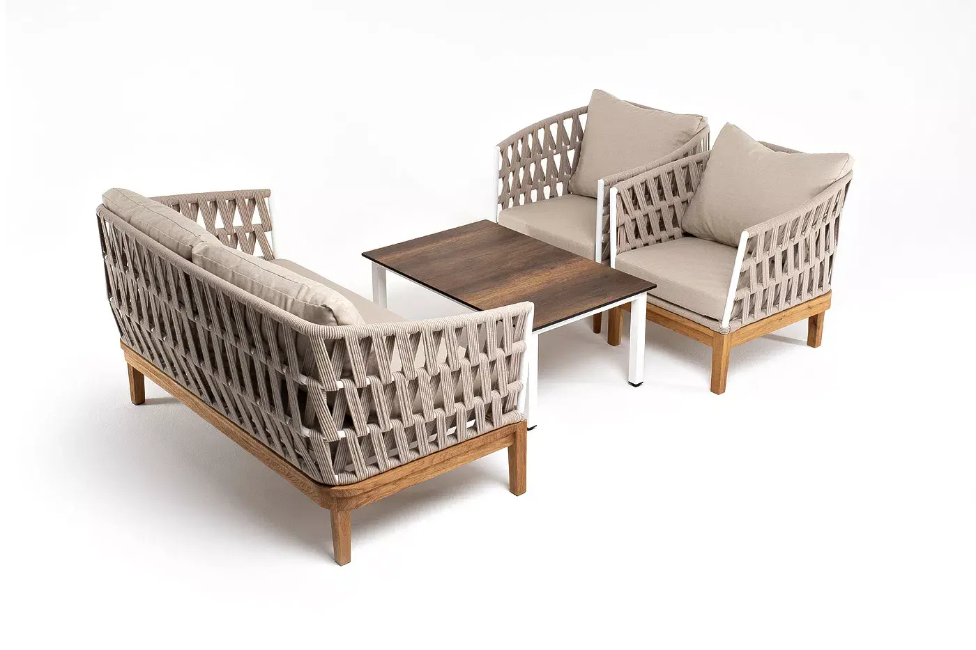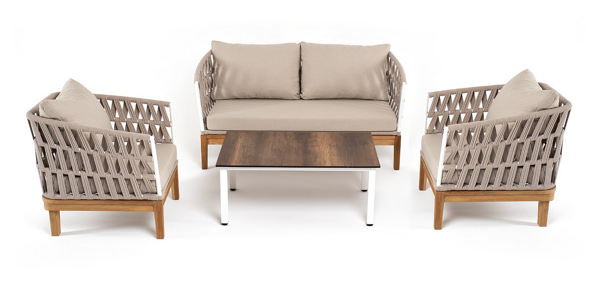 Каркас уличной мебели выполнен из дуба. Его дополняет бежевая оплетка, изготовленная на основе эластичных синтетических лент из полиэфирных волокон высокой прочности.