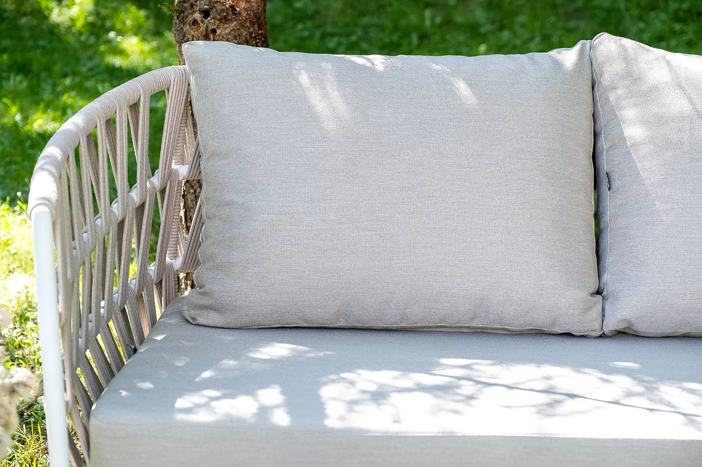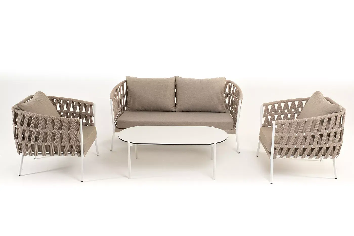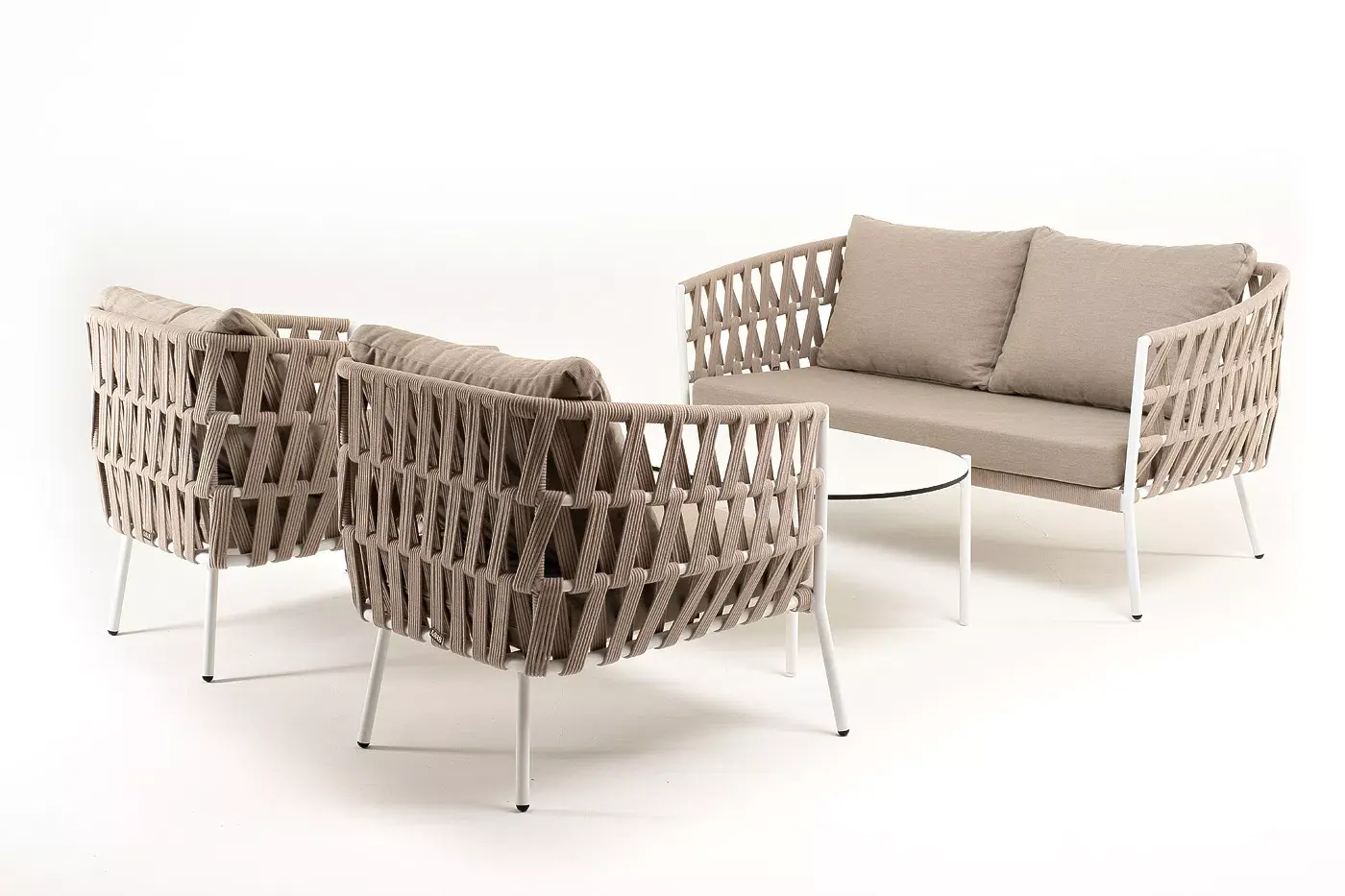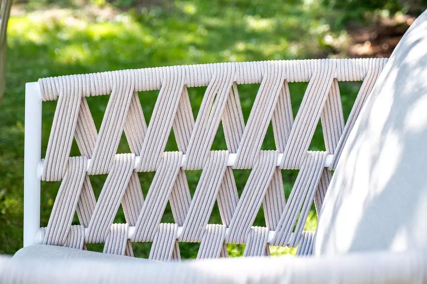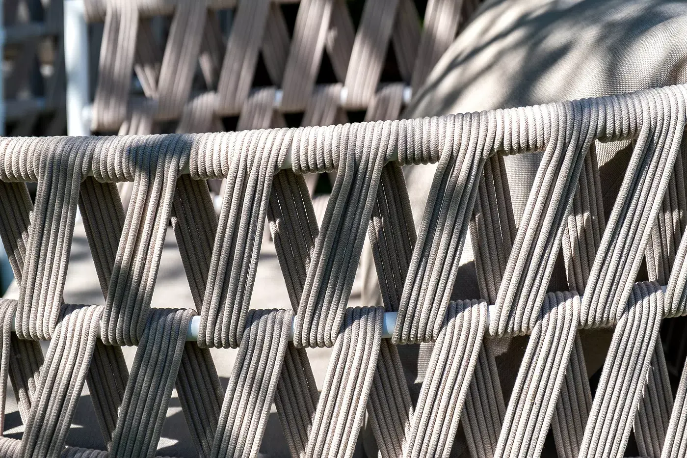 Каркас уличной мебели выполнен из износостойкого алюминия. Его дополняет бежевая ручная оплетка, изготовленная на основе эластичных синтетических лент из полиэфирных волокон высокой прочности (роупа).