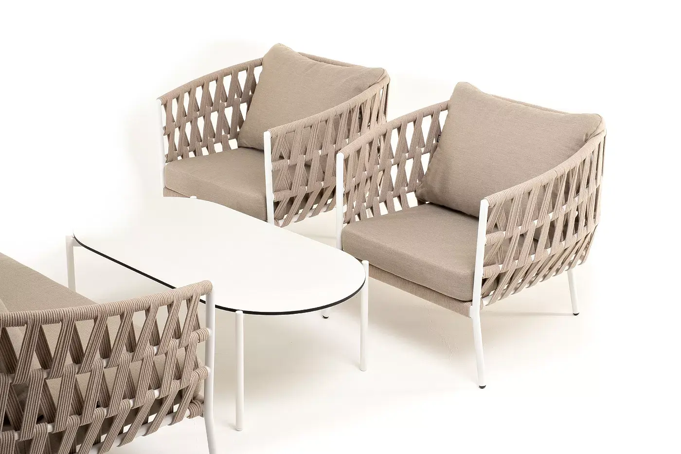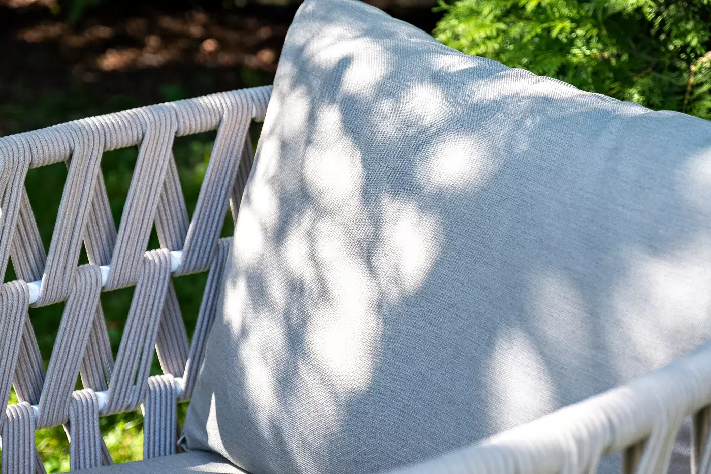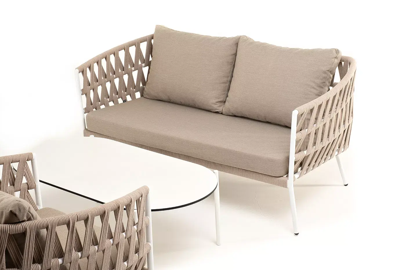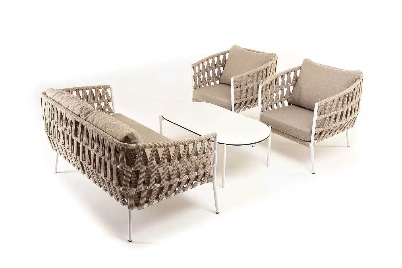 Каркас уличной мебели выполнен из износостойкого алюминия. Его дополняет бежевая ручная оплетка, изготовленная на основе эластичных синтетических лент из полиэфирных волокон высокой прочности (роупа).