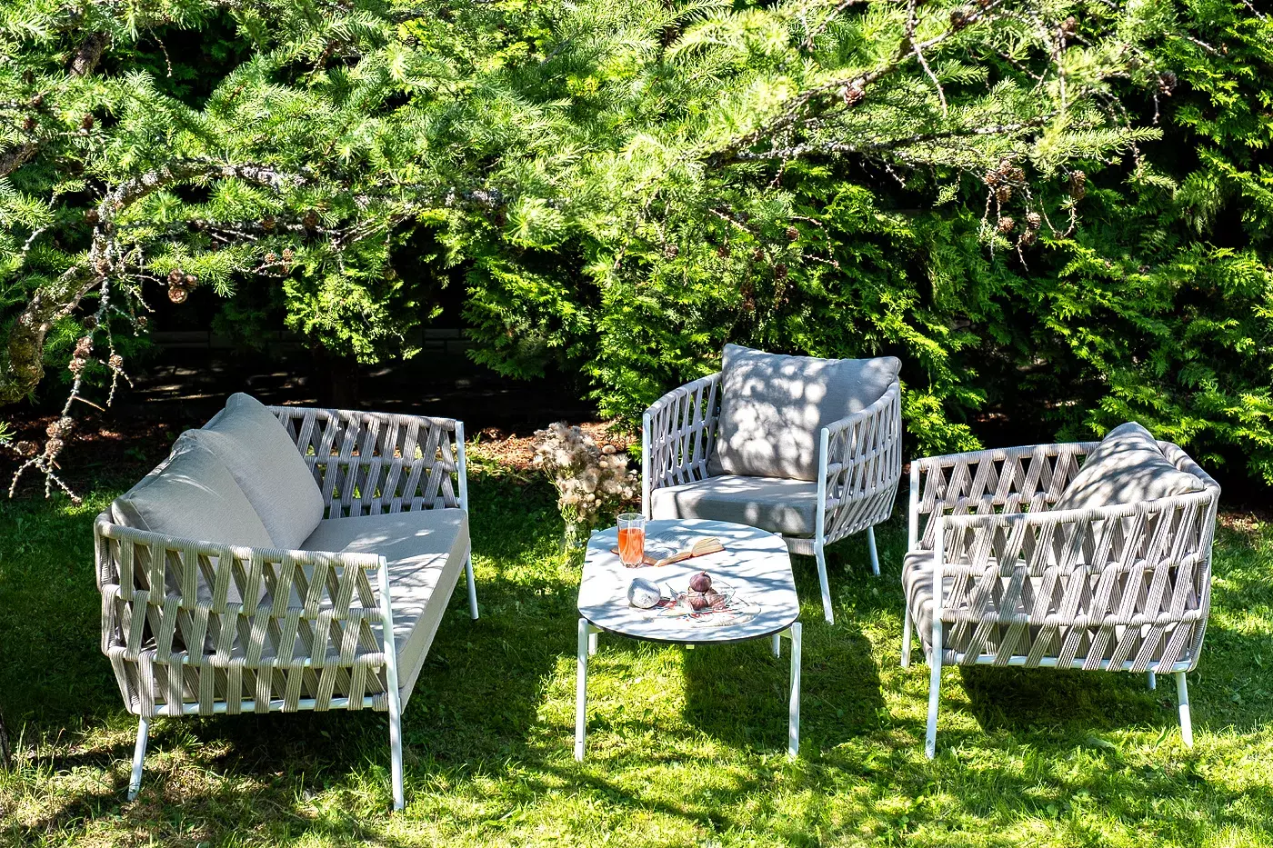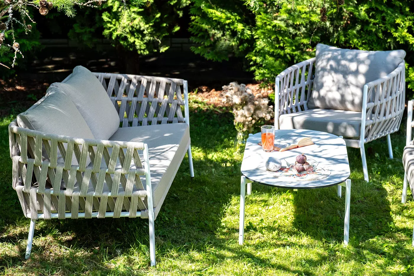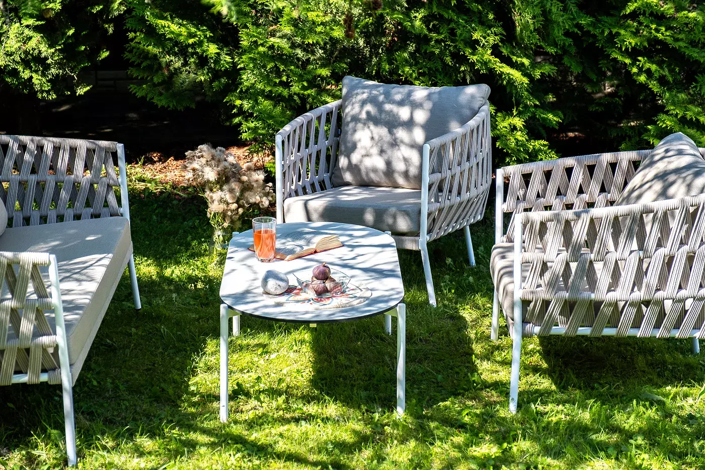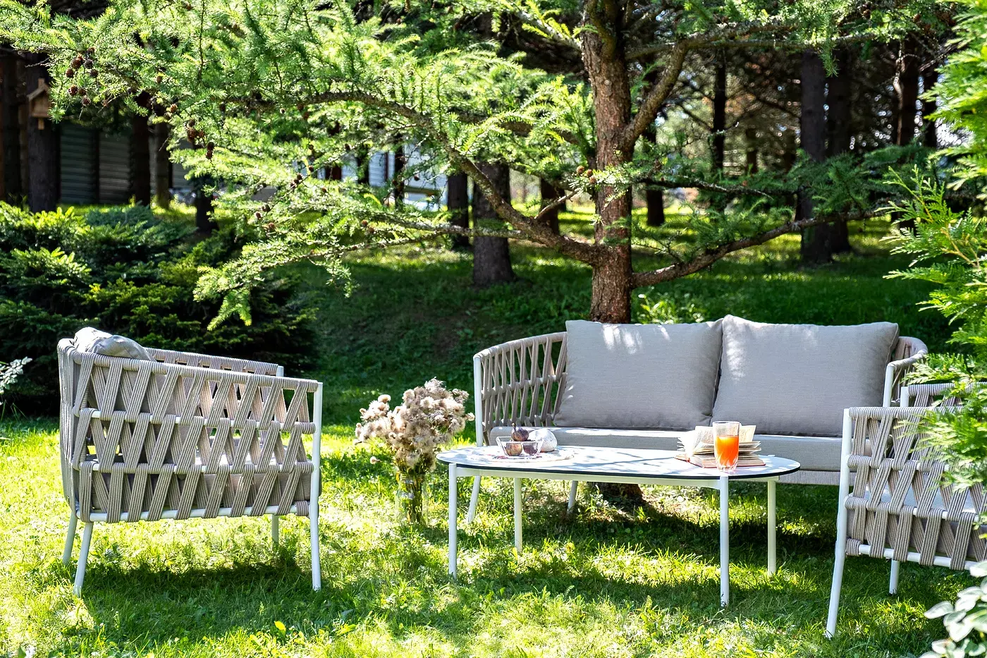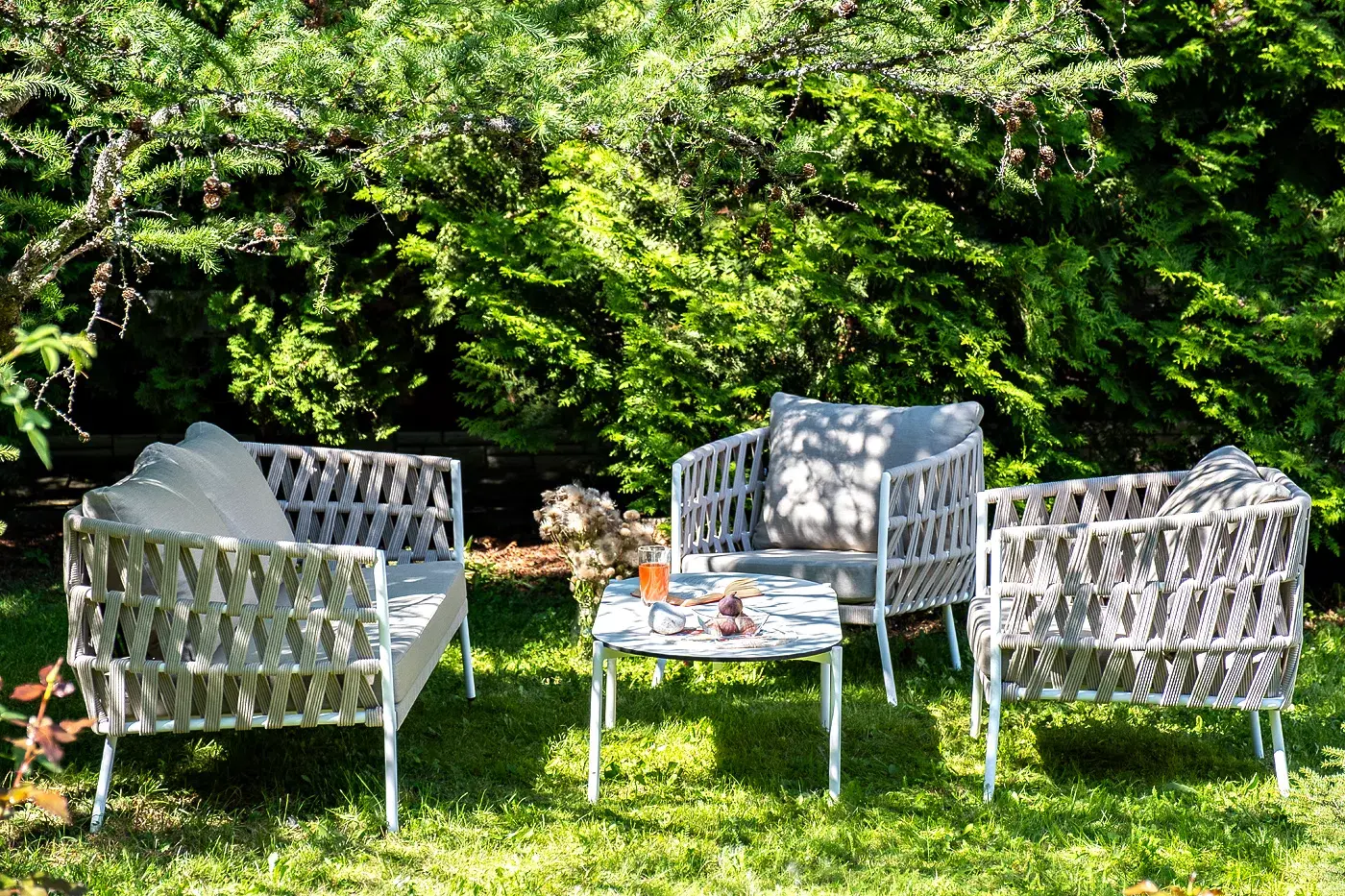 Каркас уличной мебели выполнен из износостойкого алюминия. Его дополняет бежевая ручная оплетка, изготовленная на основе эластичных синтетических лент из полиэфирных волокон высокой прочности (роупа).