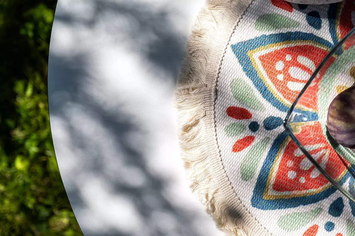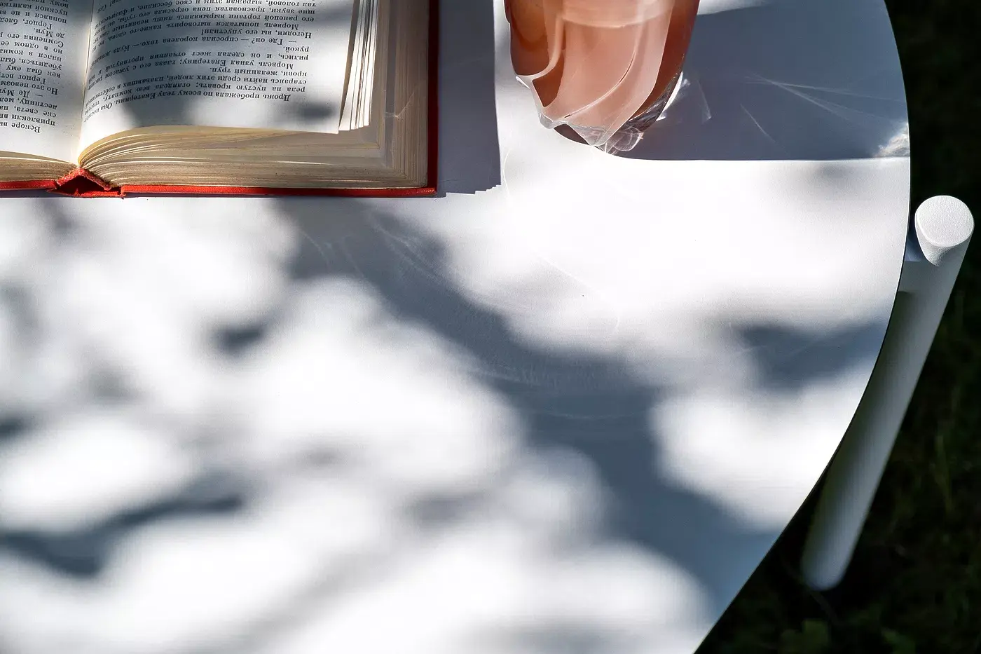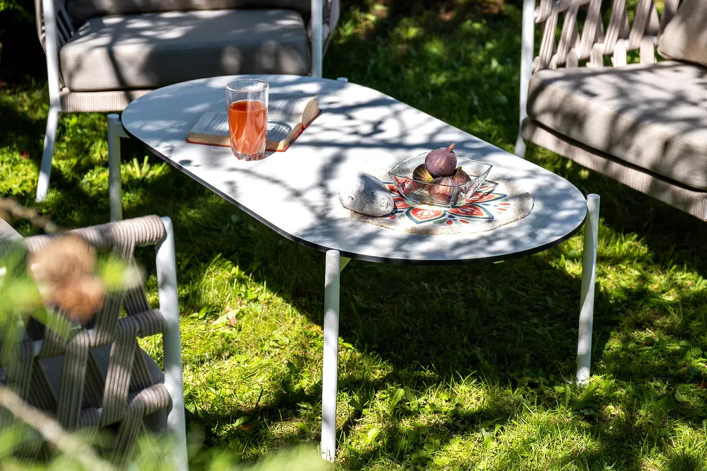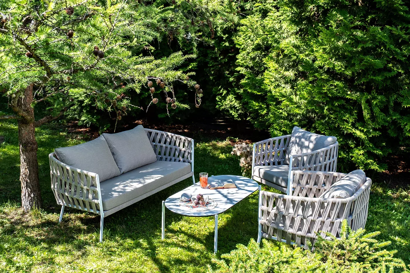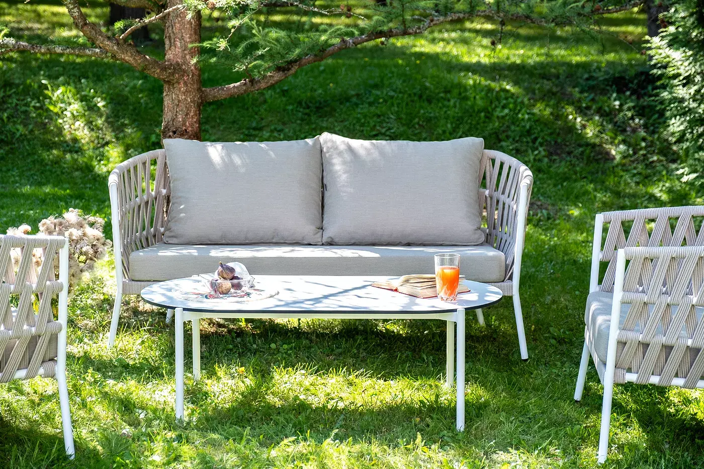 Каркас уличной мебели выполнен из износостойкого алюминия. Его дополняет бежевая ручная оплетка, изготовленная на основе эластичных синтетических лент из полиэфирных волокон высокой прочности (роупа).