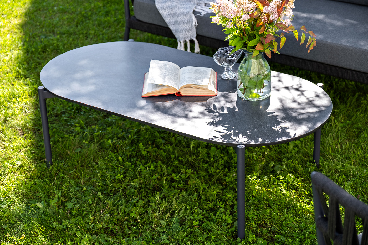 Каркас столика изготовлен из алюминия, окрашенного в элегантный и современный темно-серый цвет (RAL 7024). Алюминий является легким и прочным материалом, что обеспечивает долговечность и надежность изделия. Столешница изготовлена из прочного и устойчивого к механическим воздействиям компакт-пластика HPL в цвете «серый гранит».