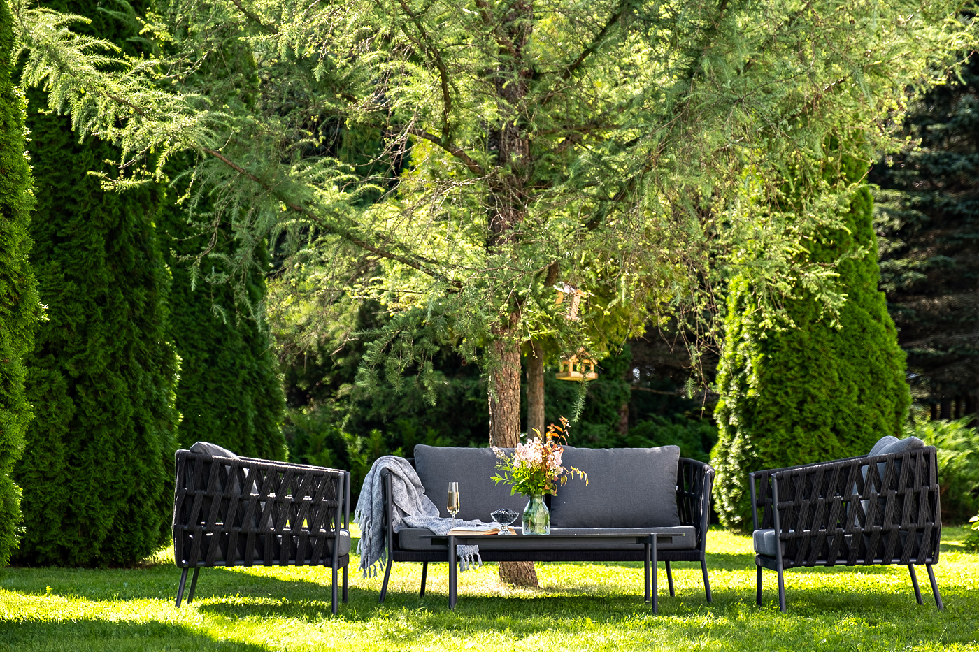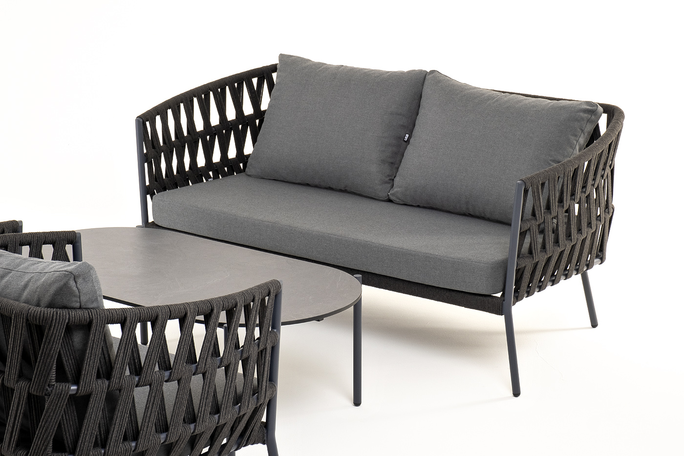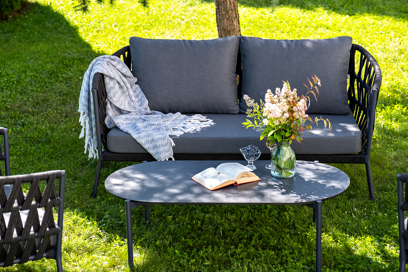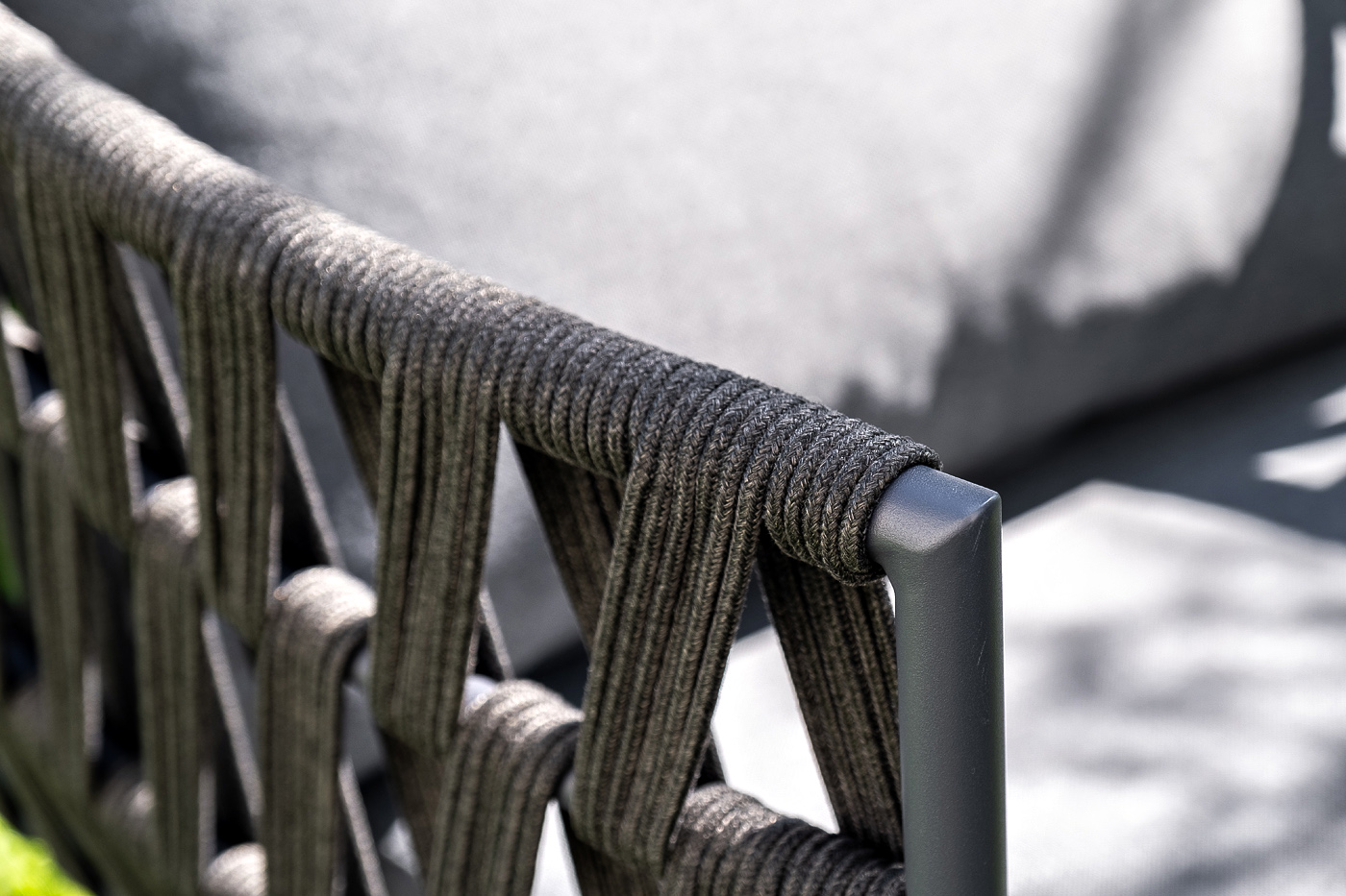 Каркас уличной мебели выполнен из износостойкого алюминия. Его дополняет темно-серая ручная оплетка, изготовленная на основе эластичных синтетических лент из полиэфирных волокон высокой прочности (роупа).