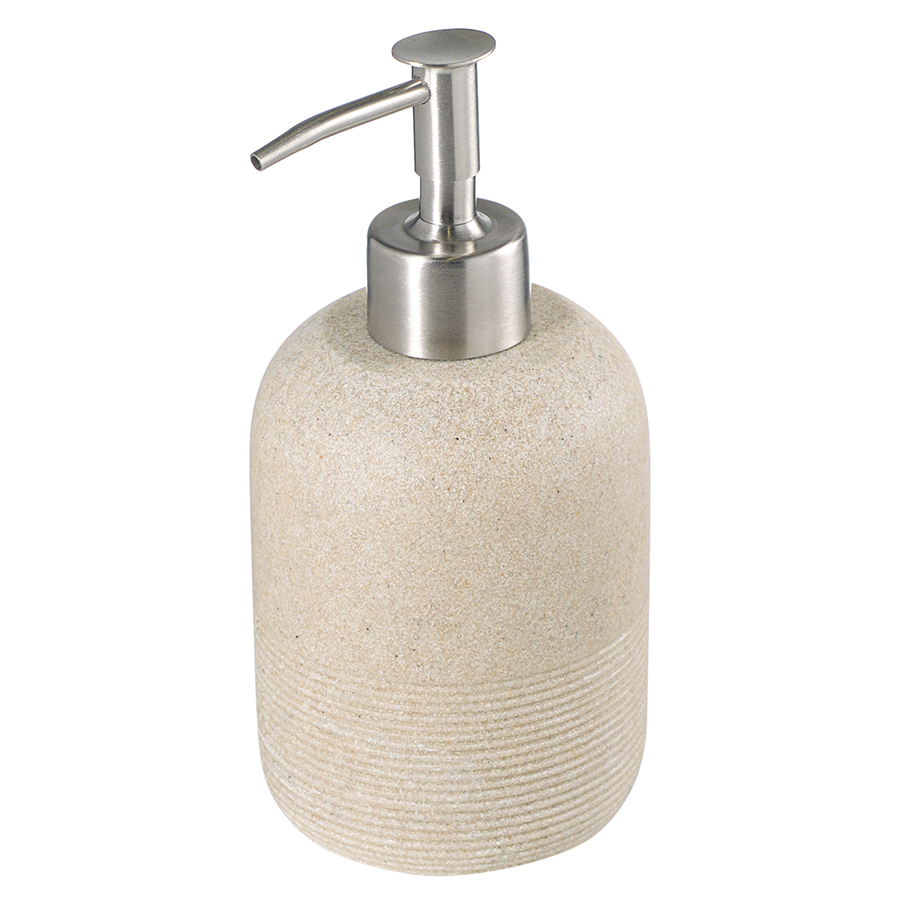 Диспенсер для жидкого мыла Loup имеет корпус из полирезина, стилизованного под натуральный камень бежевого оттенка. Материал отличается устойчивостью к влаге, ударам и царапинам, что делает его идеальным выбором для ванной комнаты. Наружные элементы дозирующего механизма выполнены из нержавеющей стали, обладающей высокой прочностью, долговечностью и отличными антикоррозионными свойствами. Кроме того, ее блестящая поверхность придает изделию презентабельный вид.
