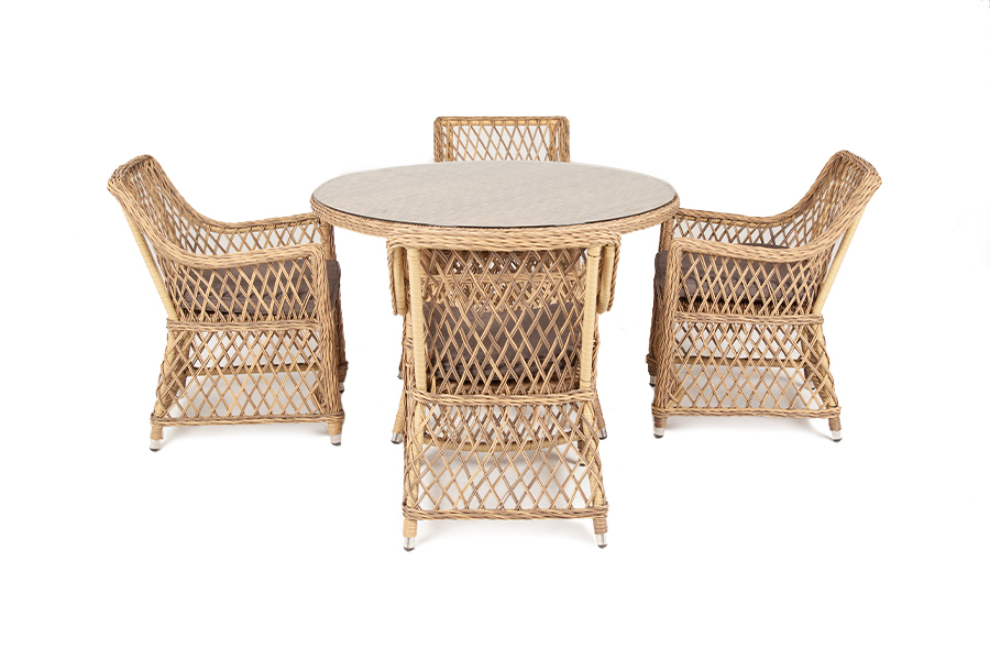 Классическая уличная обеденная группа «Доппио» для сада, летней веранды ресторана. В комплекте круглый обеденный стол «Эспрессо» (1180×1180×750 мм) с ударопрочной стеклянной столешницей и 4 кресла коллекции «Латте» 550×660×850 мм.