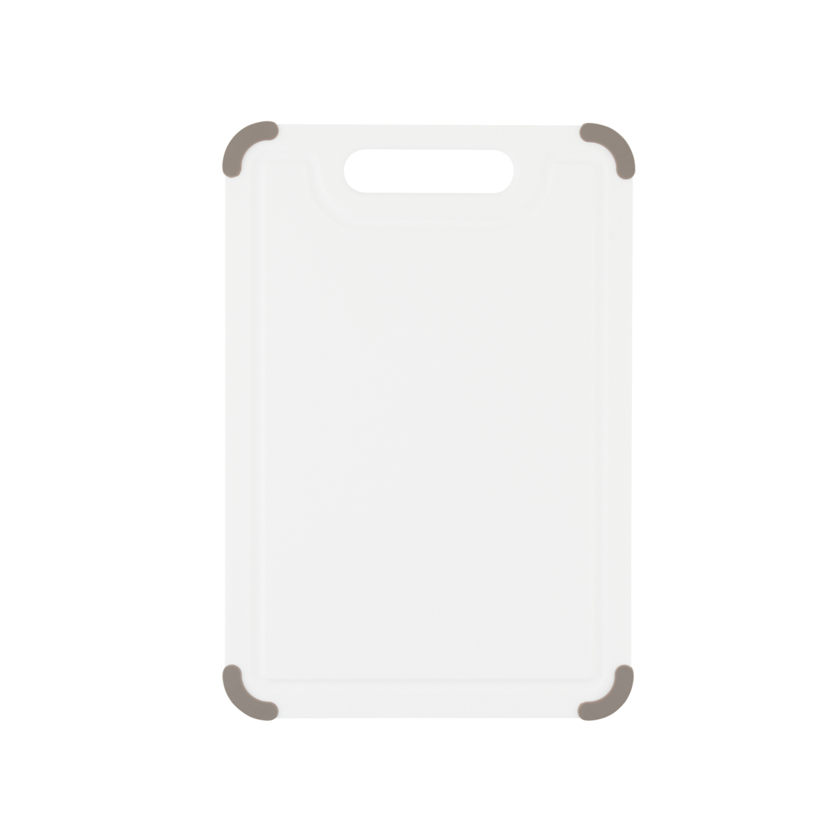 Доска разделочная GIPFEL ECO 50425. Доска белого цвета с желобом для удержания жидкости и с серыми силиконовыми ножками против скольжения. Размер доски 35х24см. Сделана из пищевого пластика, ножки силиконовые.