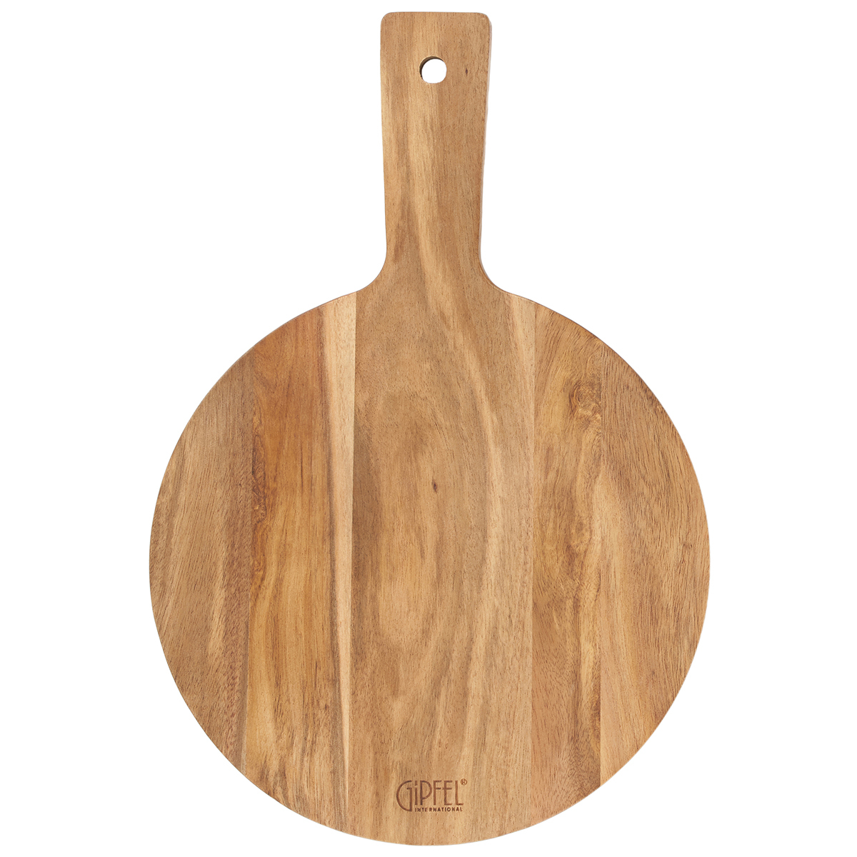 Данная доска округлой формы и рукояткой с отверстием для подвешивания. Текстура и цвет доски натурального дерева.