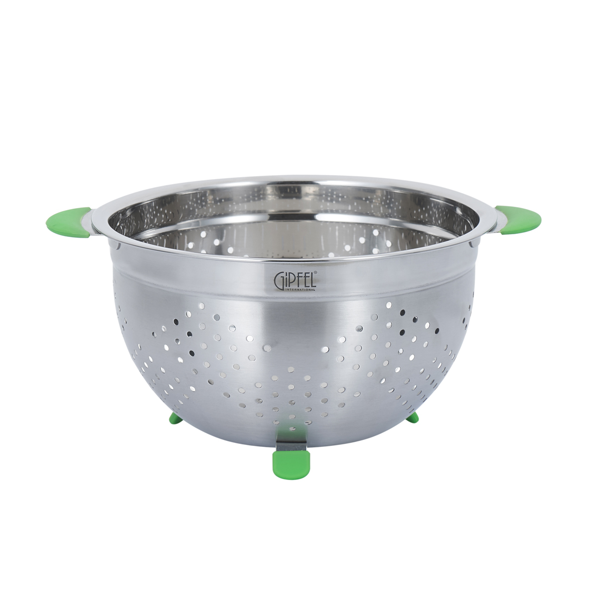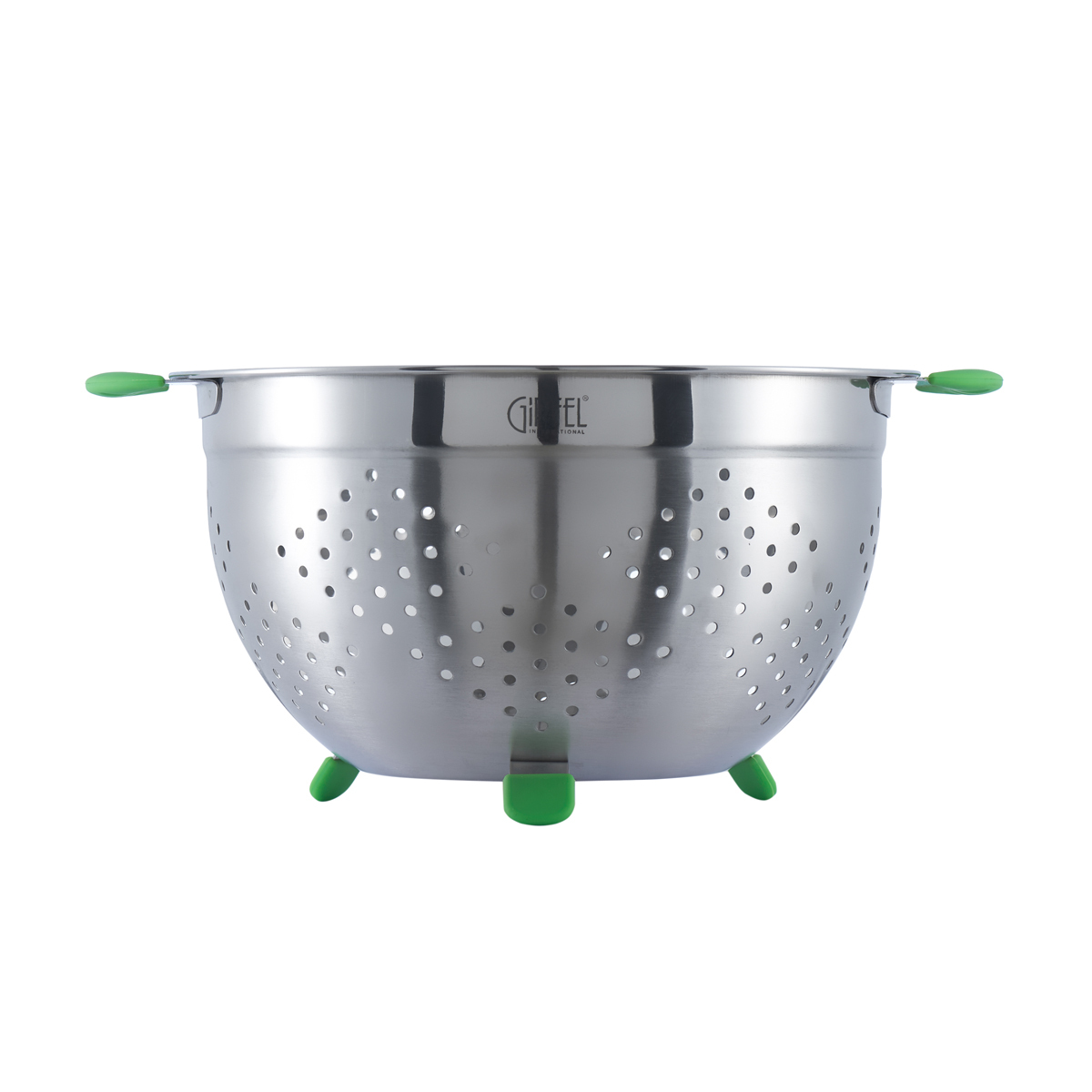 Дуршлаг Gipfel FEDERICA 1372. Оснащен силиконовыми ручками и ножками. Диаметр 24 см, высота 15 см. Изготовлен из прочной нержавеющей стали и предназначен не только для промывки овощей, фруктов, грибов и ягод, но также для горячей продукции.
