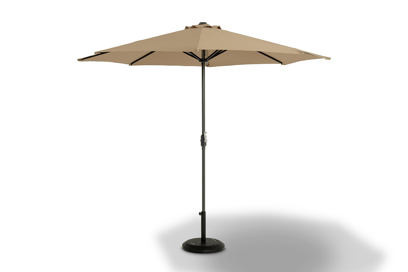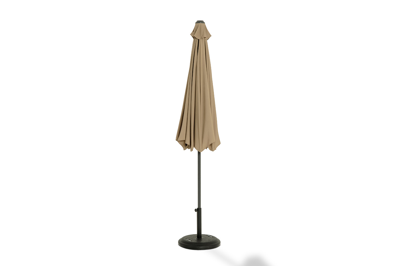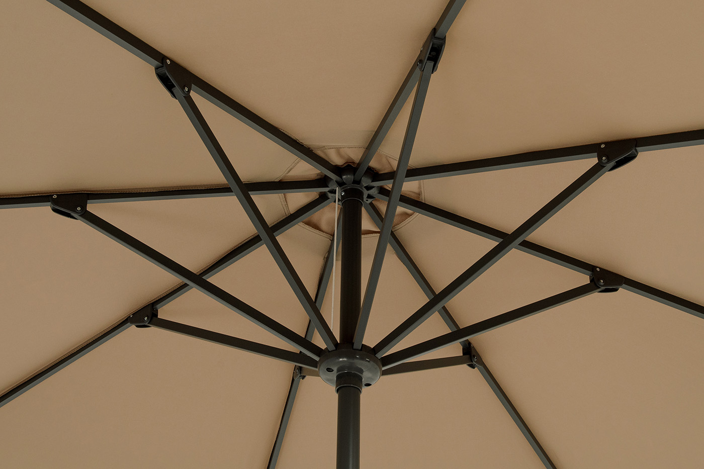 Тент изготовлен из 100% полиэстера, плотностью 180 г/м2 с водоотталкивающей пропиткой. Металлическая телескопическая стойка Ø38 мм. Конструкция состоит из 8 алюминиевых спиц.