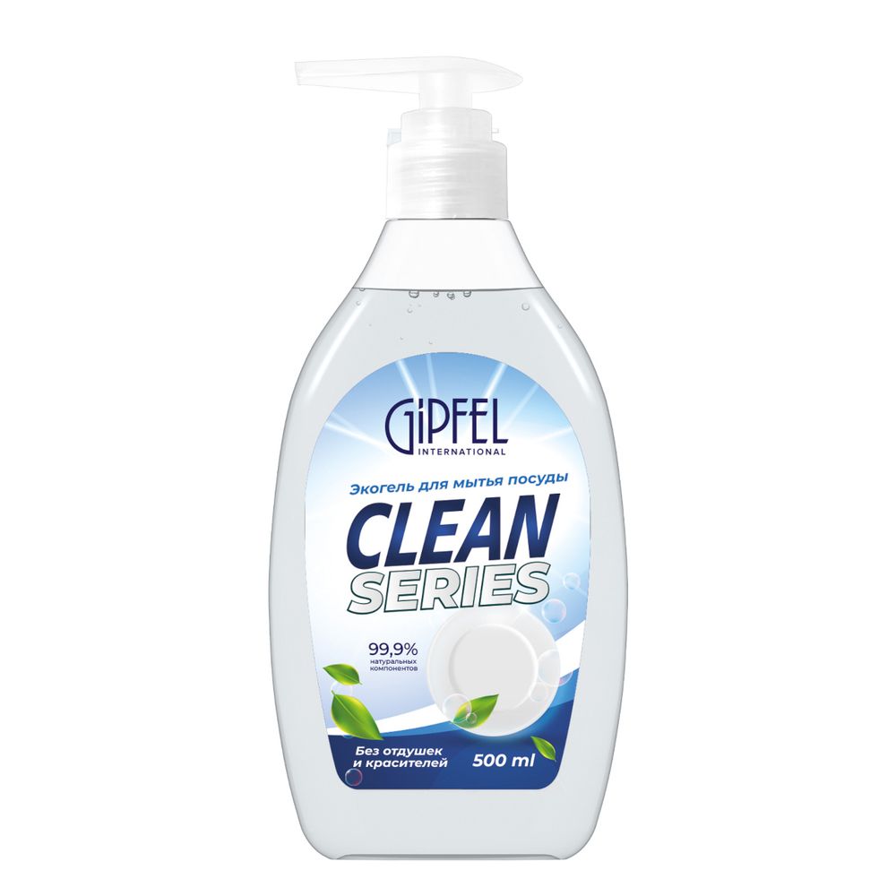 Экогель для мытья посуды Gipfel Clean Series без отдушек и красителей 52304. В прозрачной бутылке с дозатором 500 мл средства.