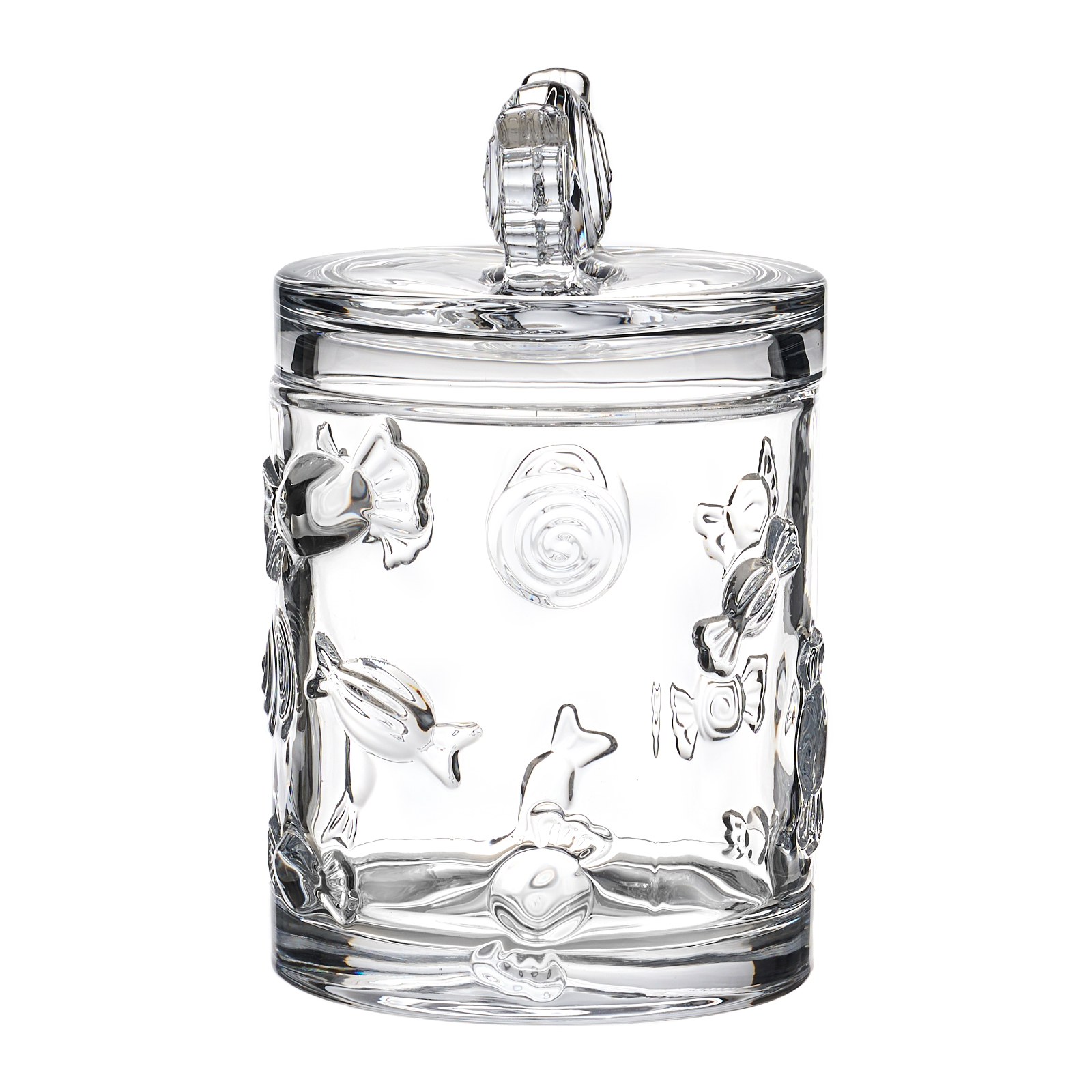 Эта ёмкость — настоящее произведение искусства, созданное из прозрачного стекла и украшенное уникальными рельефными узорами. Каждая линия, каждый элемент дизайна отражает историю и мастерство, воплощённые в этом предмете. Она не просто ёмкость для хранения — это настоящий декоративный аксессуар, который преобразит любое пространство.