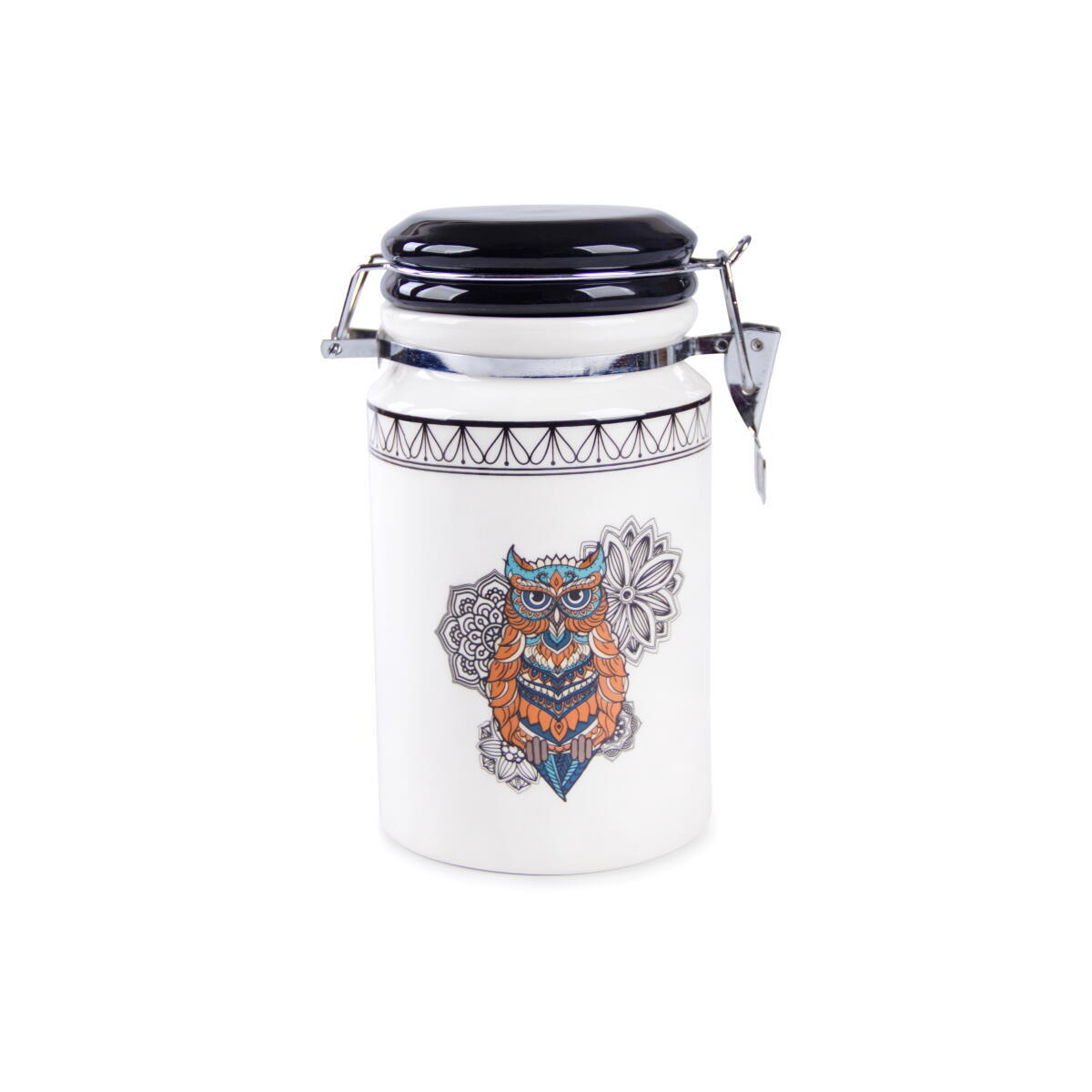 Емкость для хранения продуктов GIPFEL CIVETTA 3966. Стильная керамическая емкость для хранения сыпучих продуктов с изображением совы. Черная крышка герметично закрывается и удерживается механизмом. Объем 750мл.