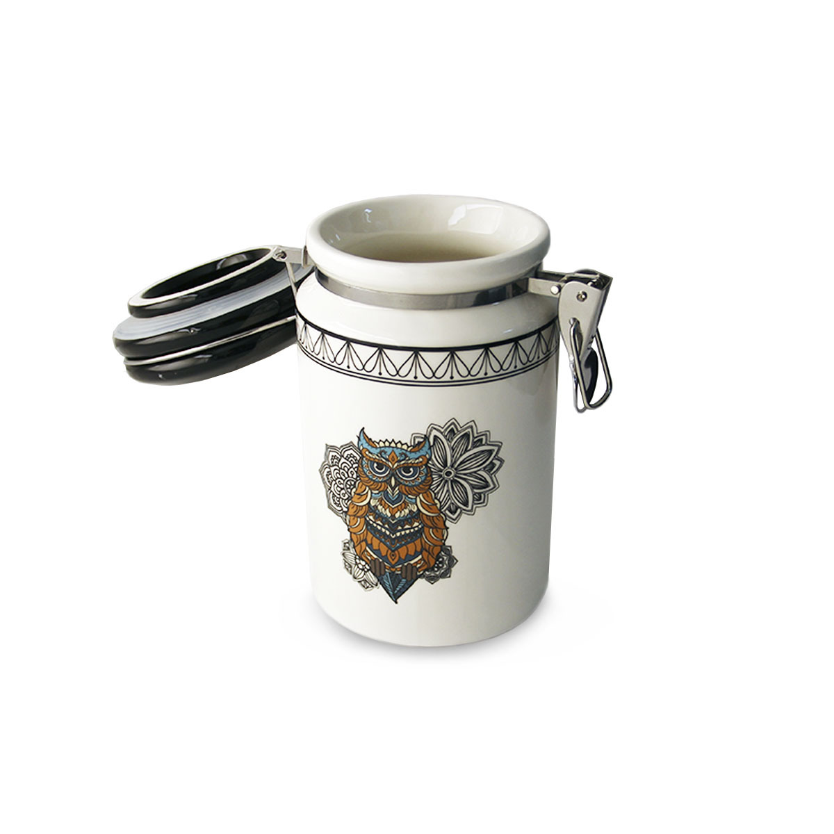 Емкость для хранения продуктов Gipfel CIVETTA 3966. Стильная керамическая емкость для хранения сыпучих продуктов с изображением совы. Черная крышка герметично закрывается и удерживается механизмом. Объем 750мл.