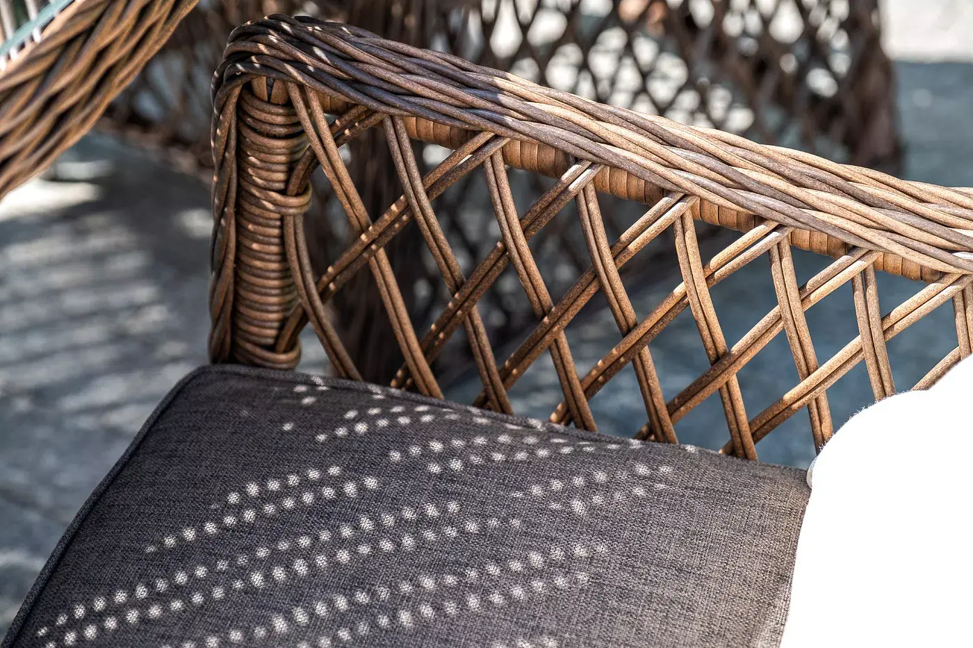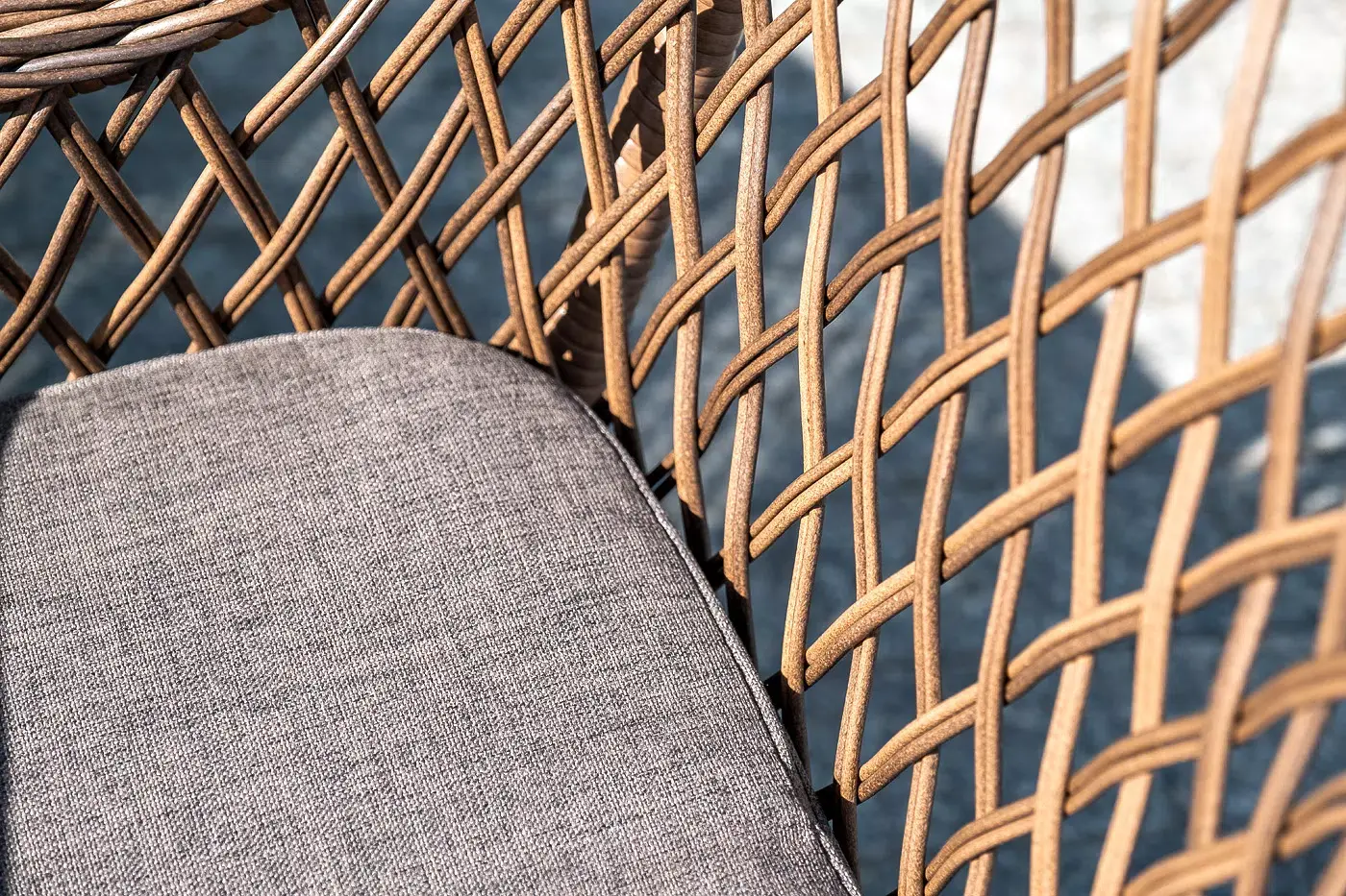 Вся мебель изготовлена из долговечного и легкого алюминия, обтянутого синтетическим ротангом. На столе для удобства эксплуатации предусмотрена столешница из ударопрочного закаленного стекла 5 мм. Стулья укомплектованы подушками на сидениях.