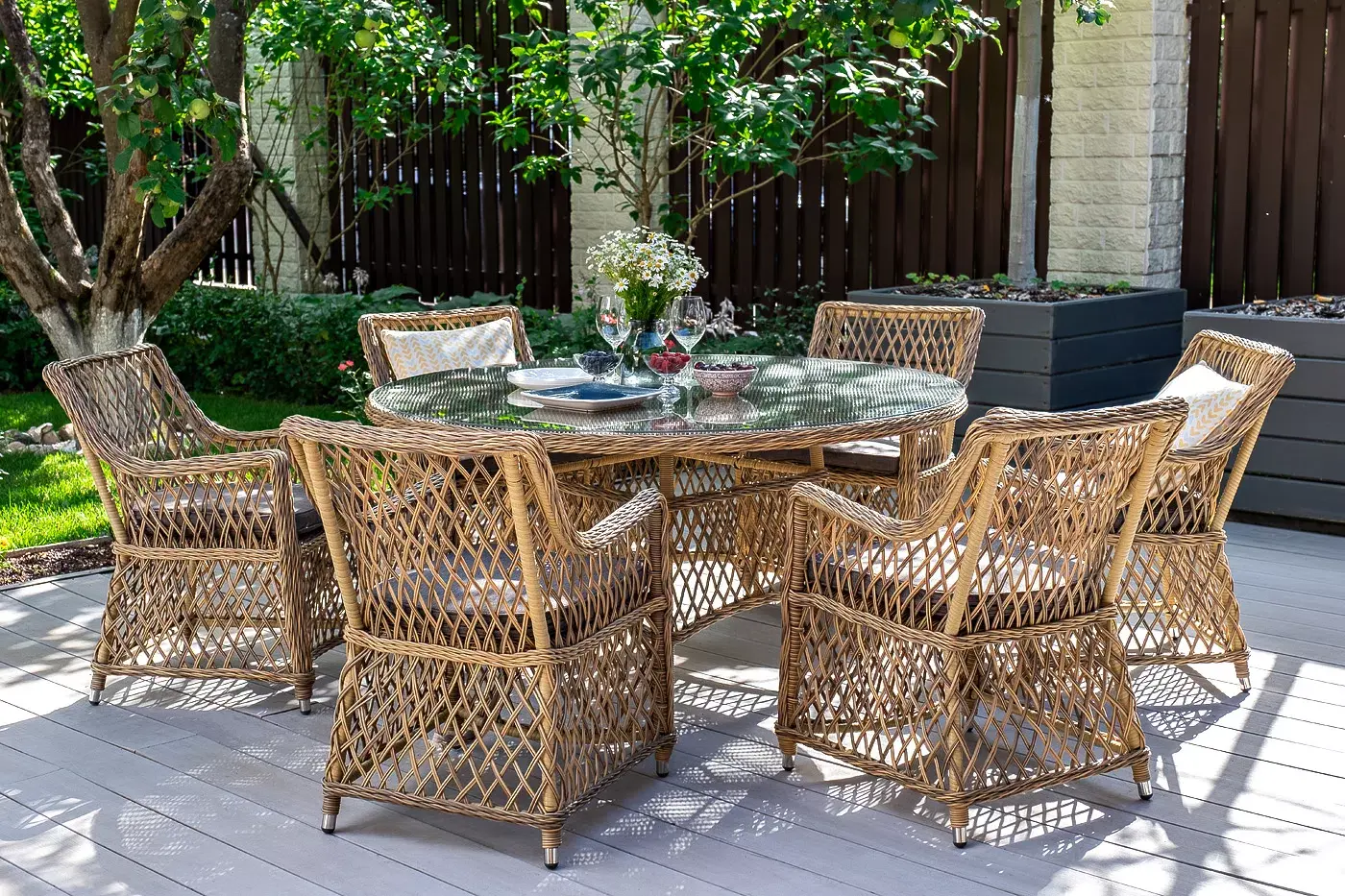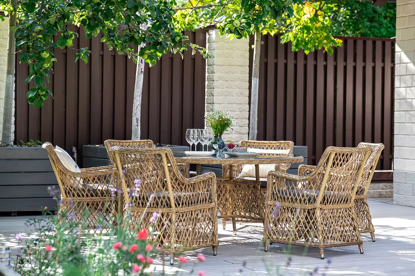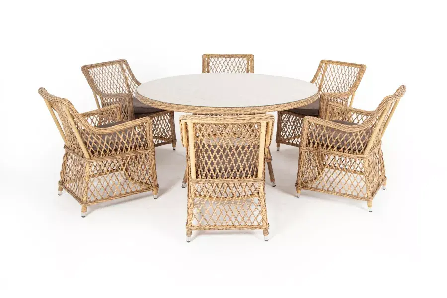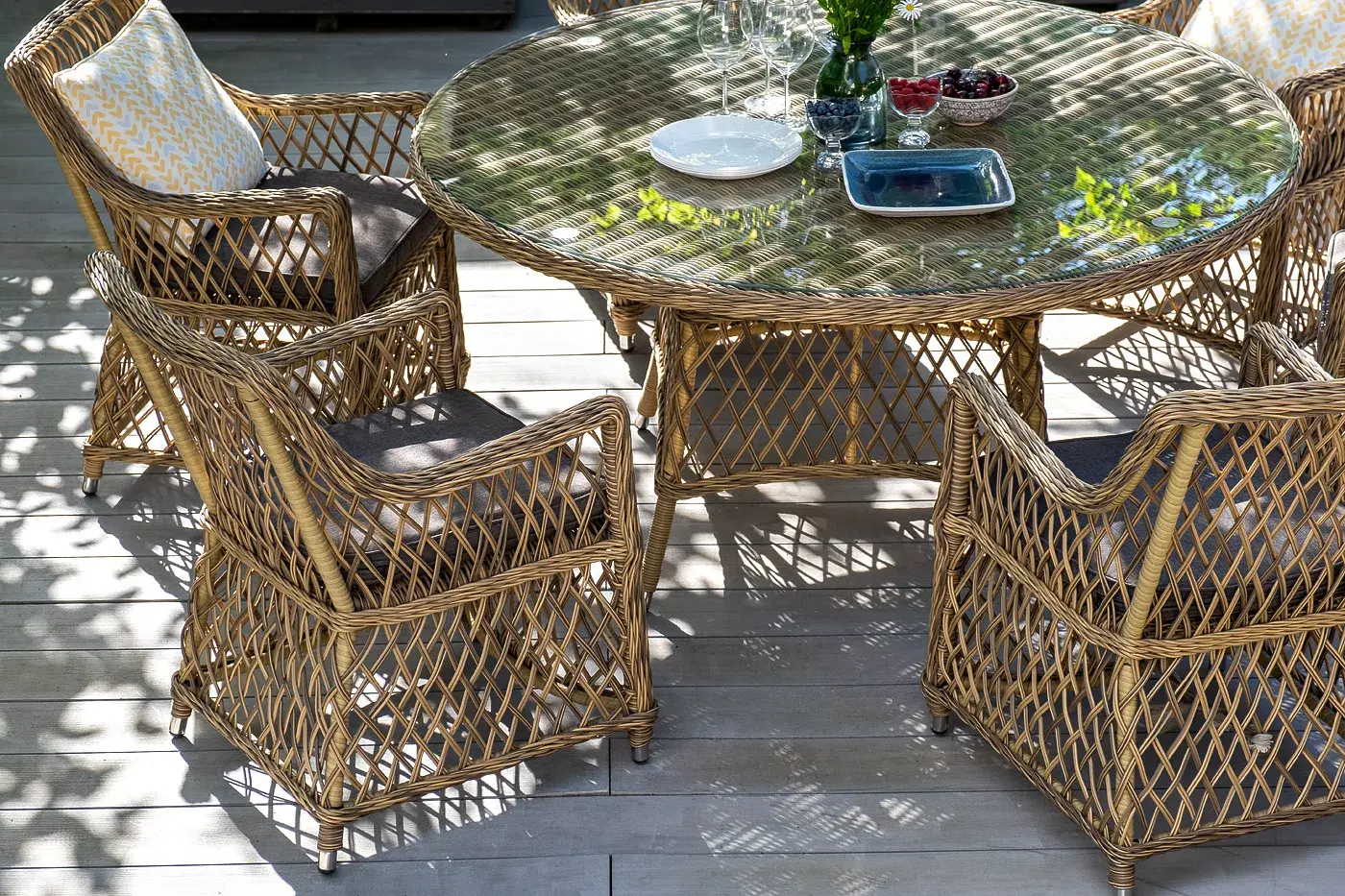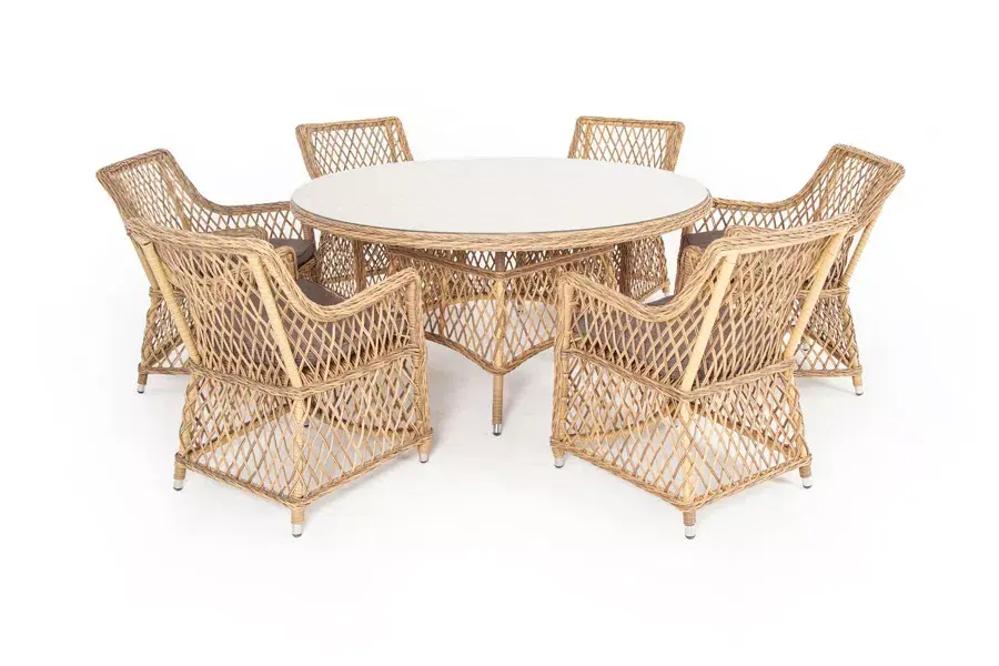 Вся мебель изготовлена из долговечного и легкого алюминия, обтянутого синтетическим ротангом. На столе для удобства эксплуатации предусмотрена столешница из ударопрочного закаленного стекла 5 мм. Стулья укомплектованы подушками на сидениях.