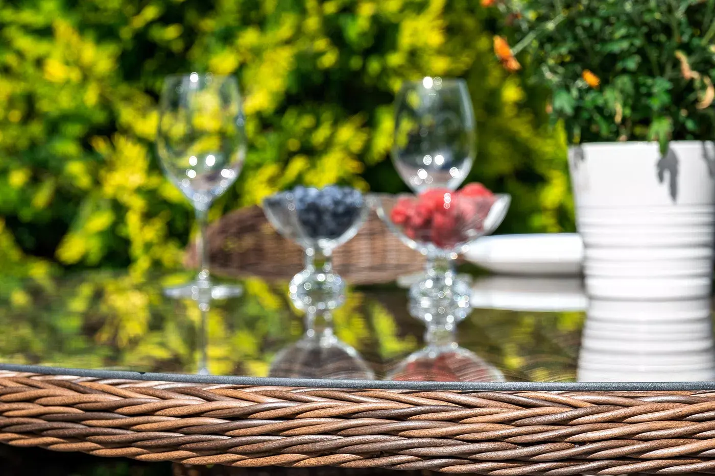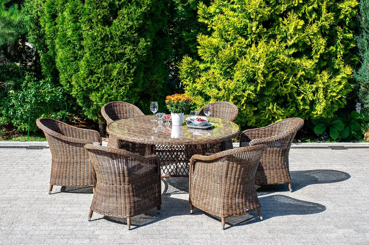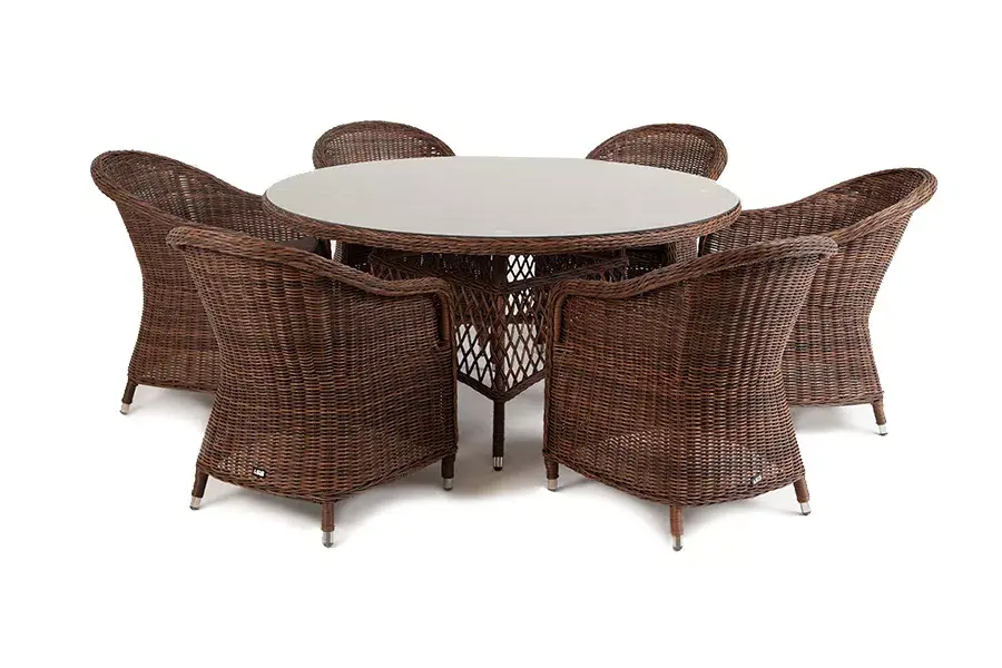 Вся мебель изготовлена из долговечного и легкого алюминия, обтянутого синтетическим ротангом. На столе для удобства эксплуатации предусмотрена столешница из ударопрочного закаленного стекла 5 мм. Стулья укомплектованы подушками на сидениях.