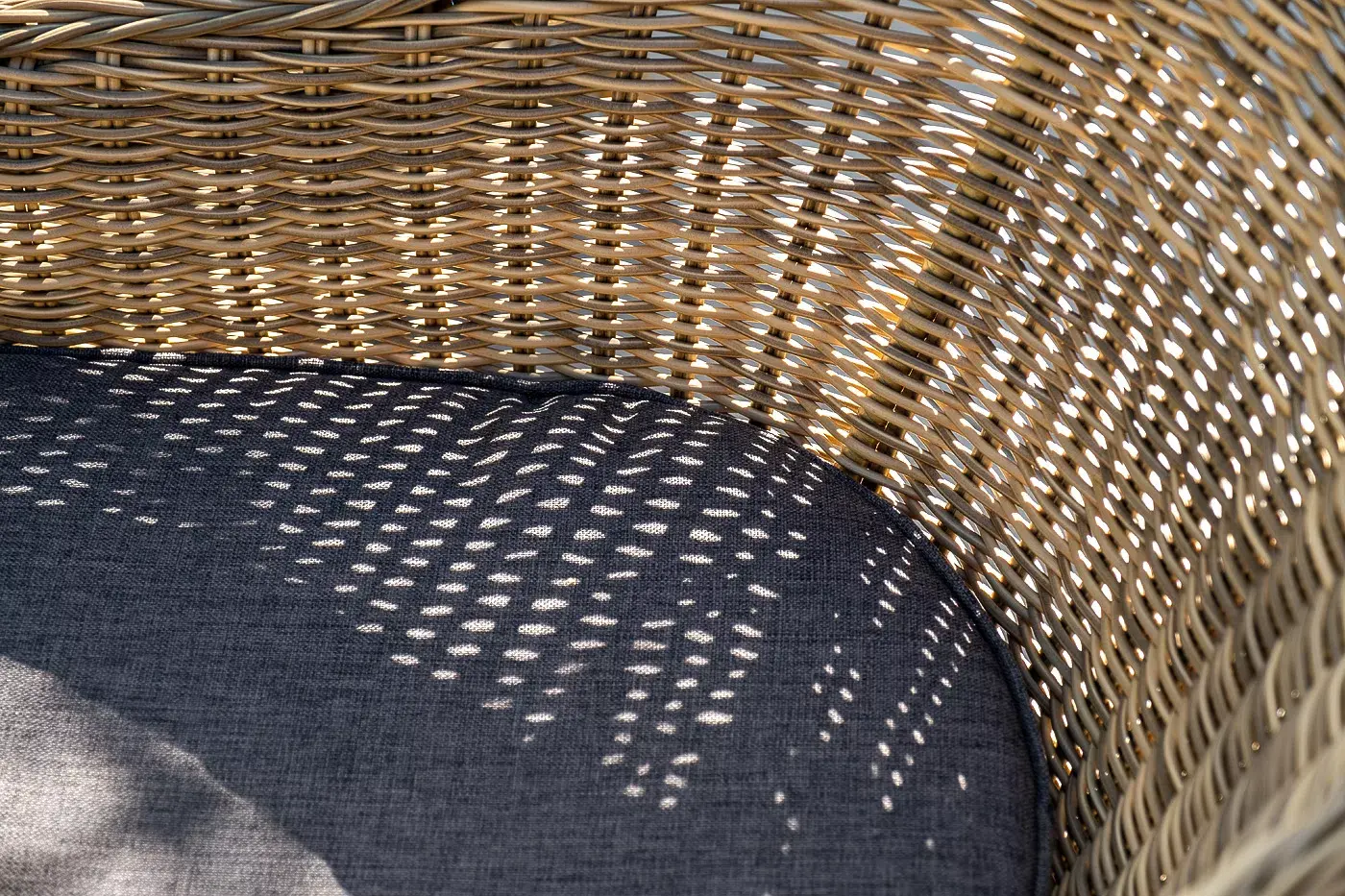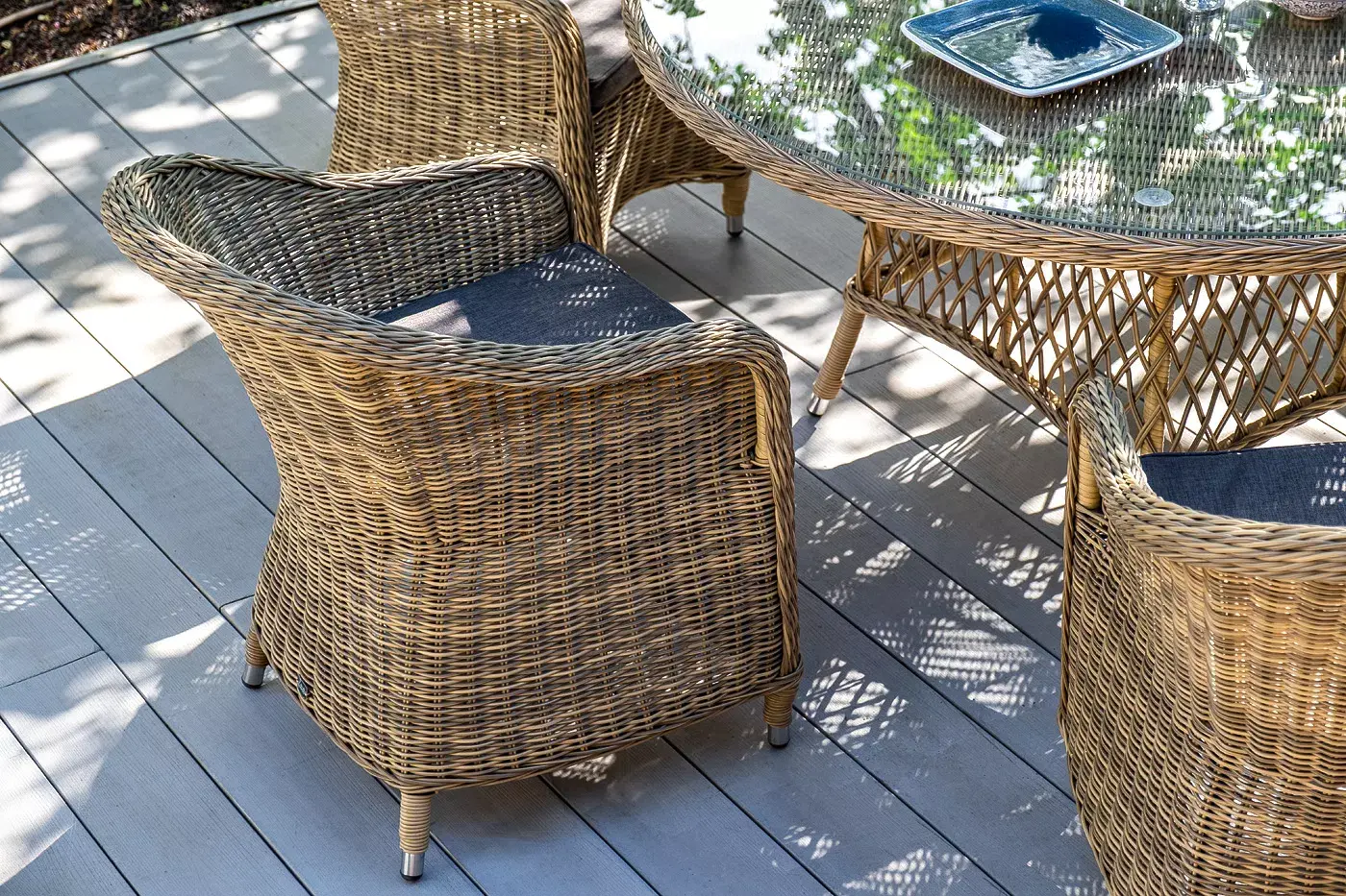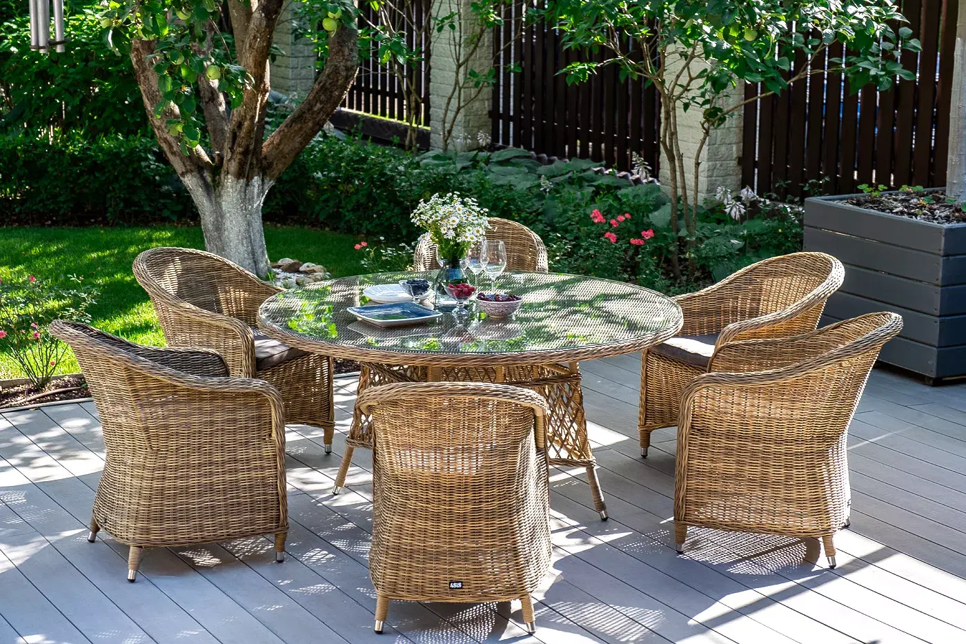 Вся мебель изготовлена из долговечного и легкого алюминия, обтянутого синтетическим ротангом. На столе для удобства эксплуатации предусмотрена столешница из ударопрочного закаленного стекла 5 мм. Стулья укомплектованы подушками на сидениях.
