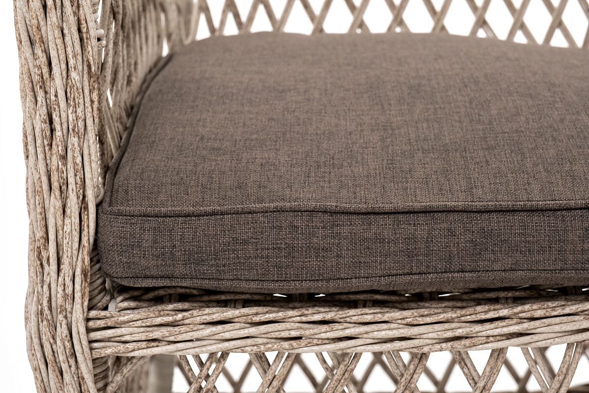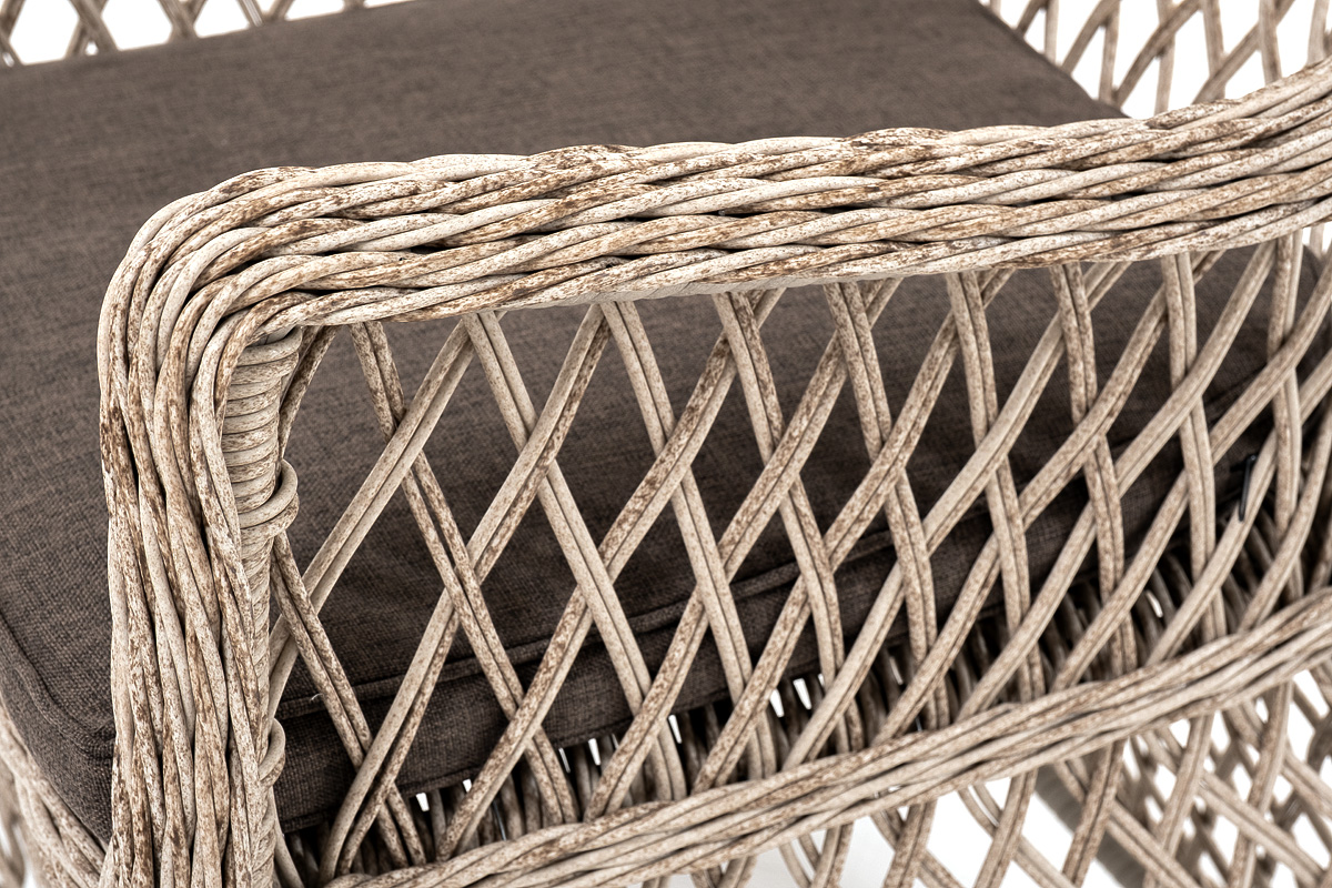 В плетеный комплект входит круглый стол «Эспрессо» диаметром 80 см с ударопрочной стеклянной столешницей и 2 кресла коллекции «Латте» 550×660×850 мм.