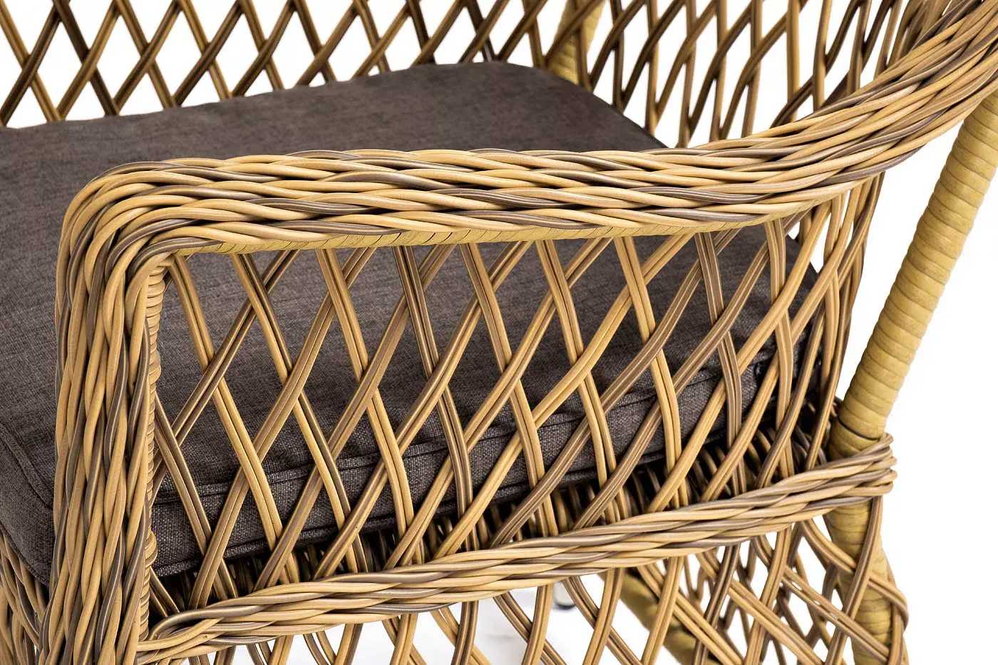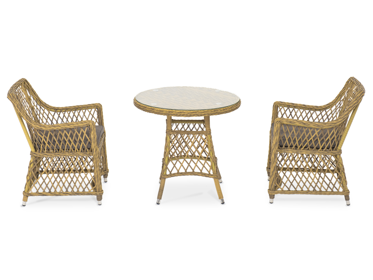 В плетеный комплект входит круглый стол «Эспрессо» диаметром 80 см с ударопрочной стеклянной столешницей и 2 кресла коллекции «Латте» 550×660×850 мм.