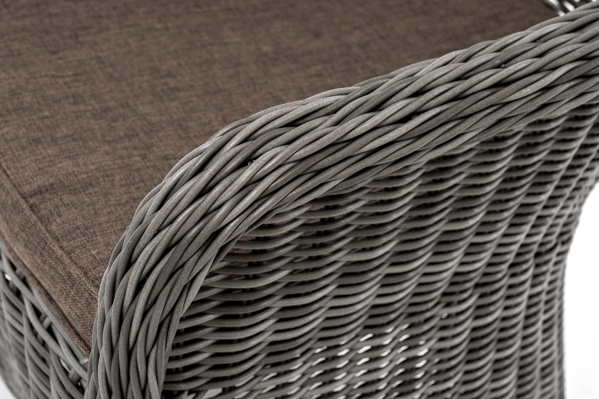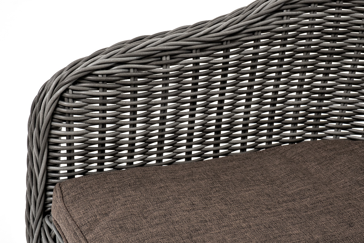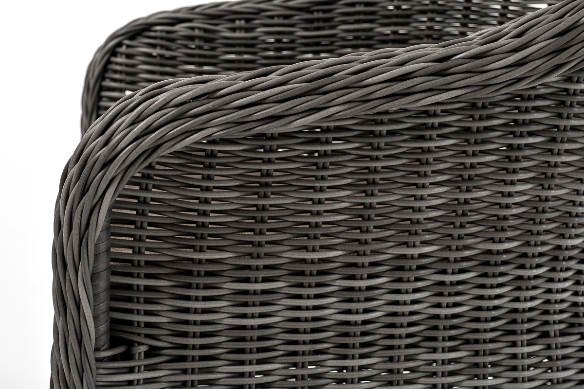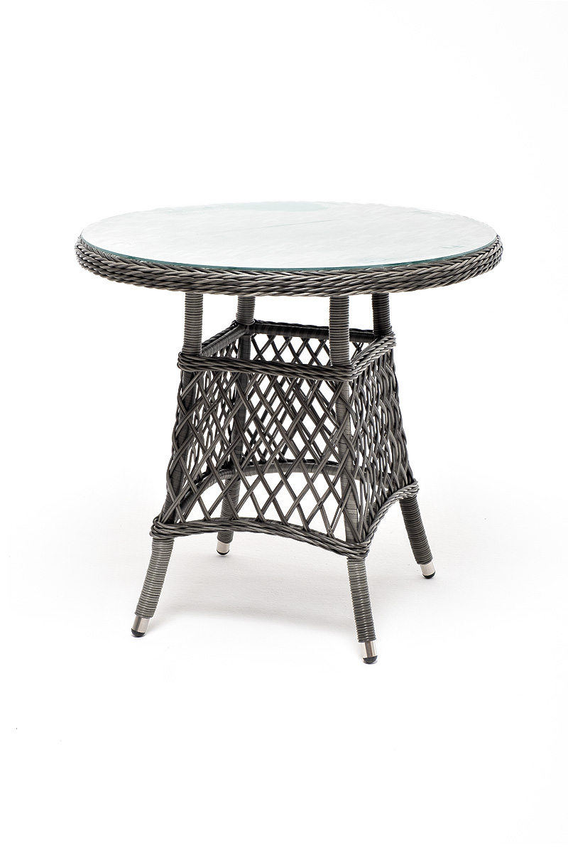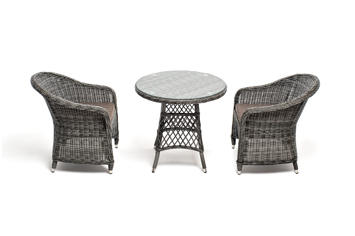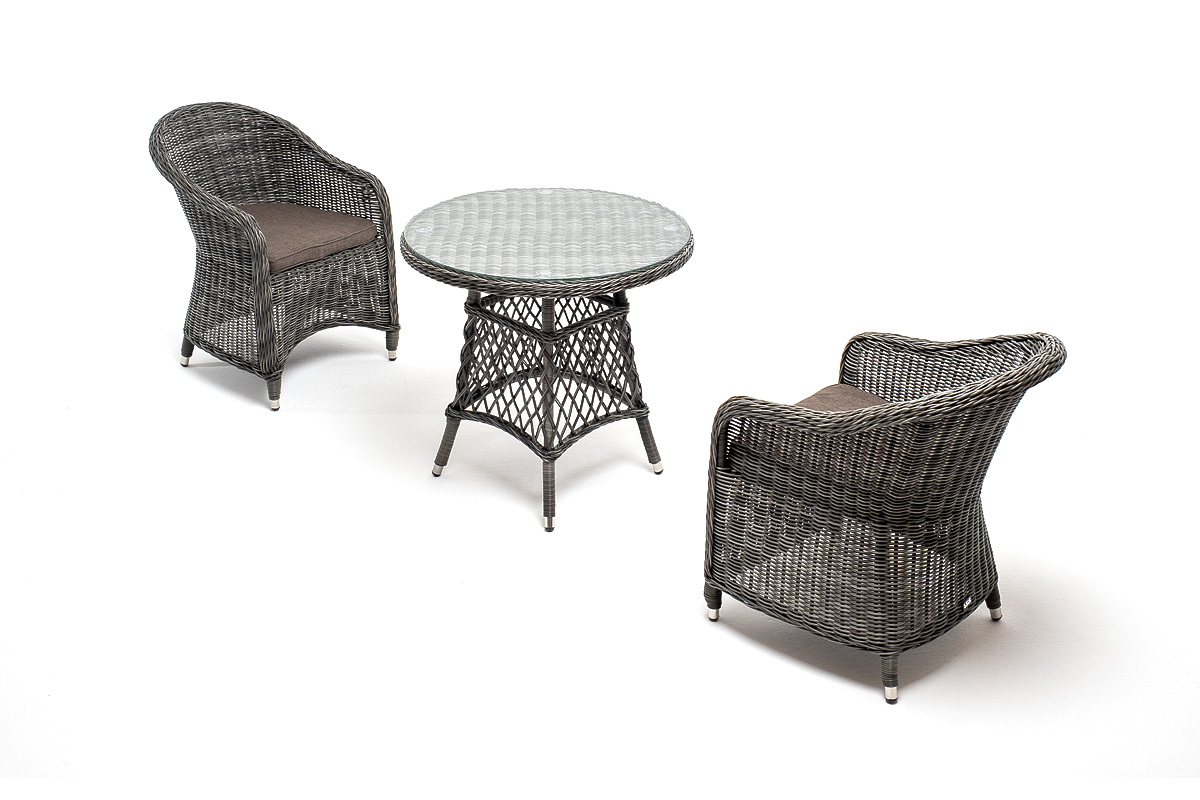 В плетеный комплект входит круглый стол «Эспрессо» диаметром 80 см с ударопрочной стеклянной столешницей и 2 кресла коллекции «Равенна» 570×680×810 мм.
