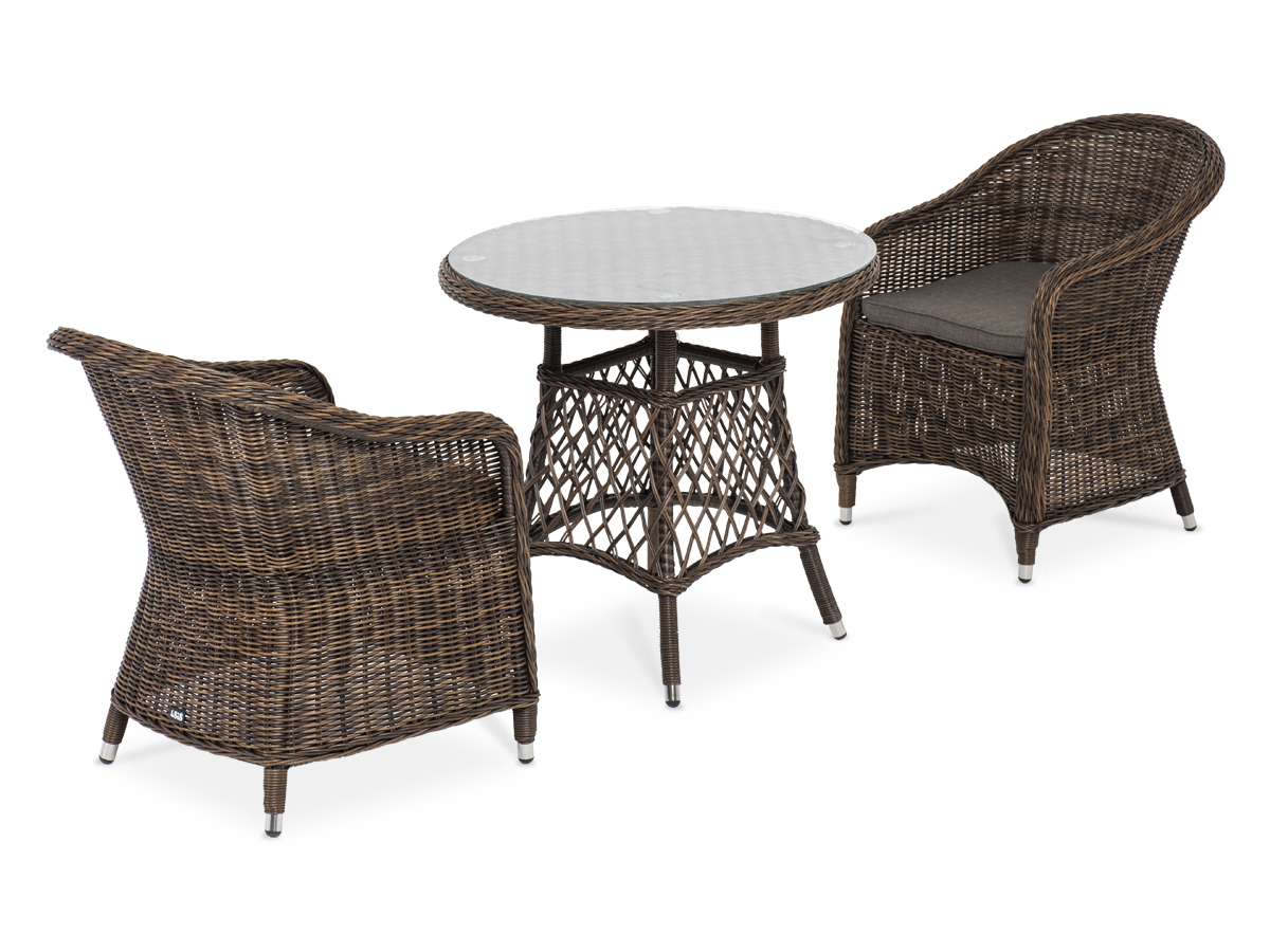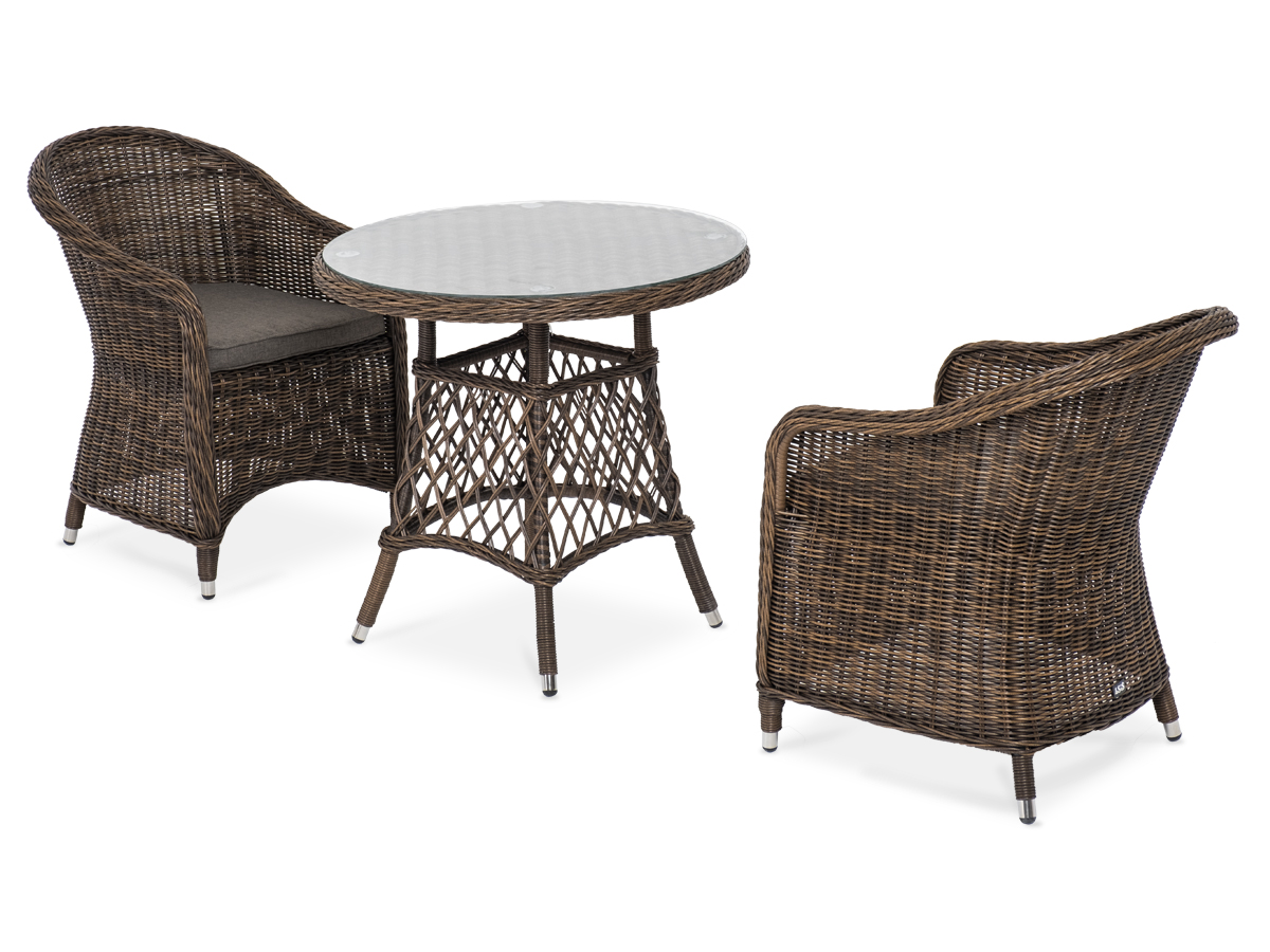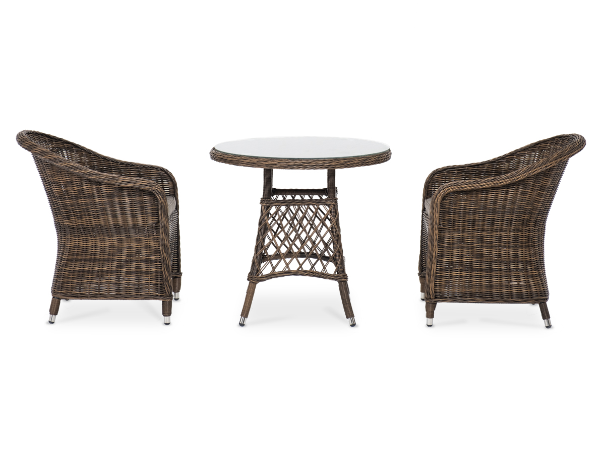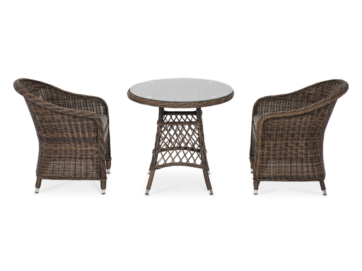В плетеный комплект входит круглый стол «Эспрессо» диаметром 80 см с ударопрочной стеклянной столешницей и 2 кресла коллекции «Равенна» 570×680×810 мм.