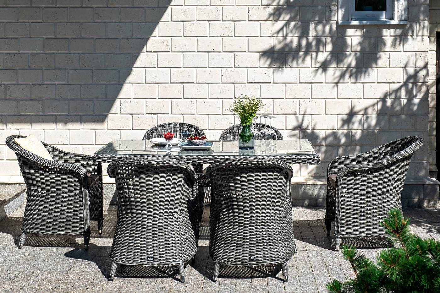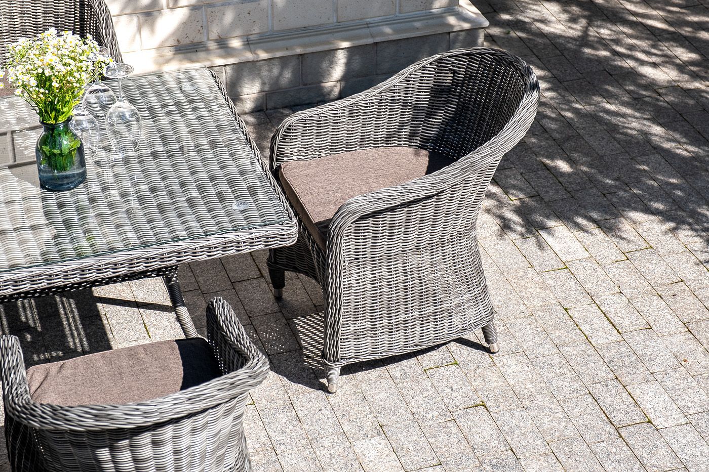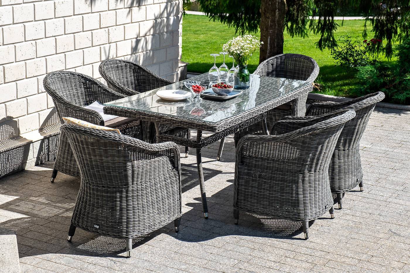 Стеклянная столешница, толщиной 5 мм, идет в комплекте со столом. Подушки на плетеных стулья со съёмными чехлами и водоотталкивающей пропиткой.