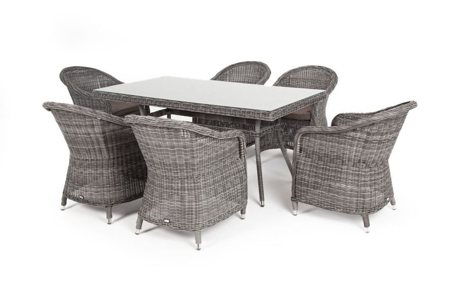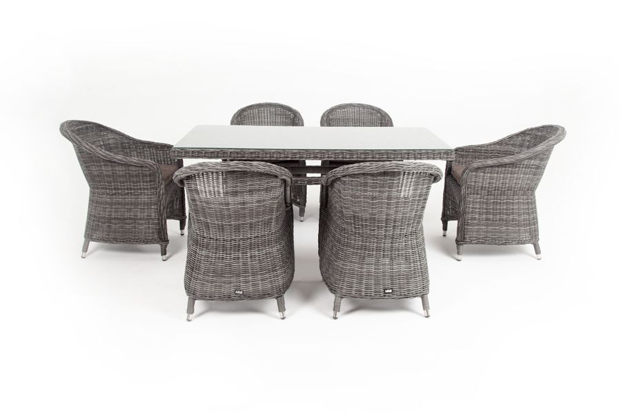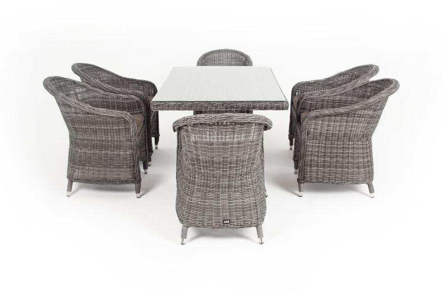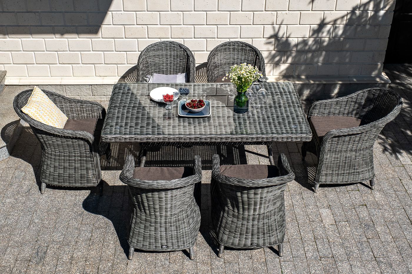 Стеклянная столешница, толщиной 5 мм, идет в комплекте со столом. Подушки на плетеных стулья со съёмными чехлами и водоотталкивающей пропиткой.