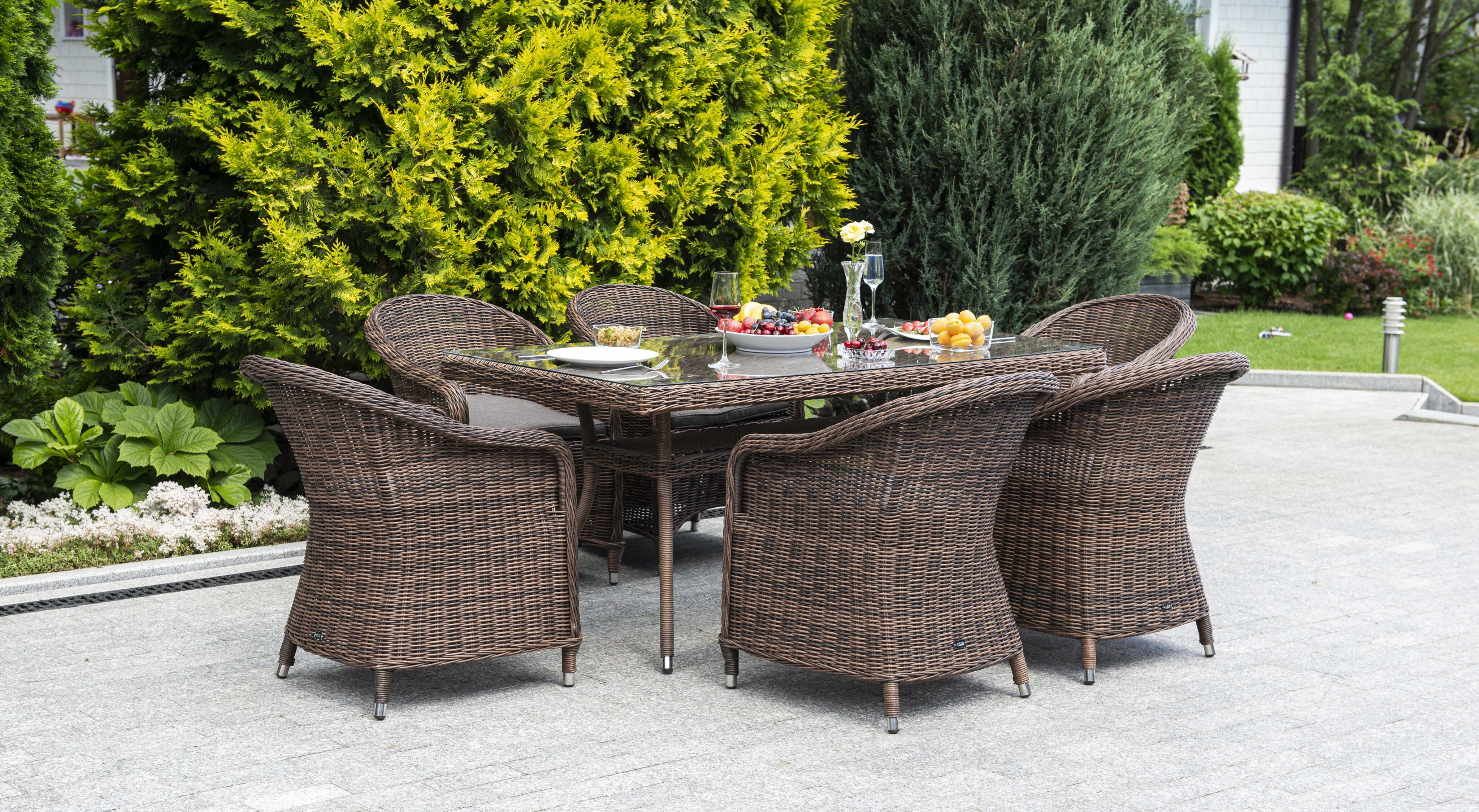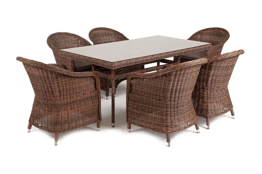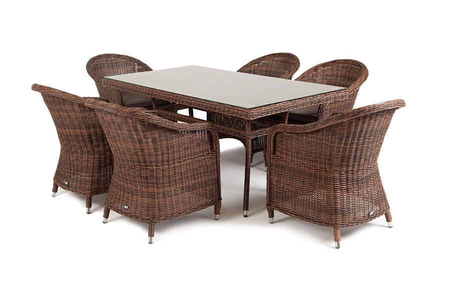 Премиальная обеденная группа для сада, веранды ресторана «Эспрессо» для большой компании. В набор входит большой прямоугольный стол «Латте», размером - 1600×900×750 мм и 6 кресел «Равенна», размер - 570×680×810 мм, в насыщенном коричневом оттенке.