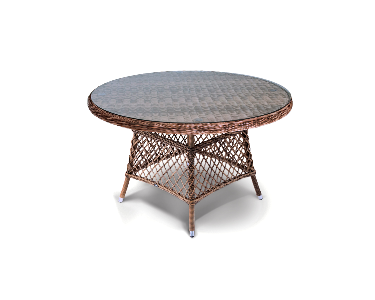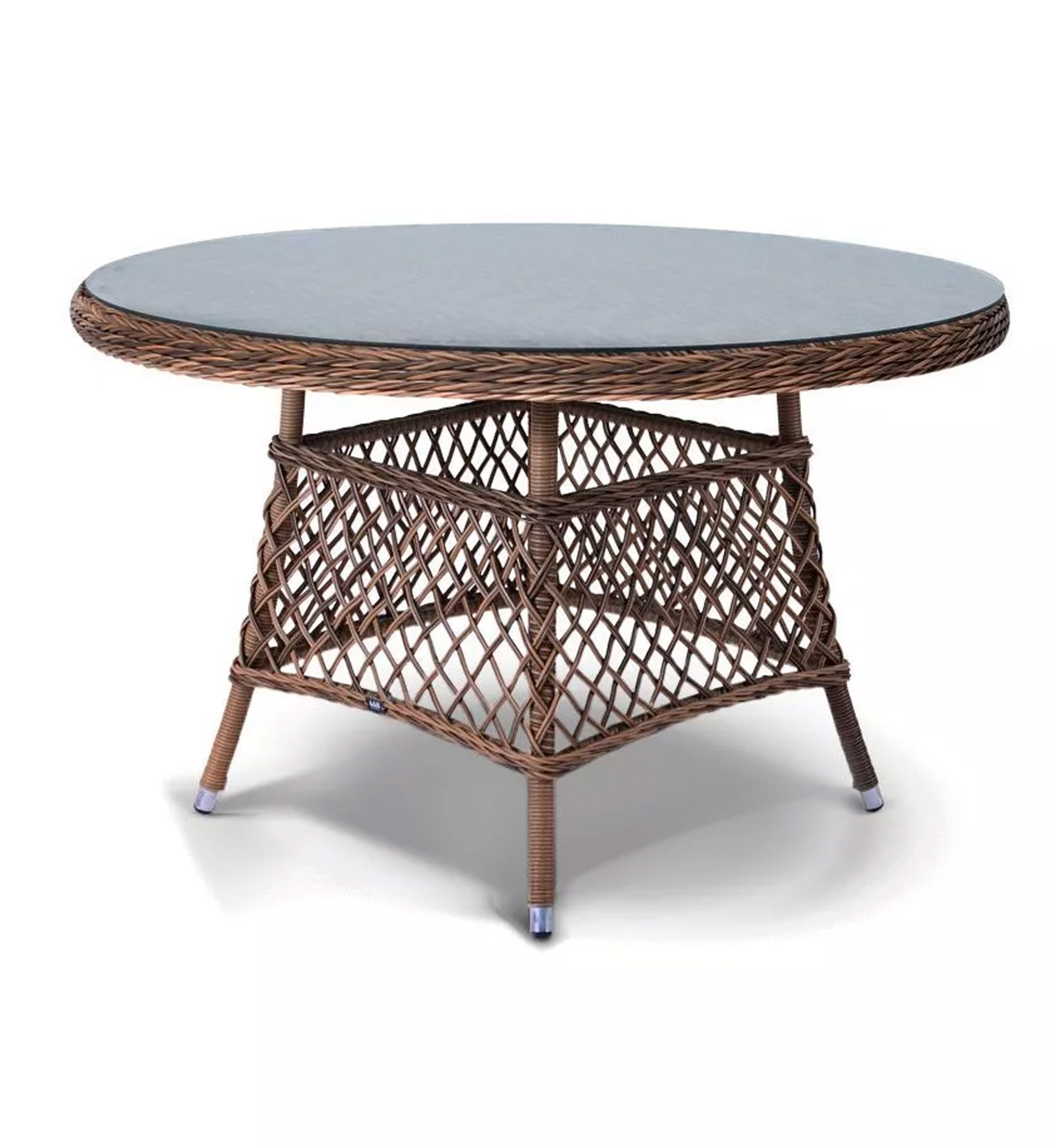 Каркас стола изготовлено из алюминия, благодаря чему его легко перемещать. Металл оплетен синтетическим ротангом круглого ручного плетения насыщенного шоколадного оттенка. Столешница – стекло, устойчивое к механическим повреждениям и высоким температурам.