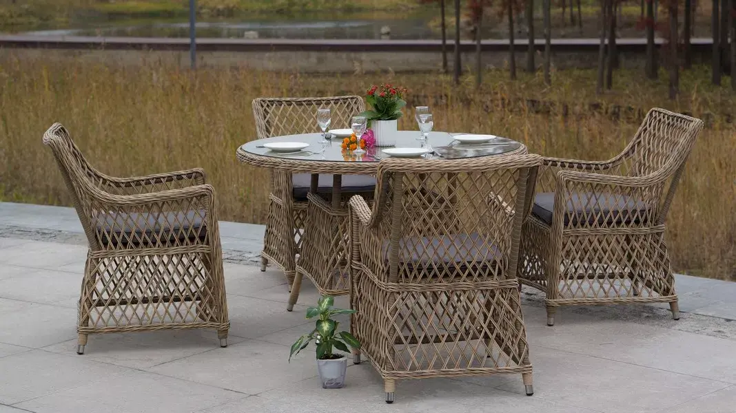 Столешница покрыта прочным стеклом, толщиной 5 мм. Благодаря высокопрочным материалам, обеденный стол очень практичный и подходит для всесезонного использования даже на улице.