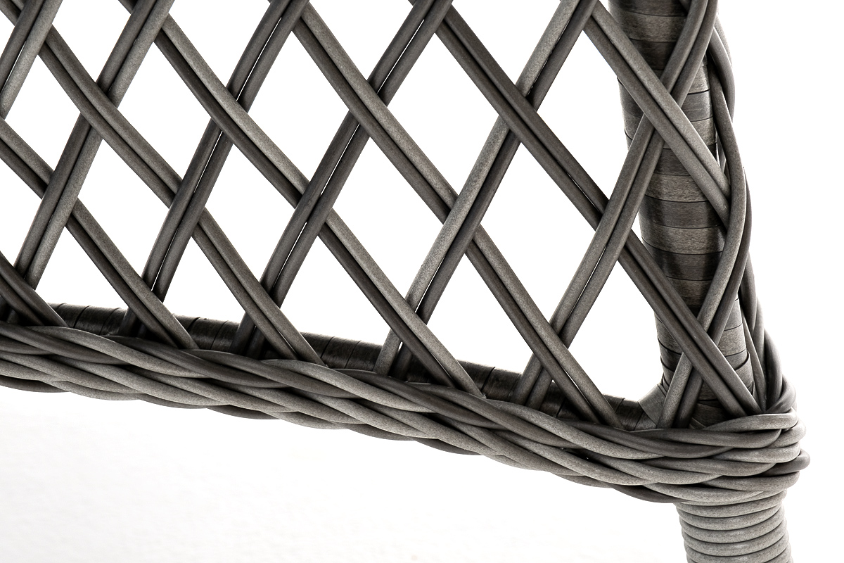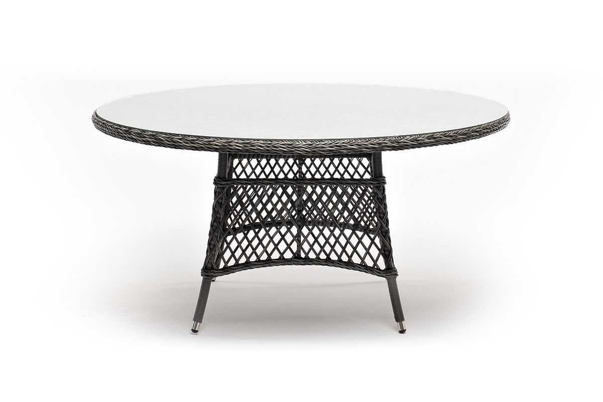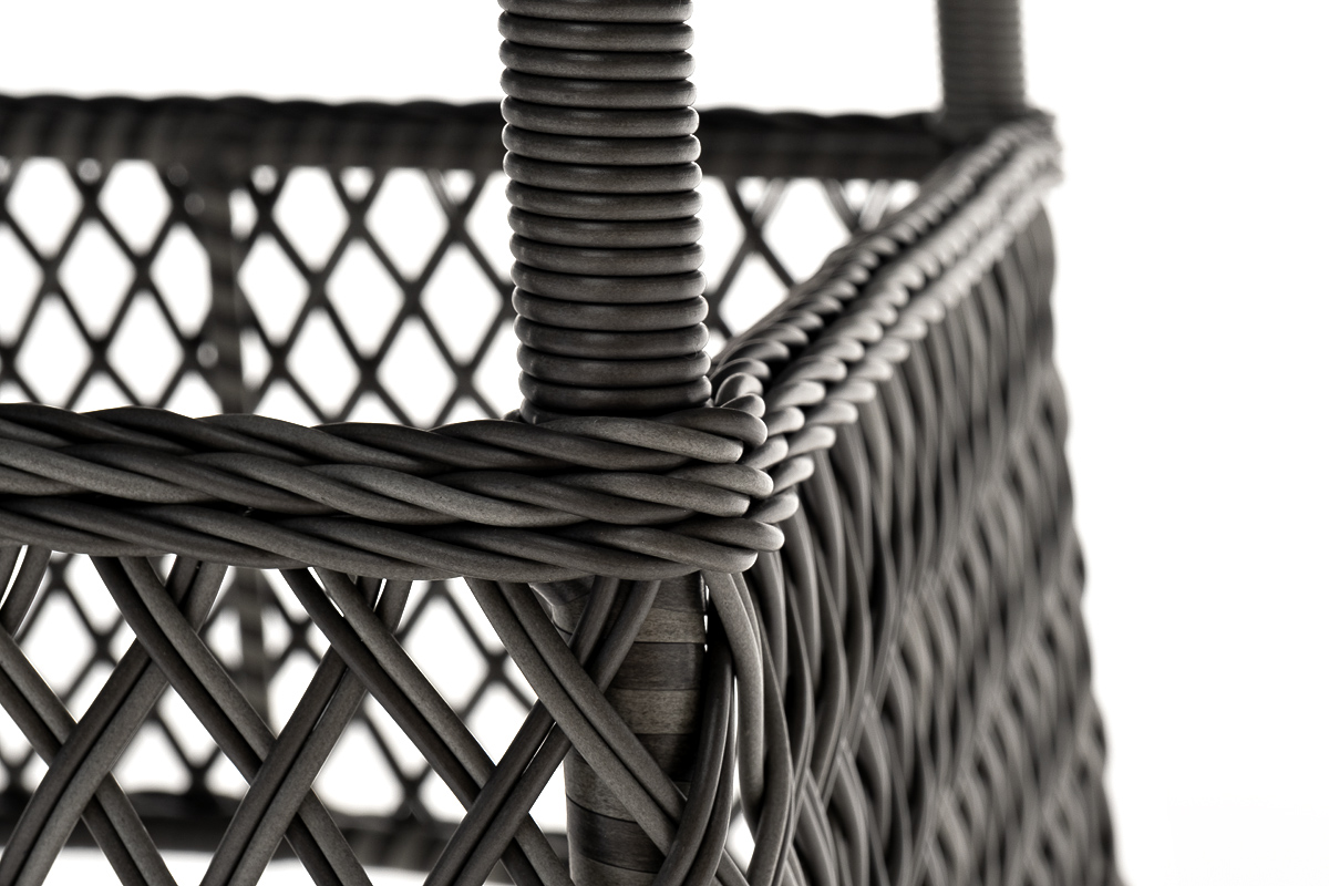 В качестве основания выступает каркас, выполненный из алюминия и оплетён круглым искусственным ротангом графитового цвета. Рабочую плоскость покрывает 5 мм столешница из ударопрочного закаленного стекла.