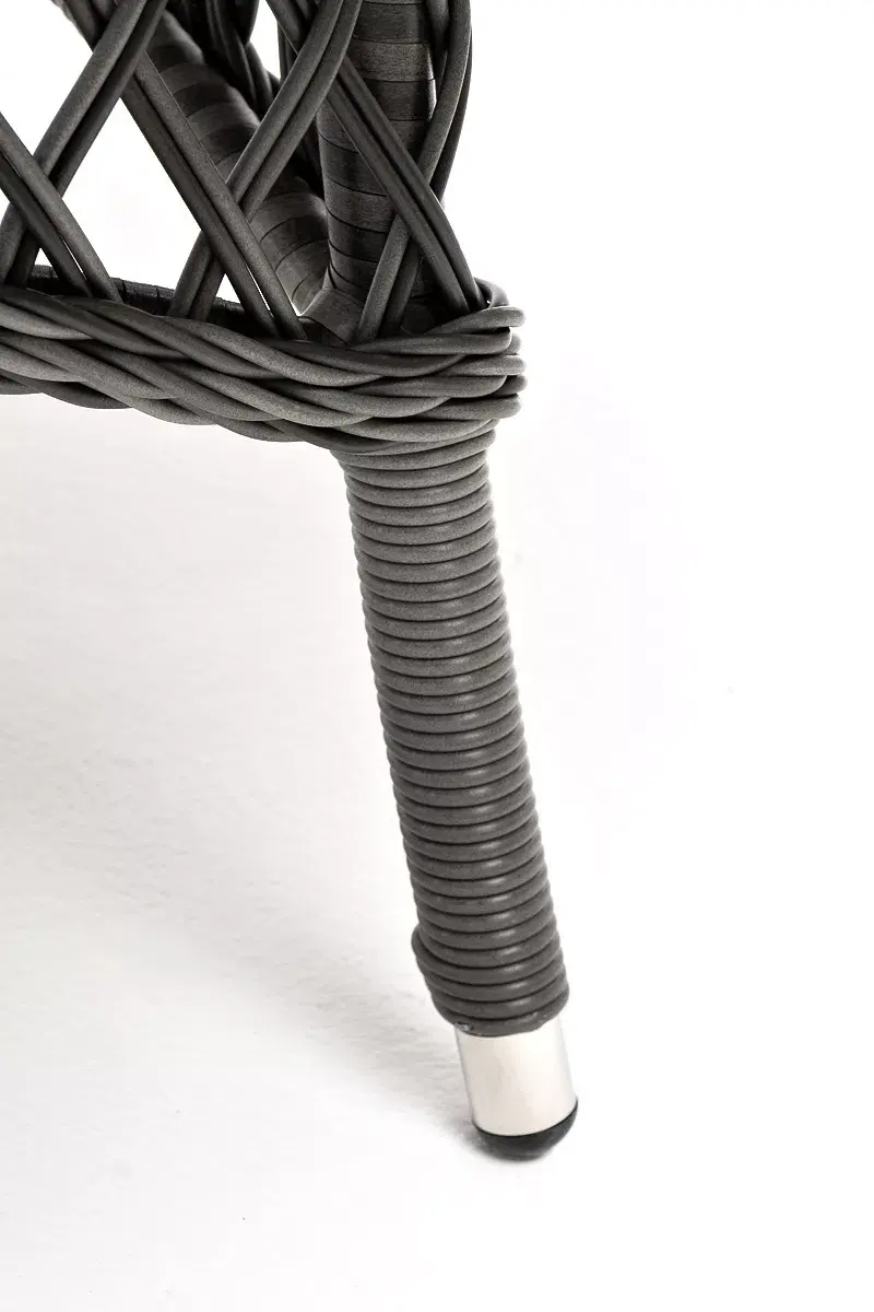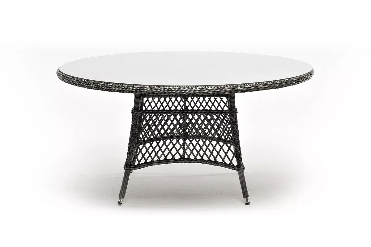 В качестве основания выступает каркас, выполненный из алюминия и оплетён круглым искусственным ротангом графитового цвета. Рабочую плоскость покрывает 5 мм столешница из ударопрочного закаленного стекла.