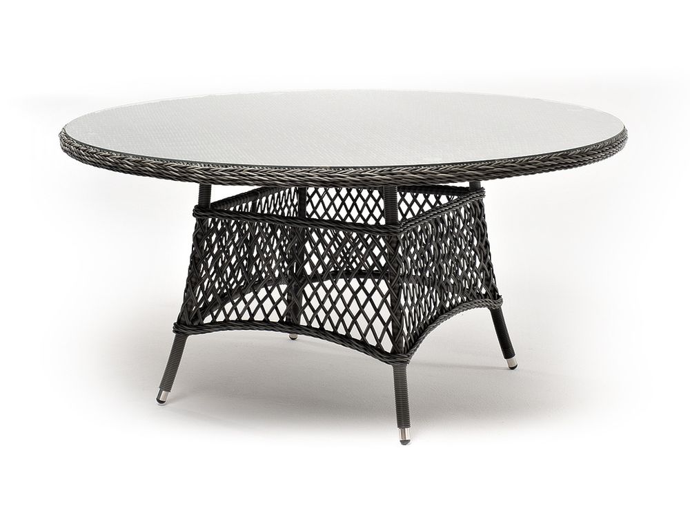 В качестве основания выступает каркас, выполненный из алюминия и оплетён круглым искусственным ротангом графитового цвета. Рабочую плоскость покрывает 5 мм столешница из ударопрочного закаленного стекла.