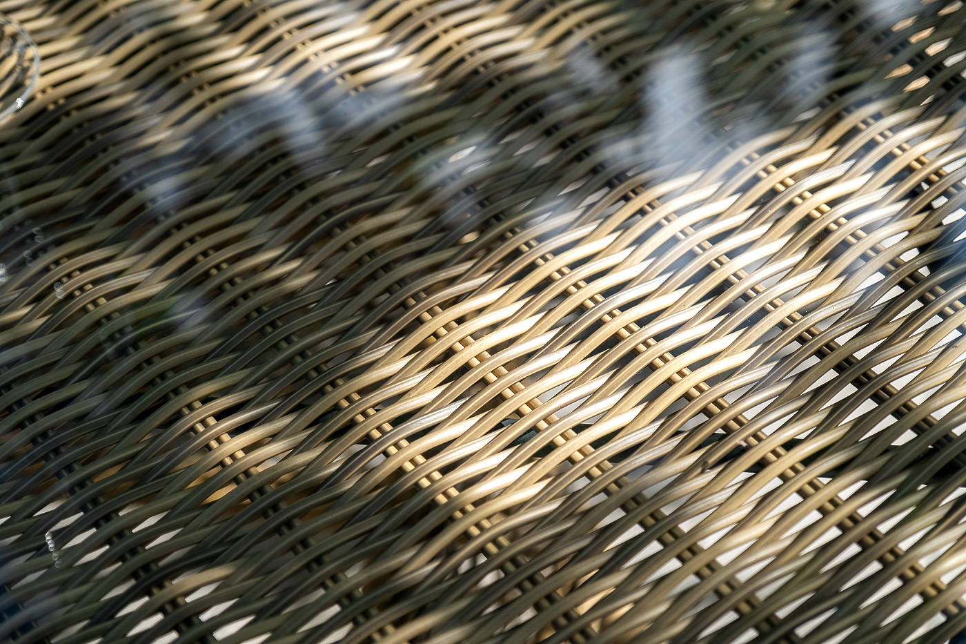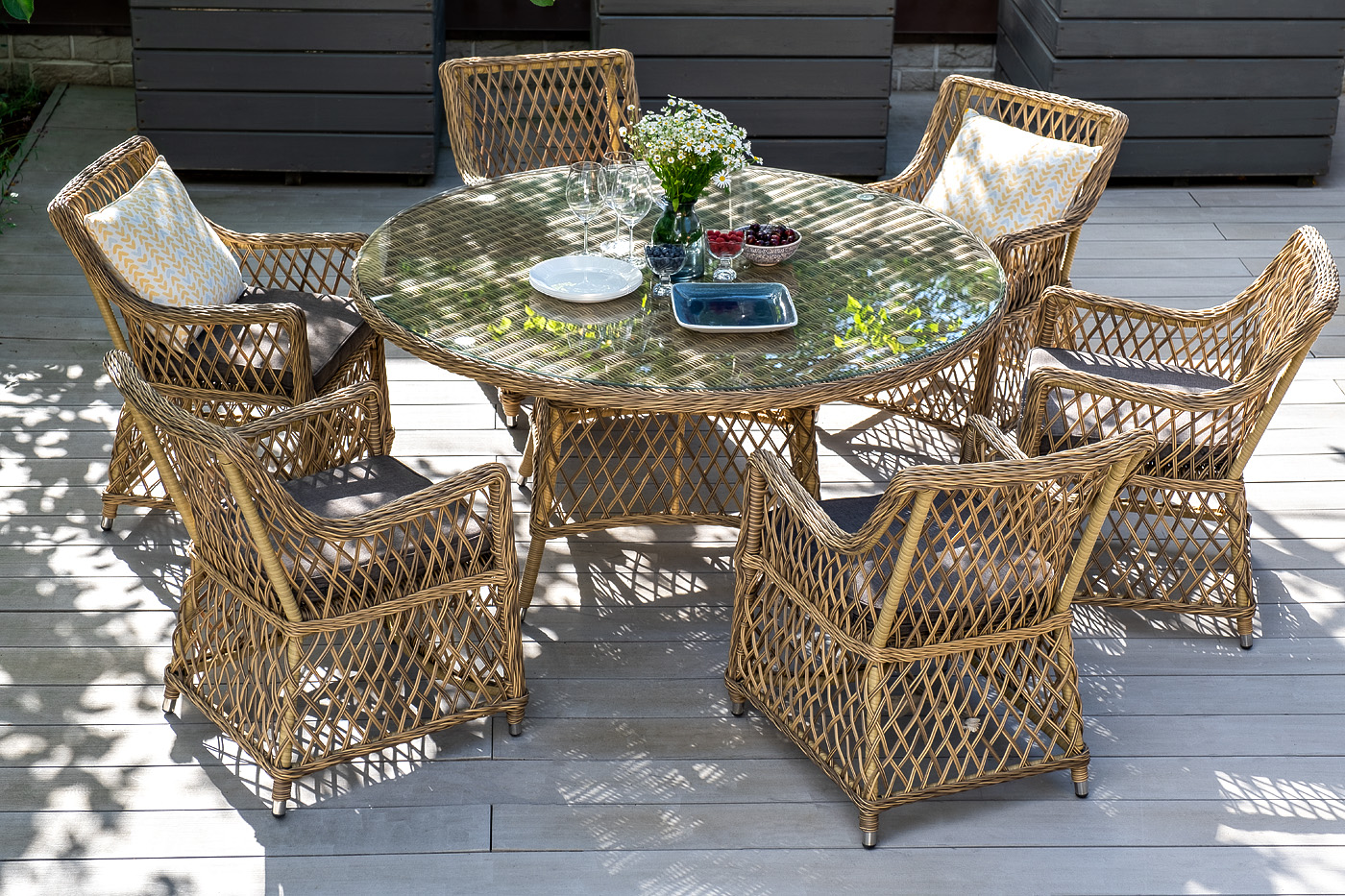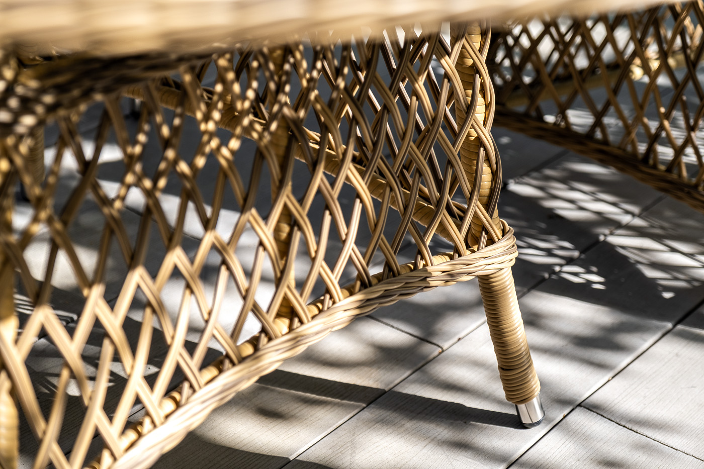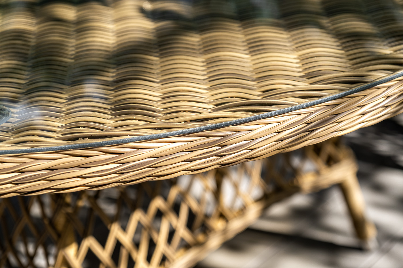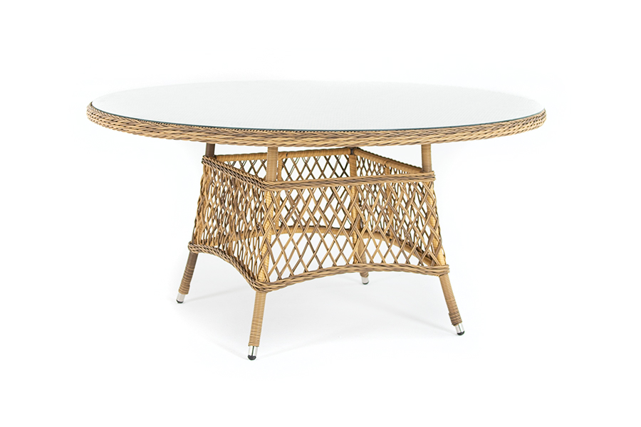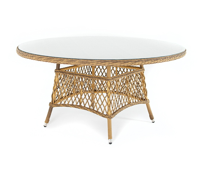 В качестве основания выступает каркас, выполненный из алюминия и оплетён круглым искусственным ротангом соломенного цвета. Рабочую плоскость покрывает 5 мм столешница из ударопрочного закаленного стекла.
