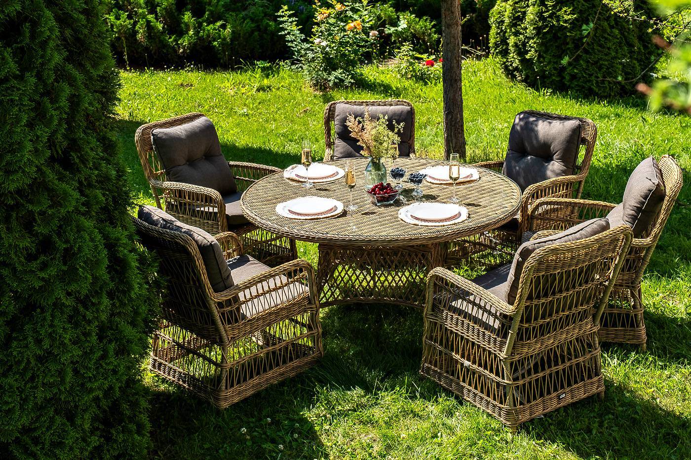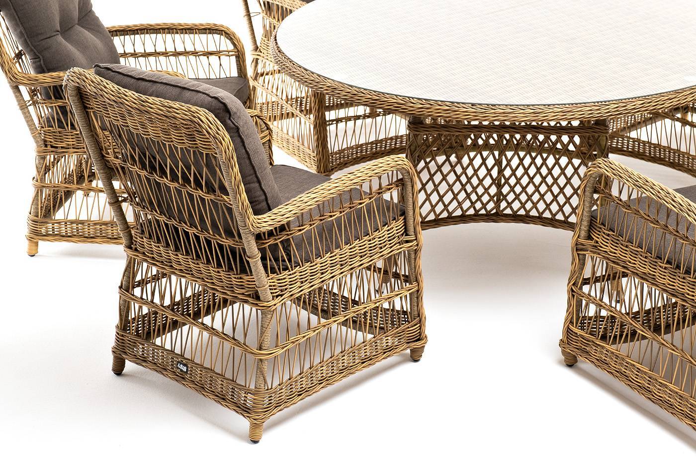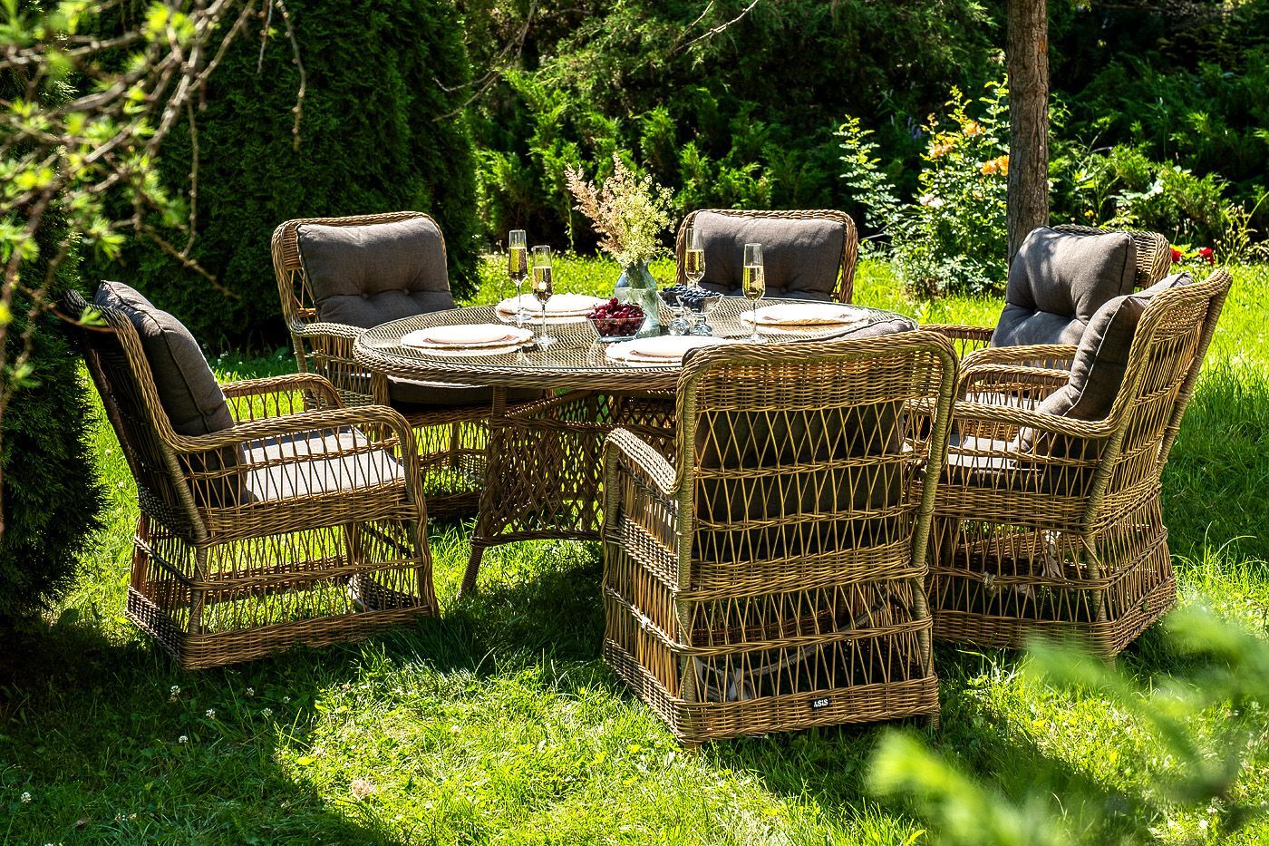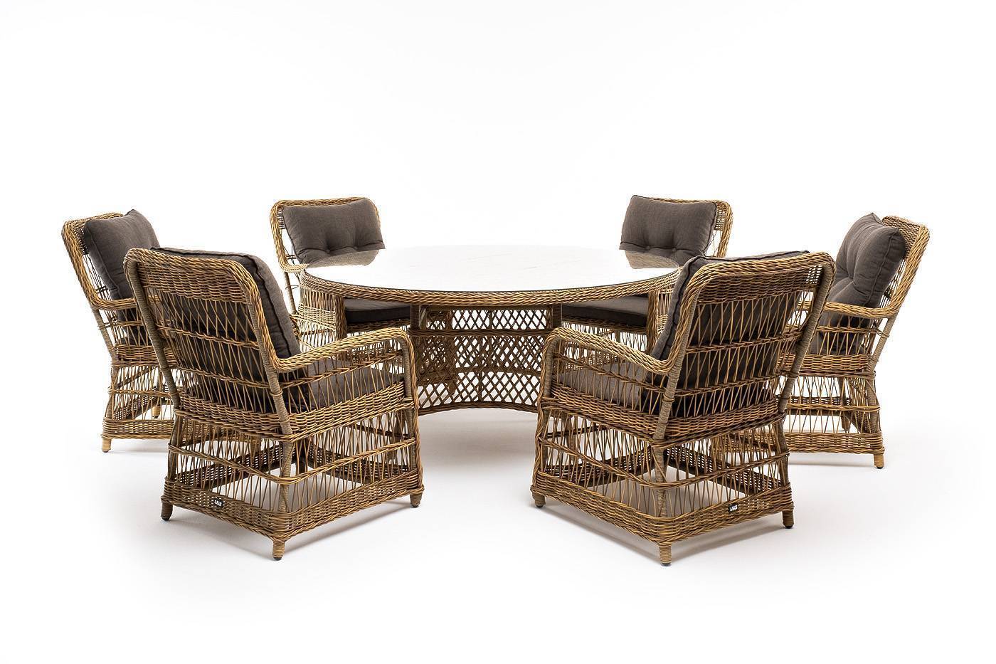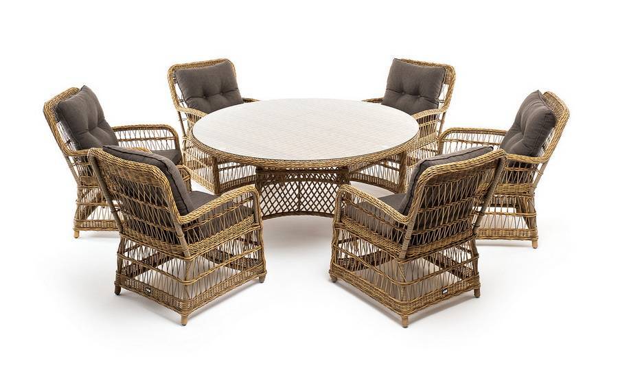 Обеденная группа на 6 персон «Эспрессо» из ротанга. В комплекте: большой круглый обеденный стол (1500×1500×750 мм.) и 6 кресел «Цесена» (600×800×910 мм).
