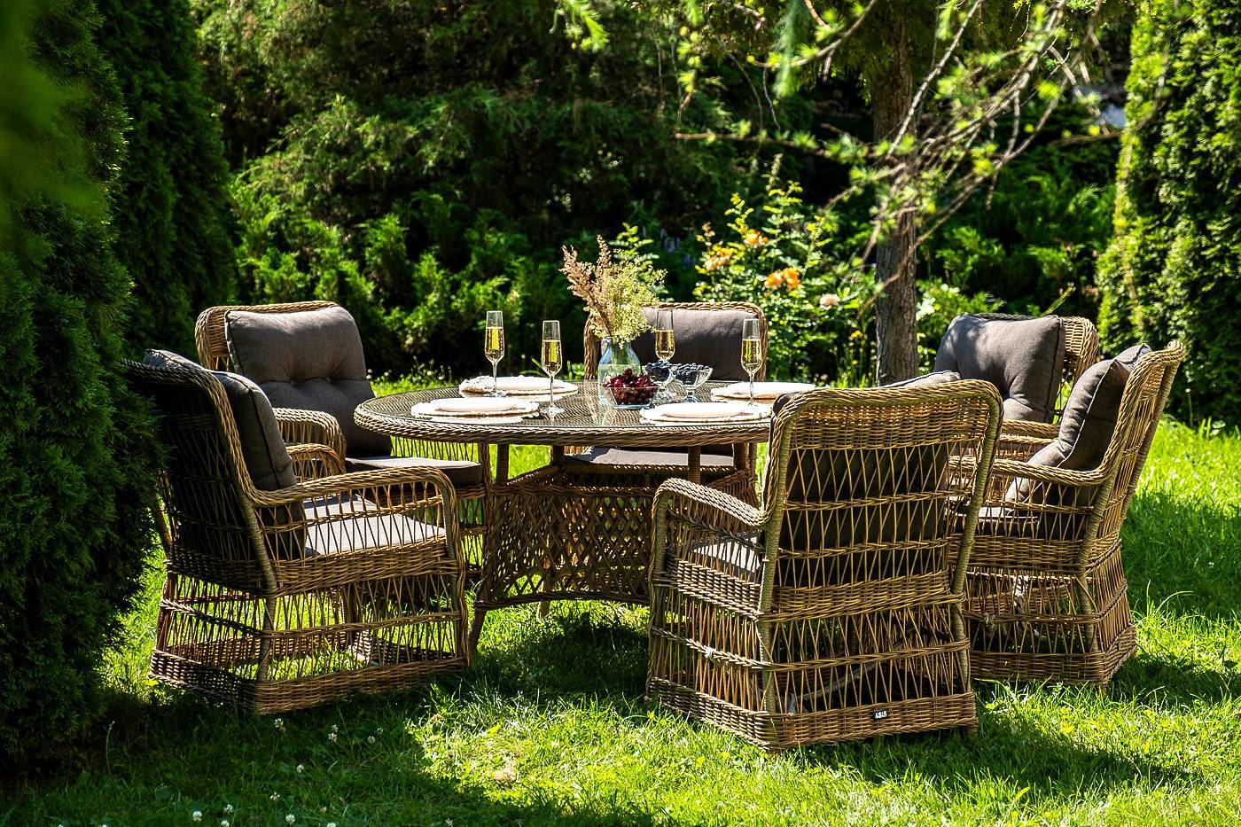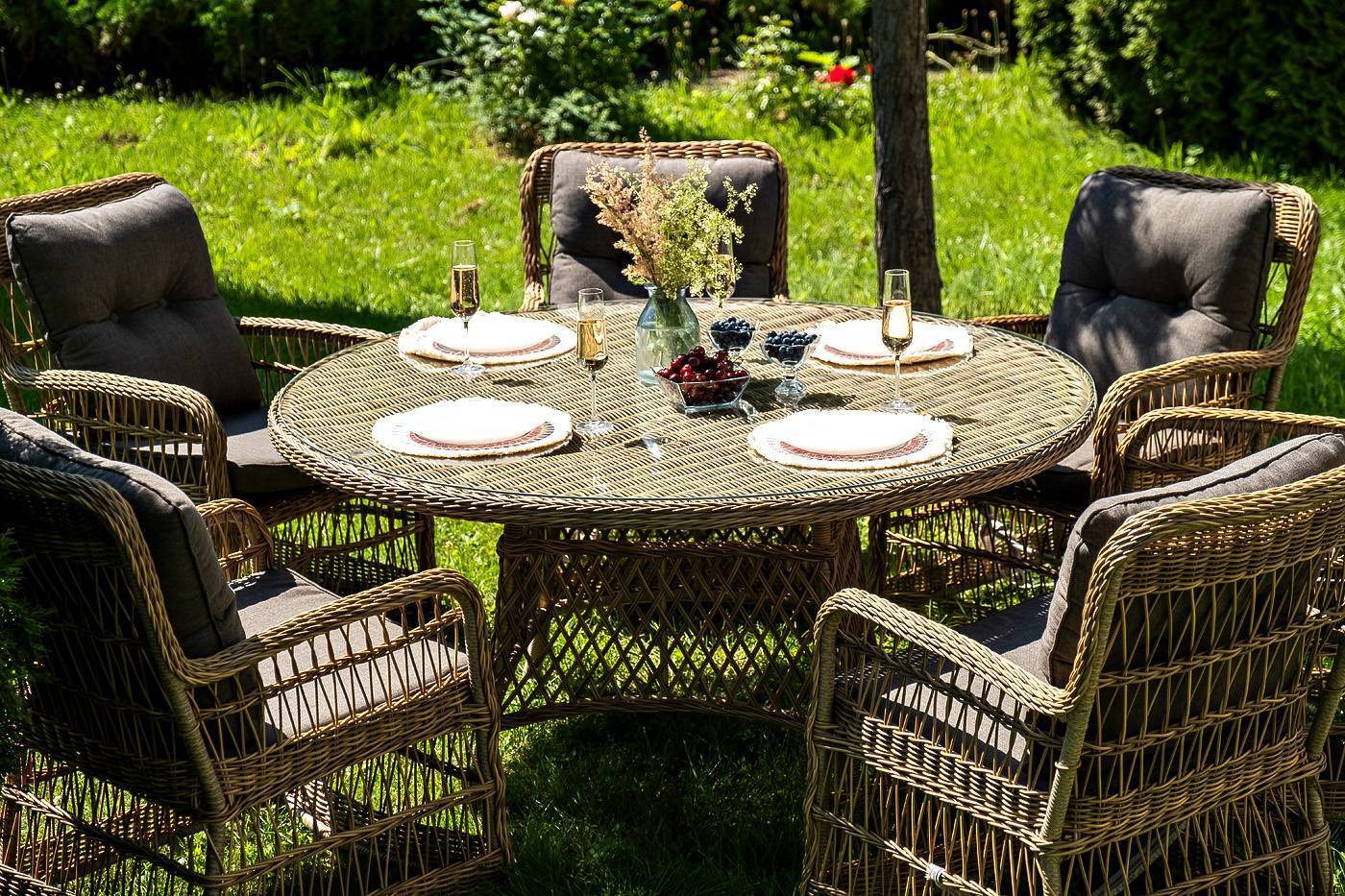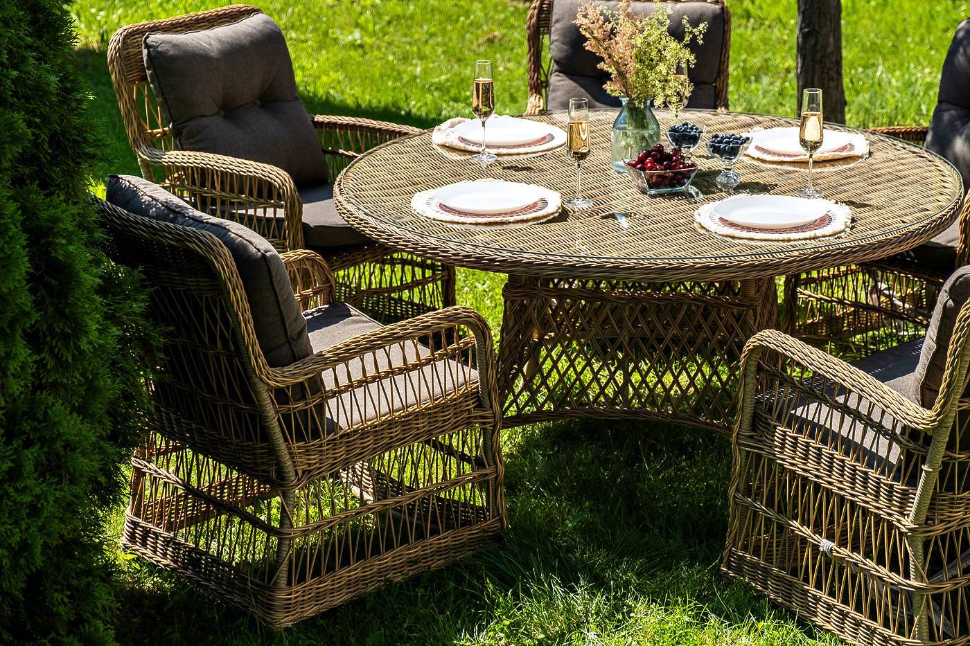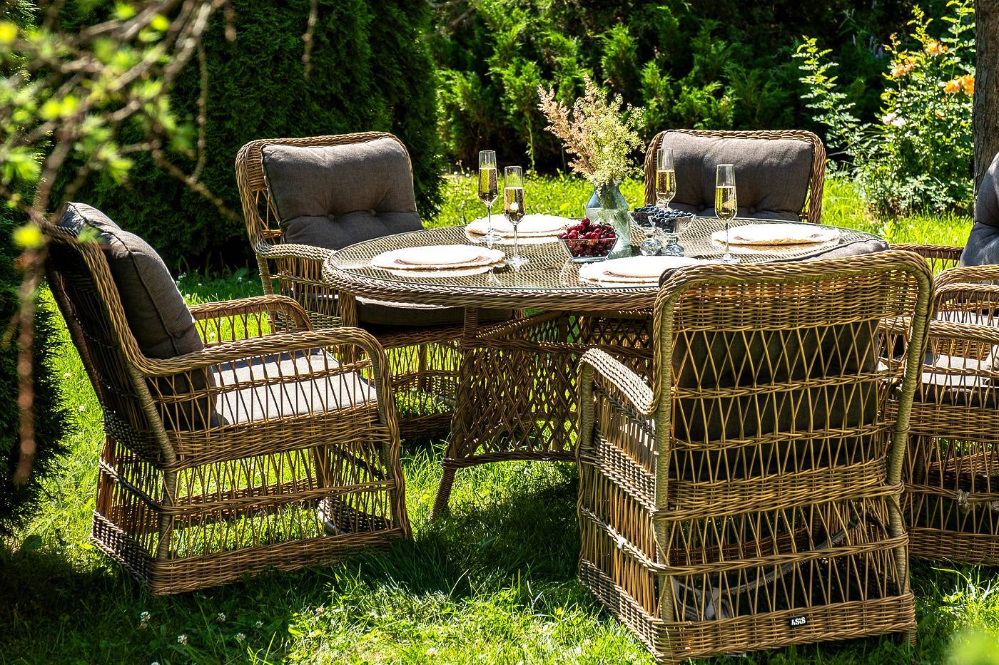 Обеденная группа на 6 персон «Эспрессо» из ротанга. В комплекте: большой круглый обеденный стол (1500×1500×750 мм.) и 6 кресел «Цесена» (600×800×910 мм).