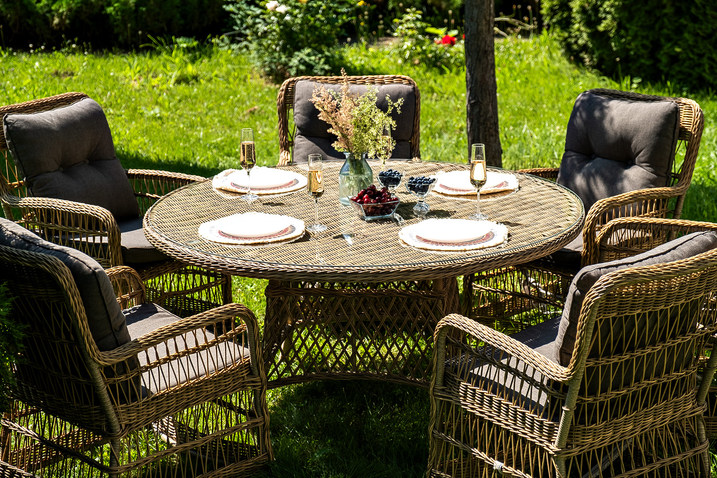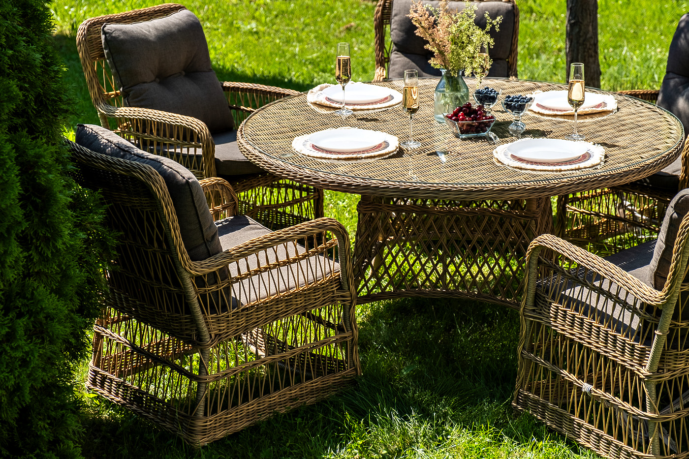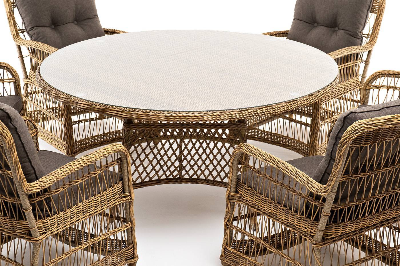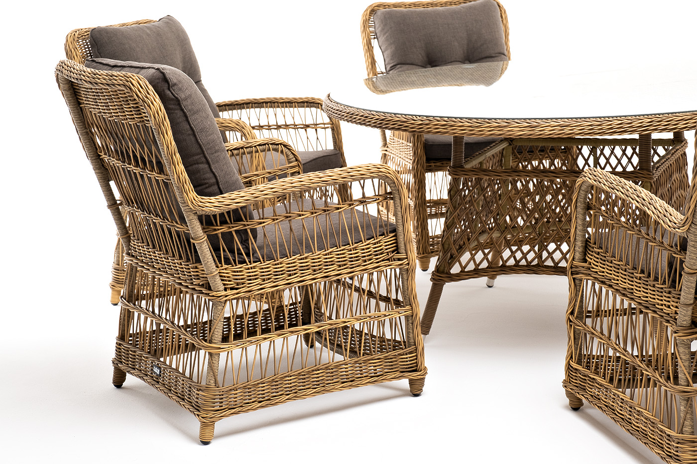 Вся мебель изготовлена из долговечного и легкого алюминия, обтянутого синтетическим ротангом. На столе для удобства эксплуатации предусмотрена столешница из ударопрочного закаленного стекла 5 мм. Стулья укомплектованы подушками на сидениях и на спинках.