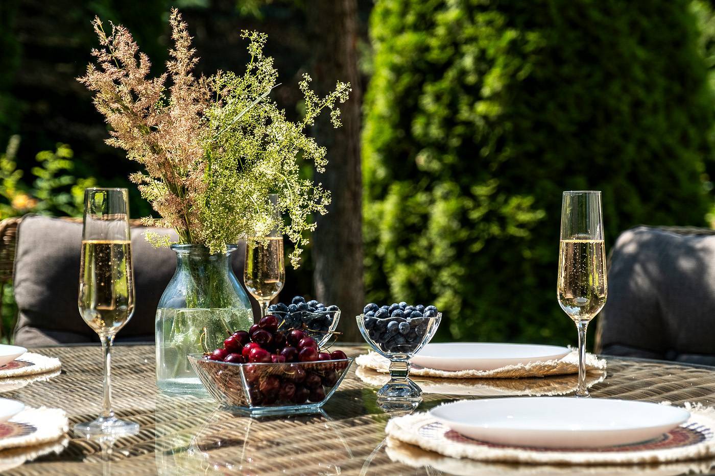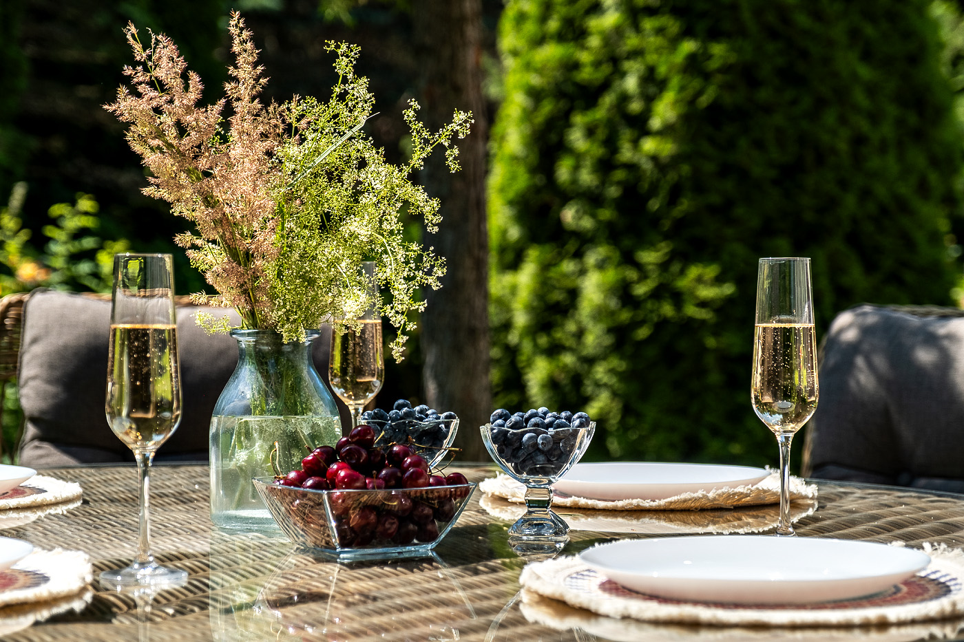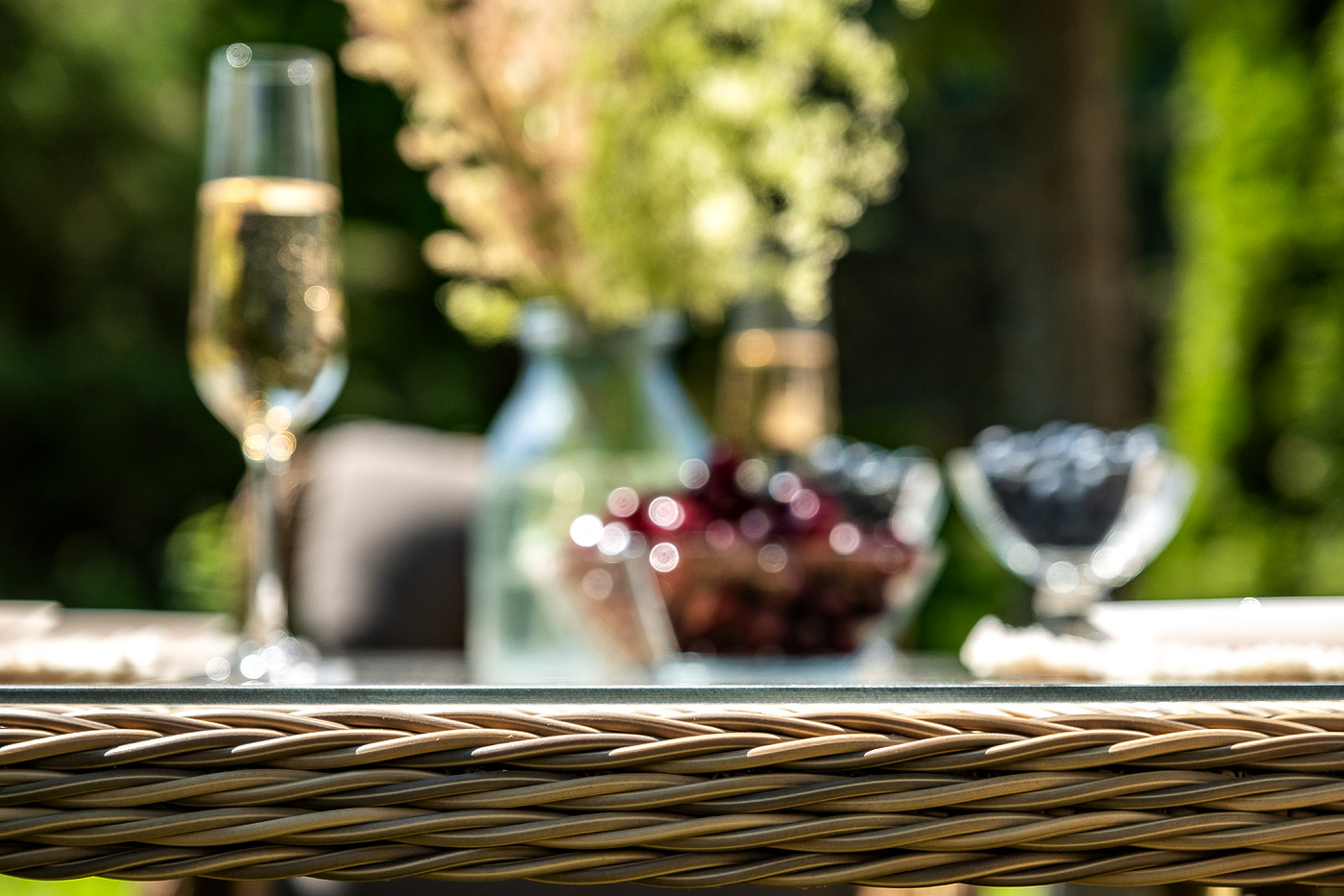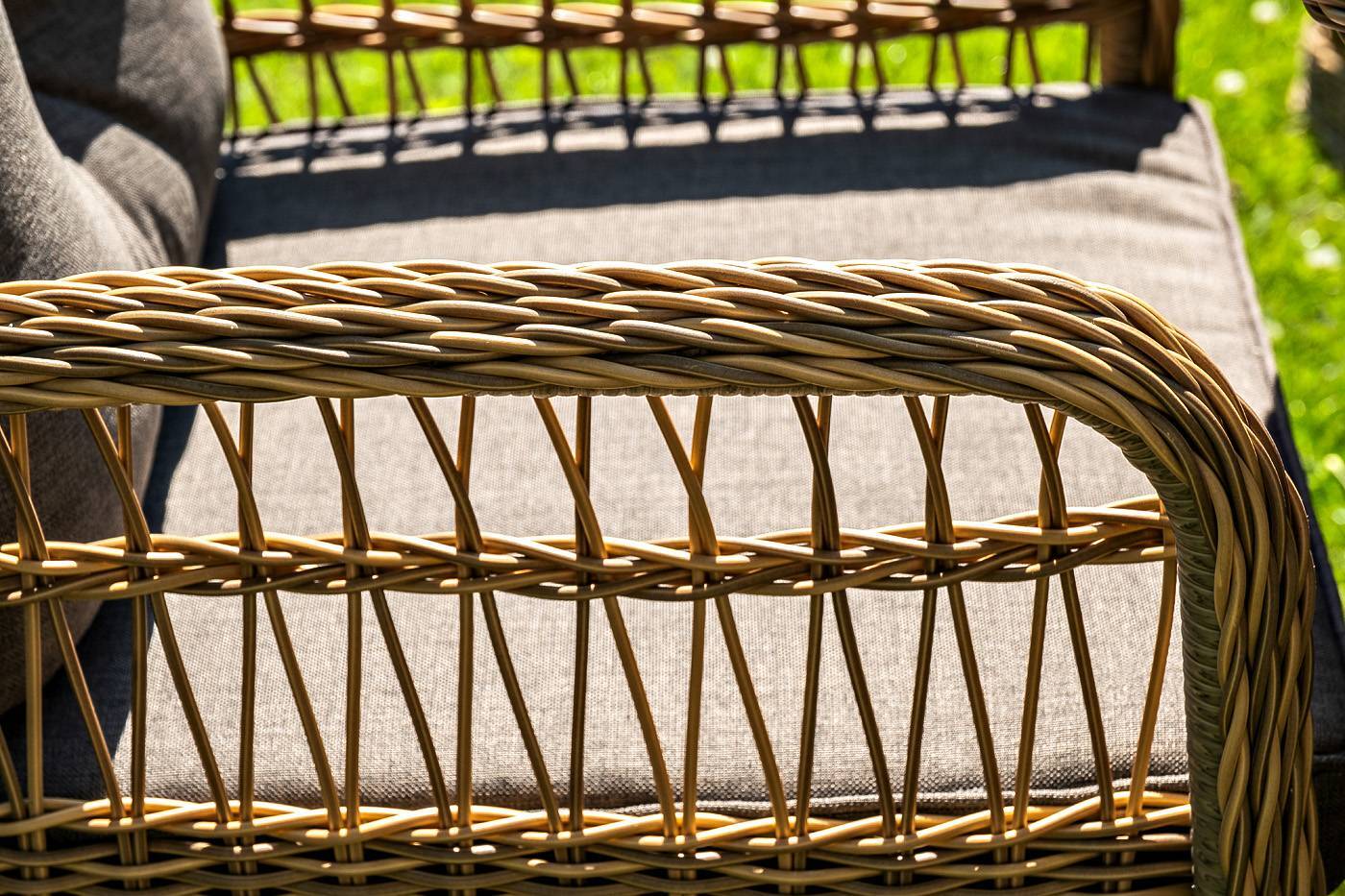Вся мебель изготовлена из долговечного и легкого алюминия, обтянутого синтетическим ротангом. На столе для удобства эксплуатации предусмотрена столешница из ударопрочного закаленного стекла 5 мм. Стулья укомплектованы подушками на сидениях и на спинках.