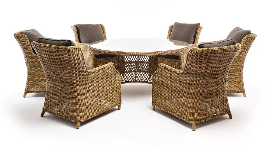 Обеденная группа на 6 персон «Эспрессо» из ротанга. В комплекте: большой круглый обеденный стол (1500×1500×750 мм.) и 6 кресел коллекции «Неаполь» (650×900×920 мм).
