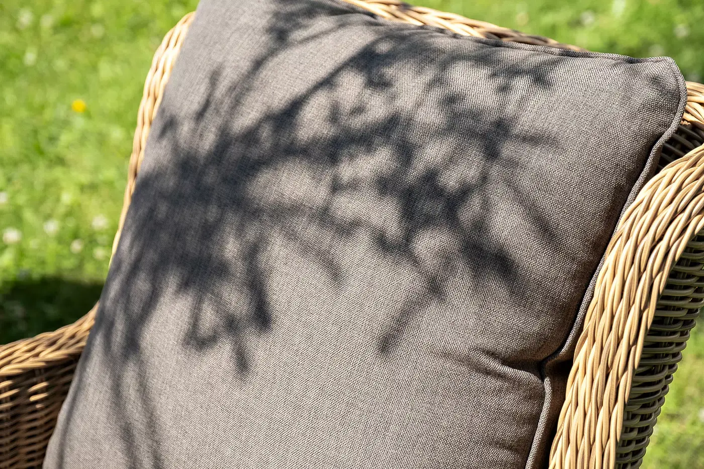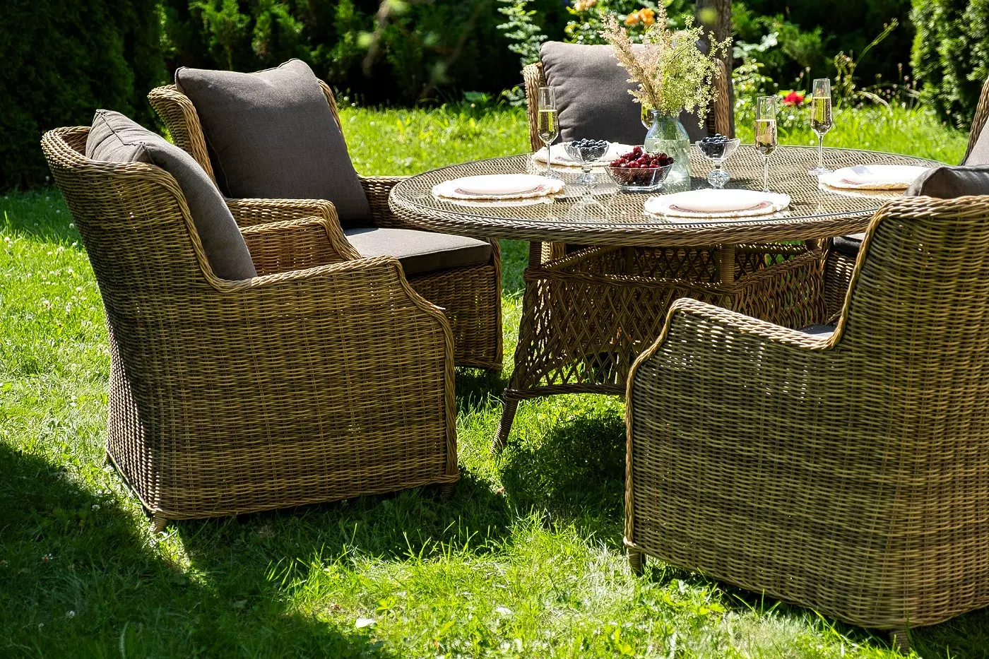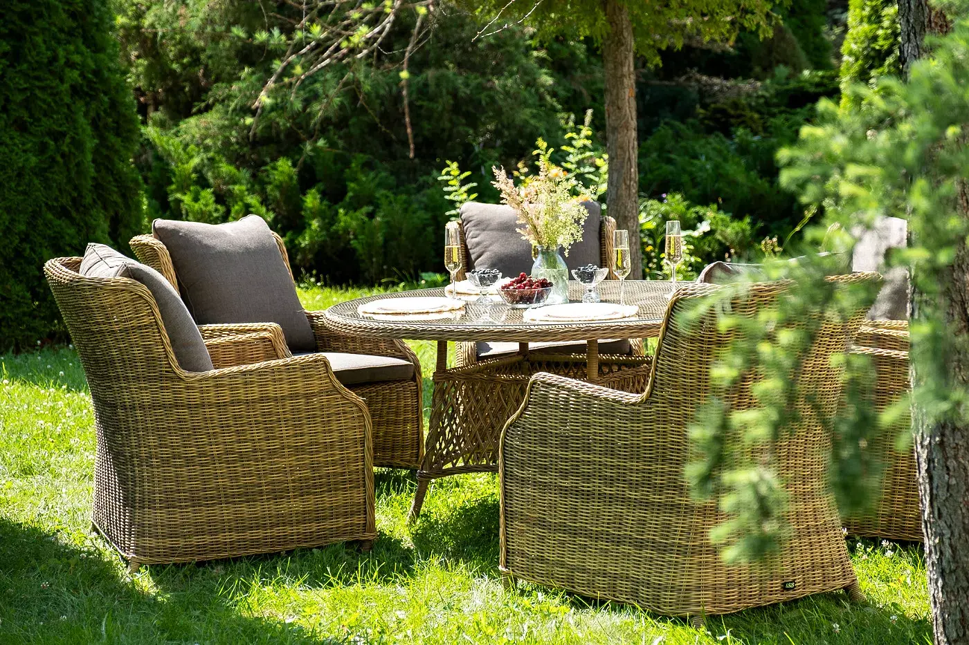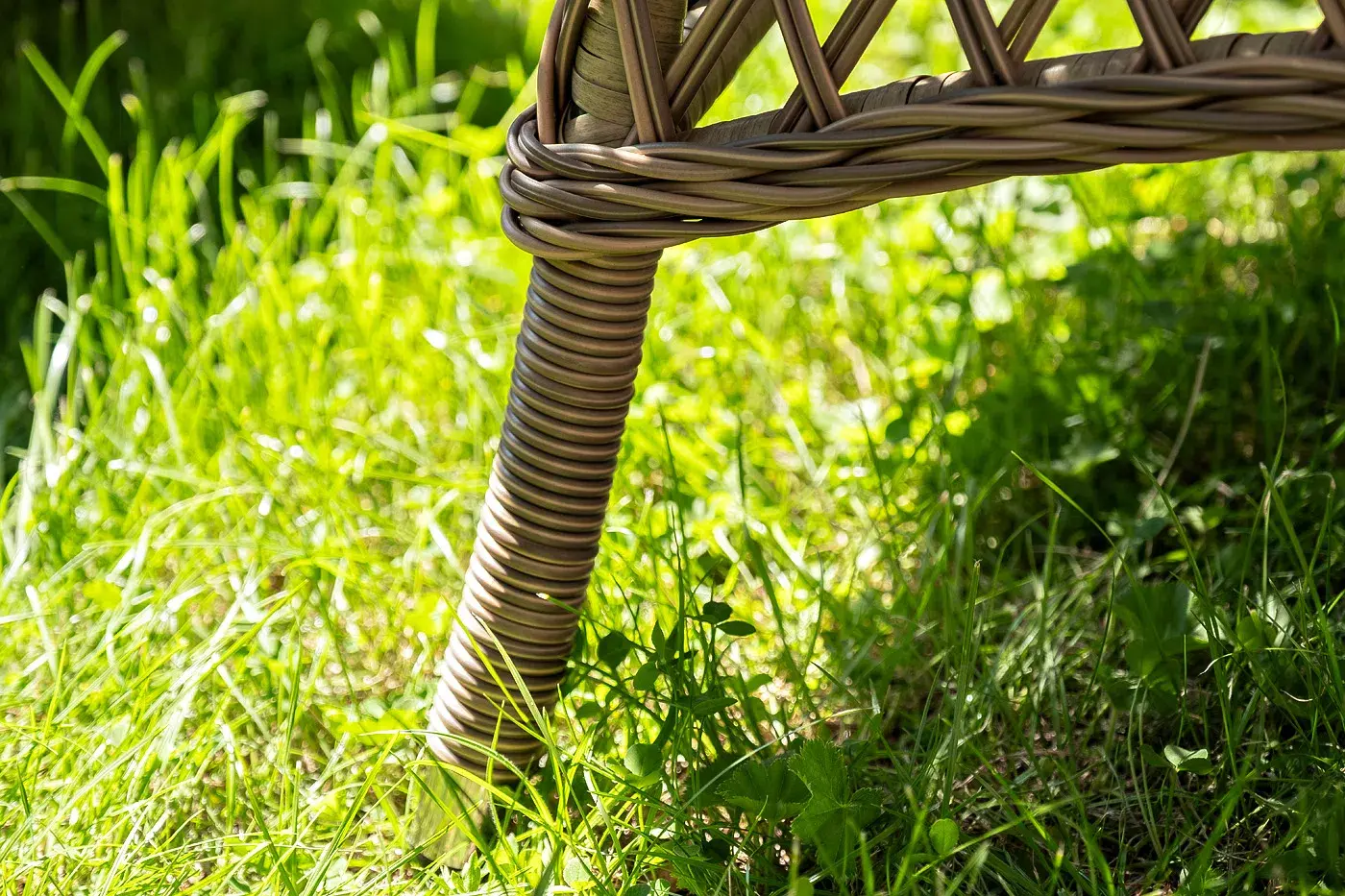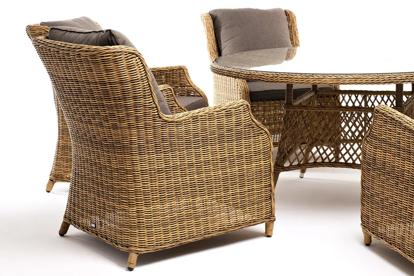 Вся мебель изготовлена из долговечного и легкого алюминия, обтянутого синтетическим ротангом. На столе для удобства эксплуатации предусмотрена столешница из ударопрочного закаленного стекла 5 мм. Стулья укомплектованы подушками на сидениях и на спинках.
