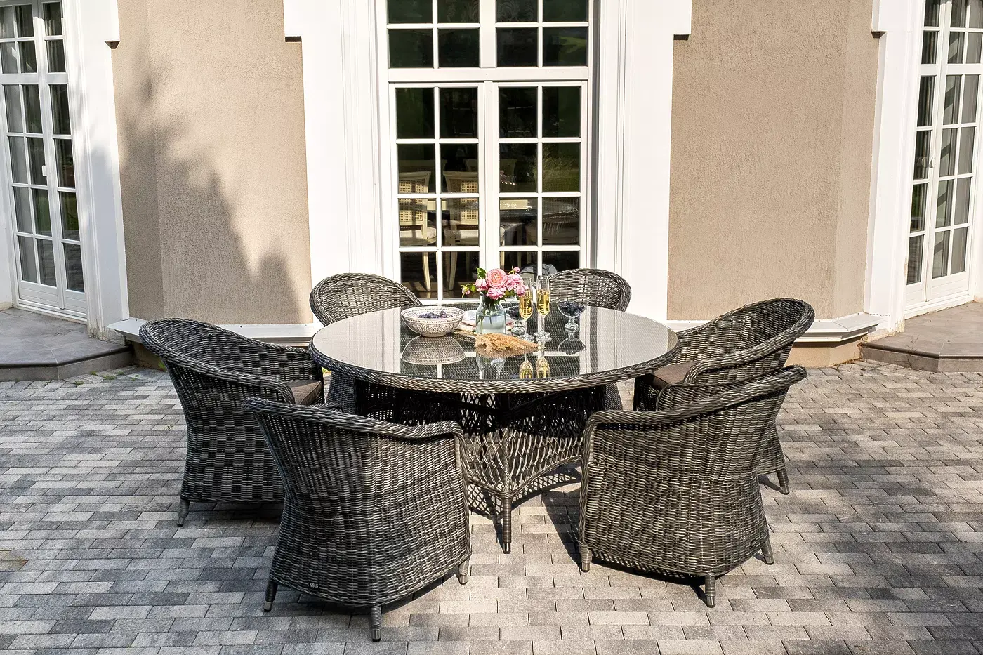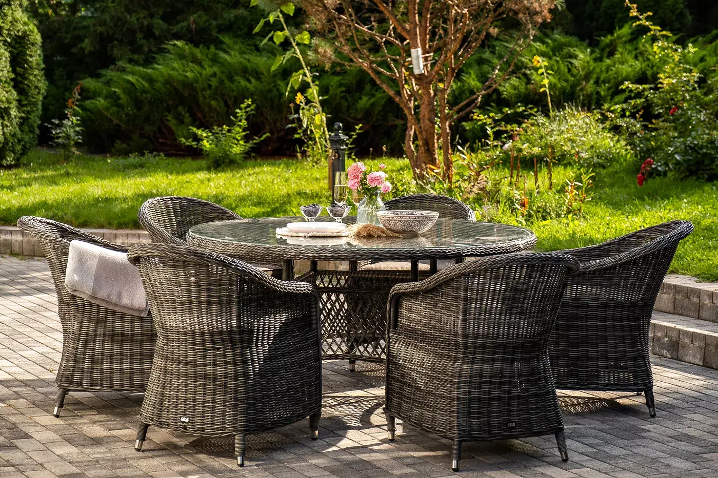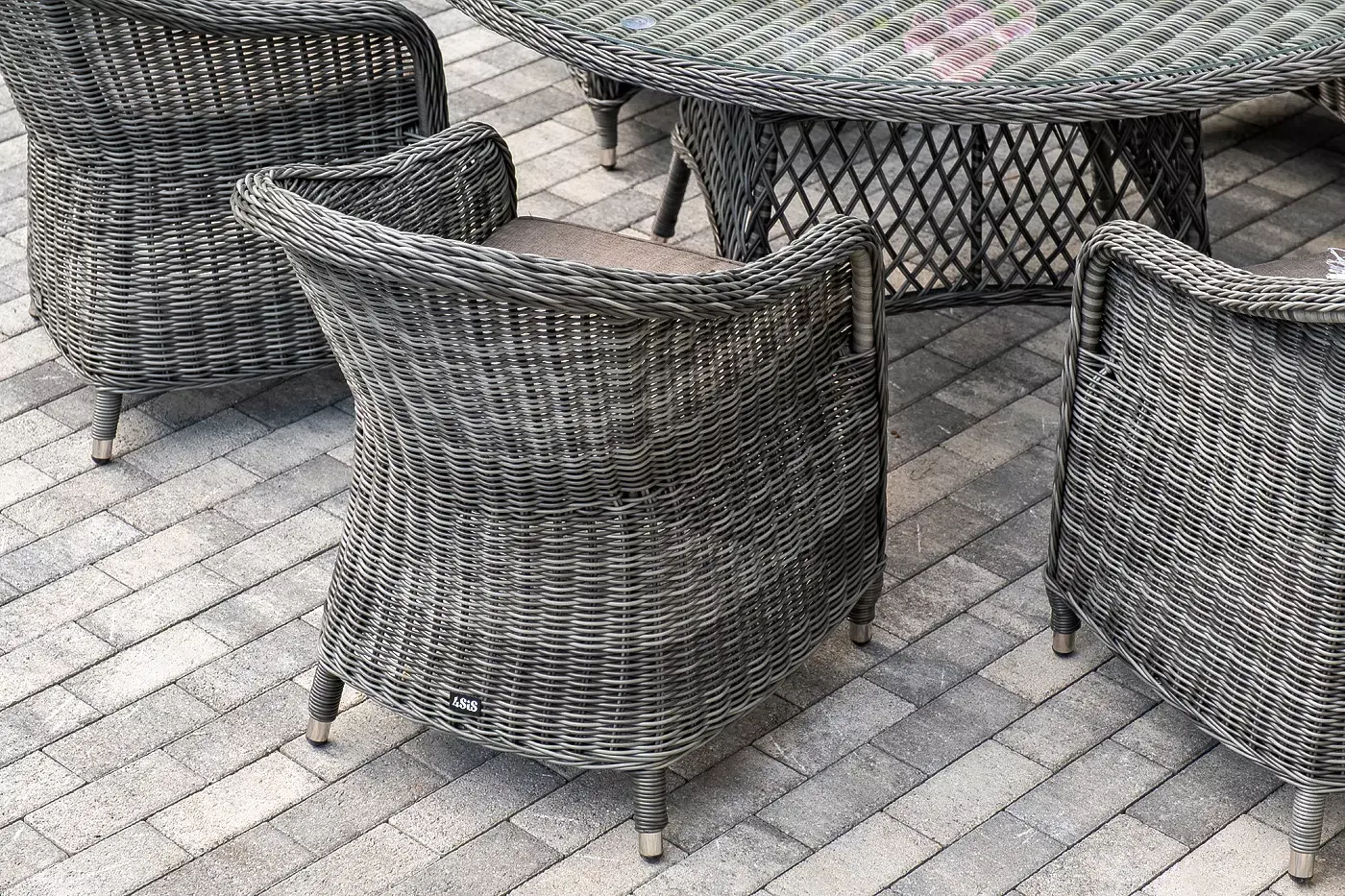 Вся мебель изготовлена из долговечного и легкого алюминия, обтянутого синтетическим ротангом. На столе для удобства эксплуатации предусмотрена столешница из ударопрочного закаленного стекла 5 мм. Стулья укомплектованы подушками на сидениях.