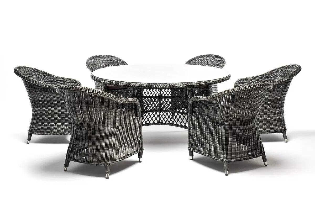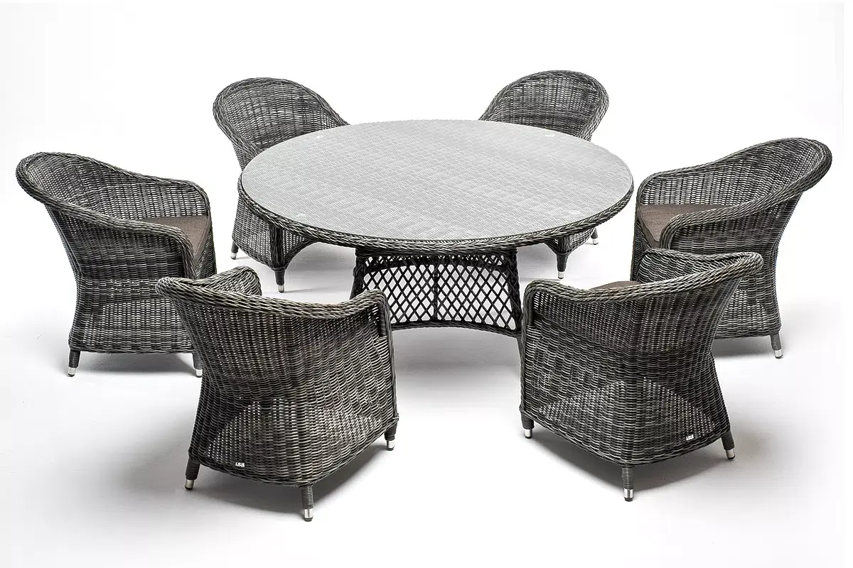 Вся мебель изготовлена из долговечного и легкого алюминия, обтянутого синтетическим ротангом. На столе для удобства эксплуатации предусмотрена столешница из ударопрочного закаленного стекла 5 мм. Стулья укомплектованы подушками на сидениях.