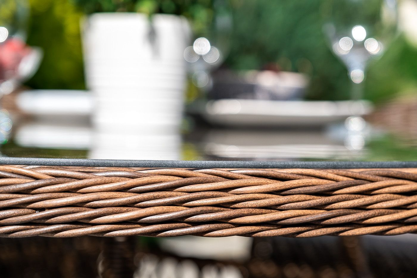 Вся мебель изготовлена из долговечного и легкого алюминия, обтянутого синтетическим ротангом. На столе для удобства эксплуатации предусмотрена столешница из ударопрочного закаленного стекла 5 мм. Стулья укомплектованы подушками на сидениях.