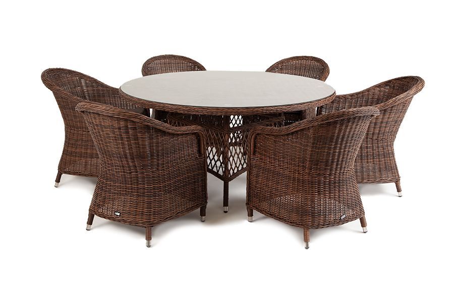В комплект входит круглый обеденный стол «Эспрессо» (1500×1500×750 мм) с ударопрочной стеклянной столешницей и 6 кресел коллекции «Равенна» 570×680×810 мм.