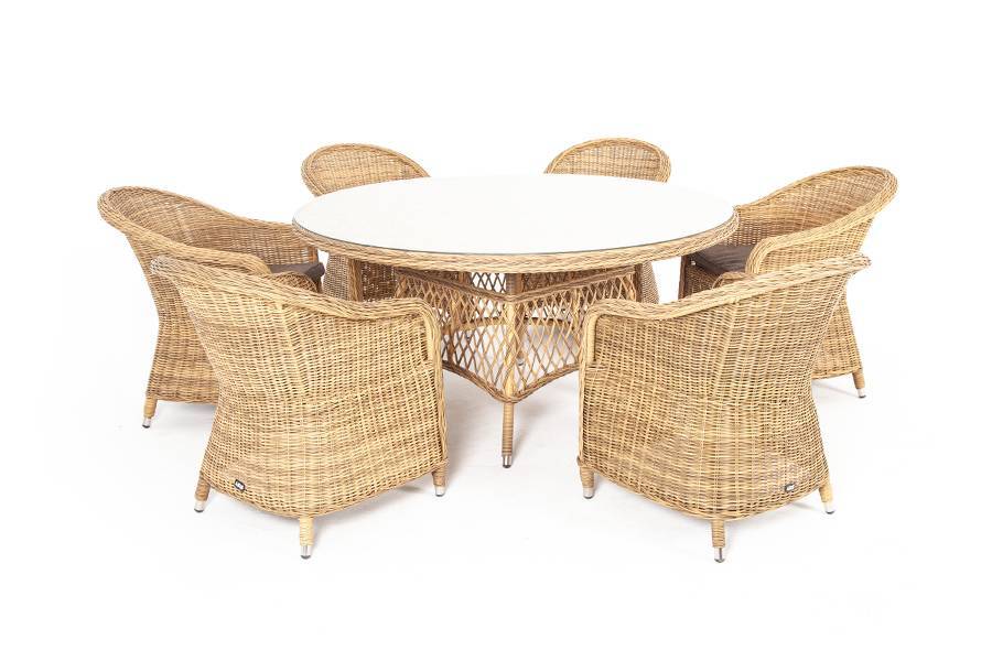 Вся мебель изготовлена из долговечного и легкого алюминия, обтянутого синтетическим ротангом. На столе для удобства эксплуатации предусмотрена столешница из ударопрочного закаленного стекла 5 мм. Стулья укомплектованы подушками на сидениях.